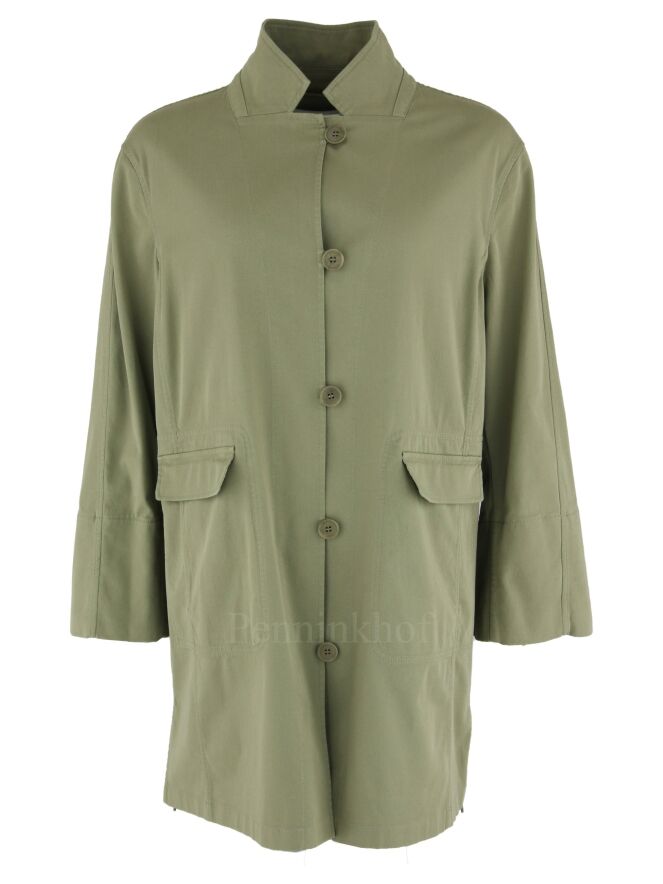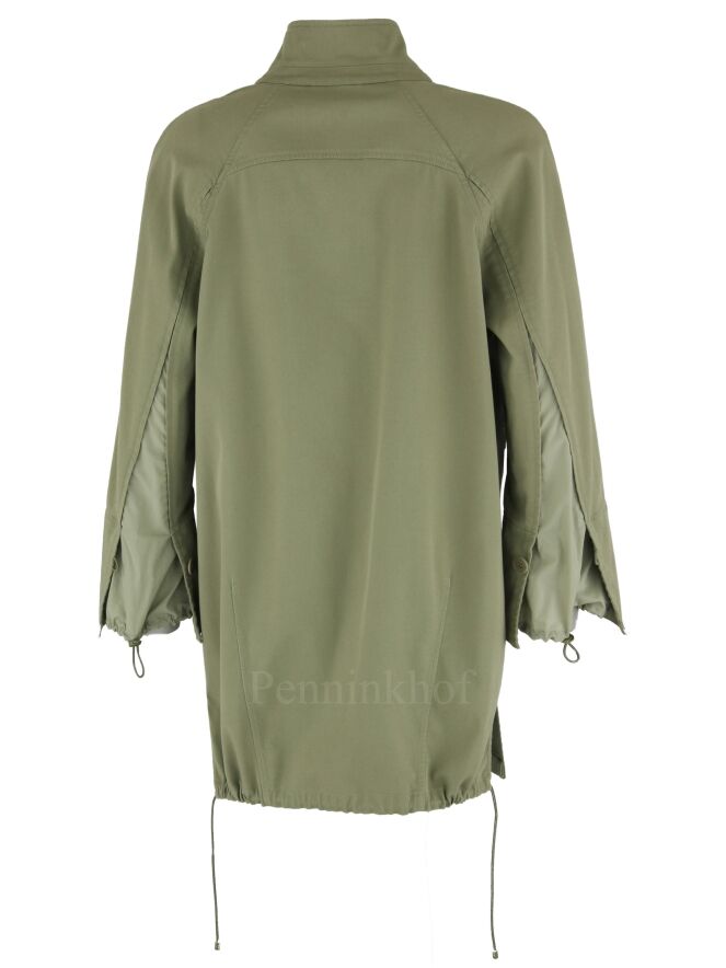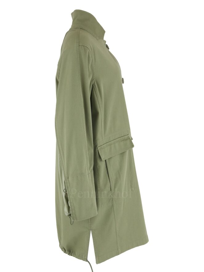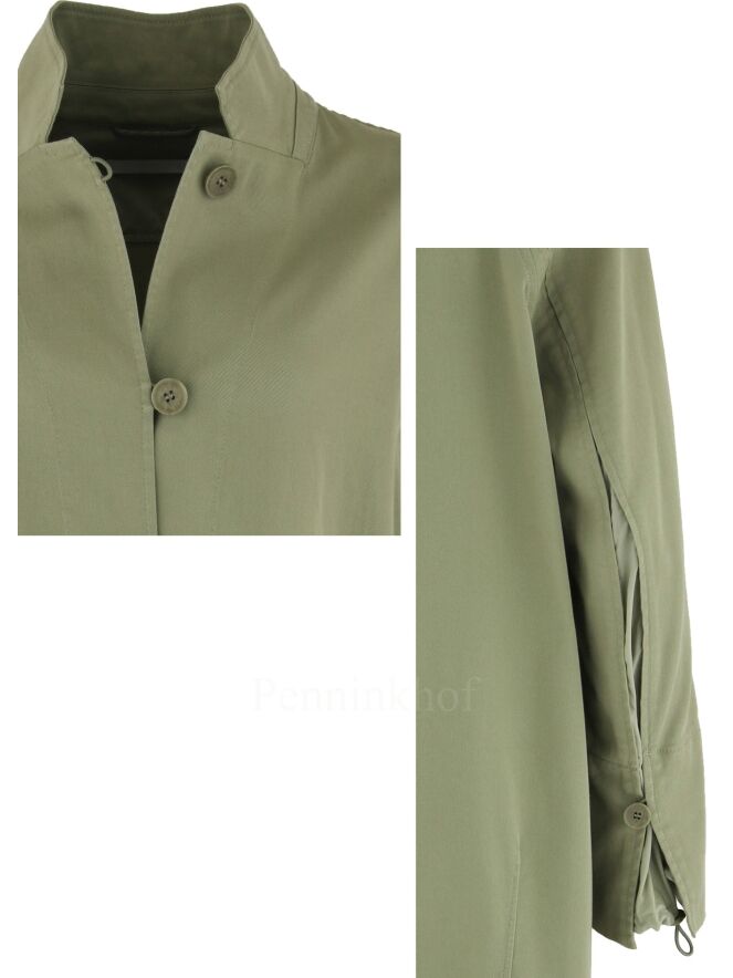 Veste mi-longue de la marque Annette Görtz, de couleur vert olive doux. Elle ferme à l'aide de cinq boutons. De profondes fentes sont présentes sur les côtés. Le pan arrière est équipé d'un cordon coulissant inséré dans l'ourlet. L'arrière des manches présente une ouverture s'élargissant jusqu'en bas pour laisser apparaître un tissu à cordon de resserrage. Lavage à 30 degrés.