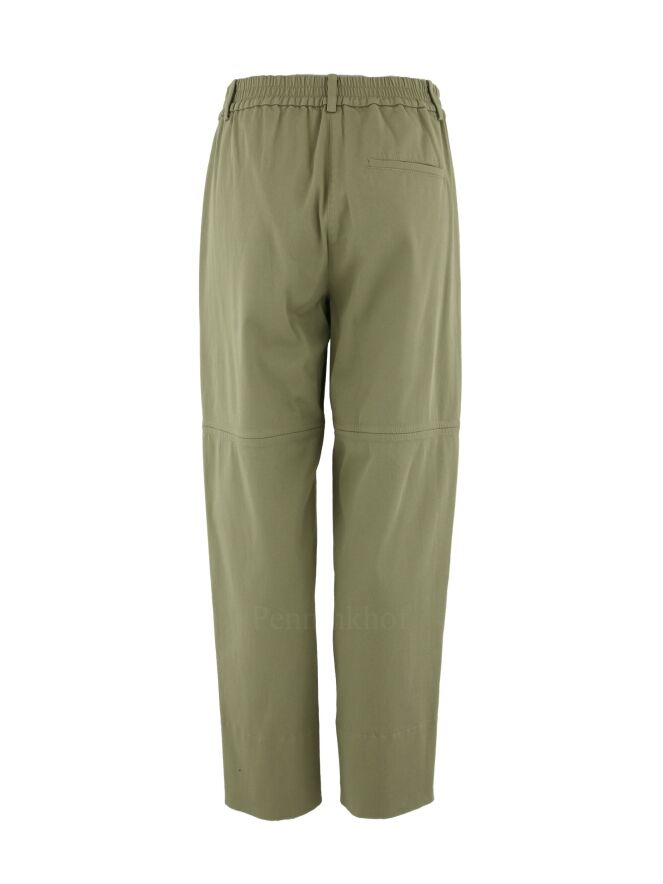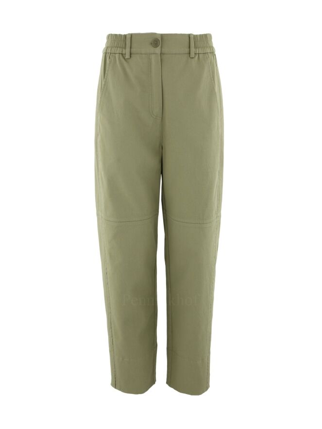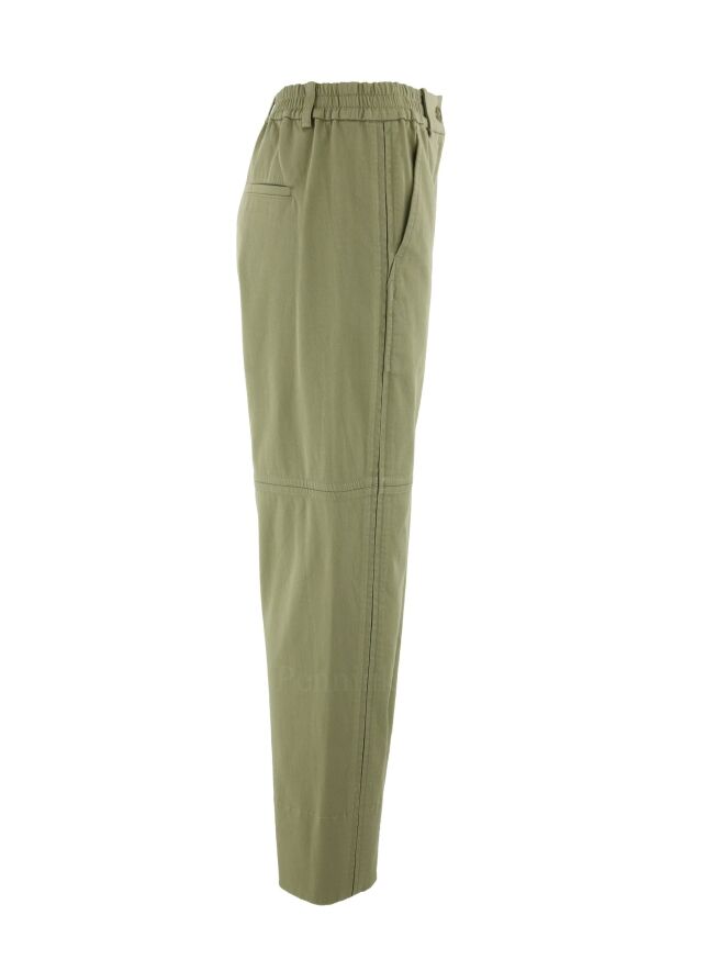 Pantalon large de la marque Annette Görtz, de couleur vert olive clair. La taille est dotée d'une bande élastique créant des fronces à l'arrière. Le pantalon est équipé de poches latérales et présente une couture horizontale au-dessus des genoux. Lavage à 30 degrés.
