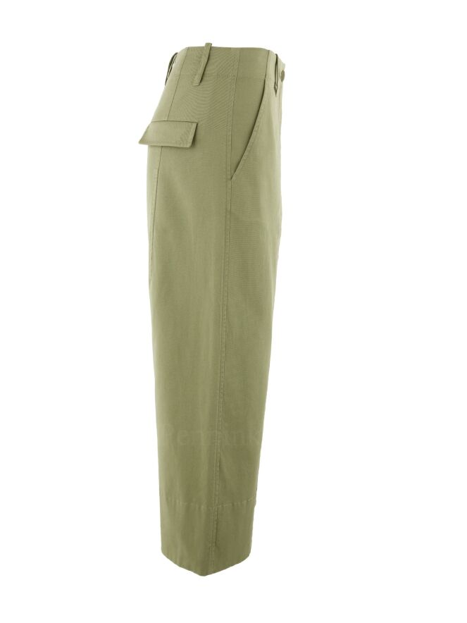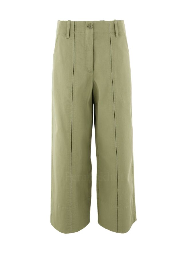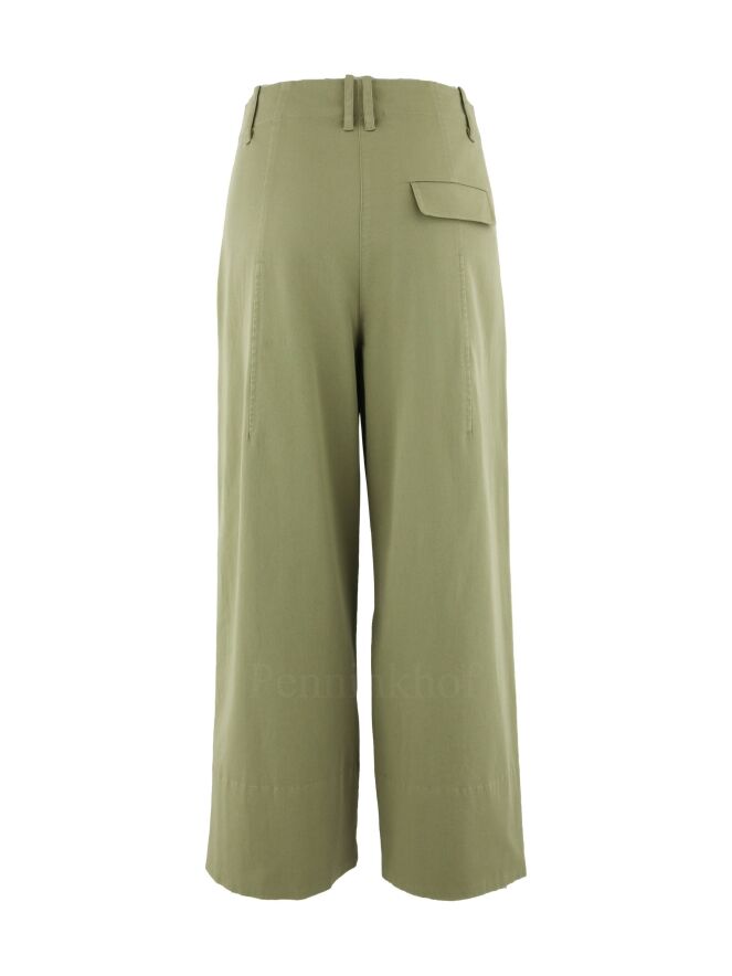 Pantalon large de la marque Annette Görtz, de couleur vert olive clair. Le pantalon est équipé de poches latérales et d'une poche arrière à rabat. Les jambes sont ornées d'une fine pince courant sur l'avant. Lavage à 30 degrés.