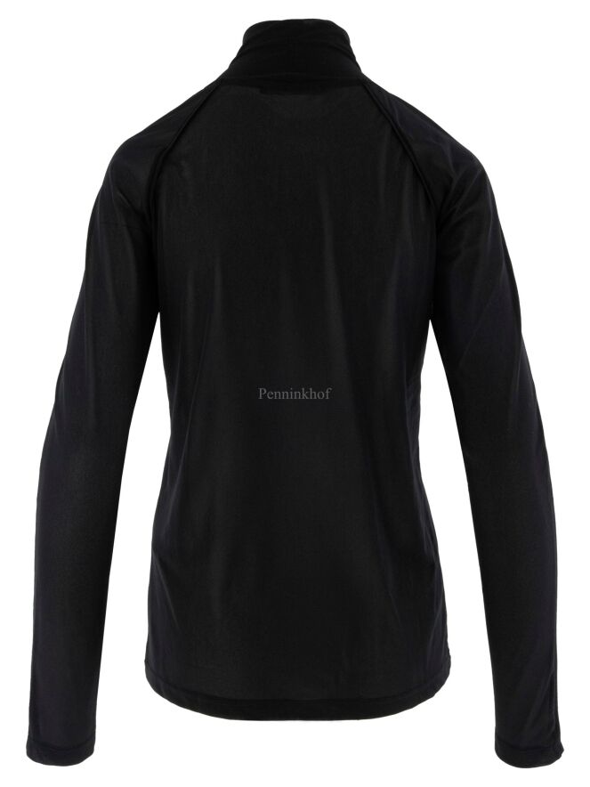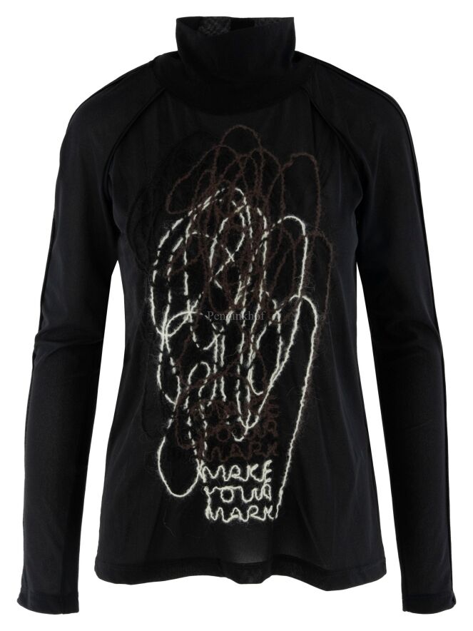 Une shirt d'Annette Görtz en noir avec un motif de surpiqûres en blanc crème et marron moka. La T - shirt a un col tombant dans l'encolure et peut être lavée à 30 degrés.