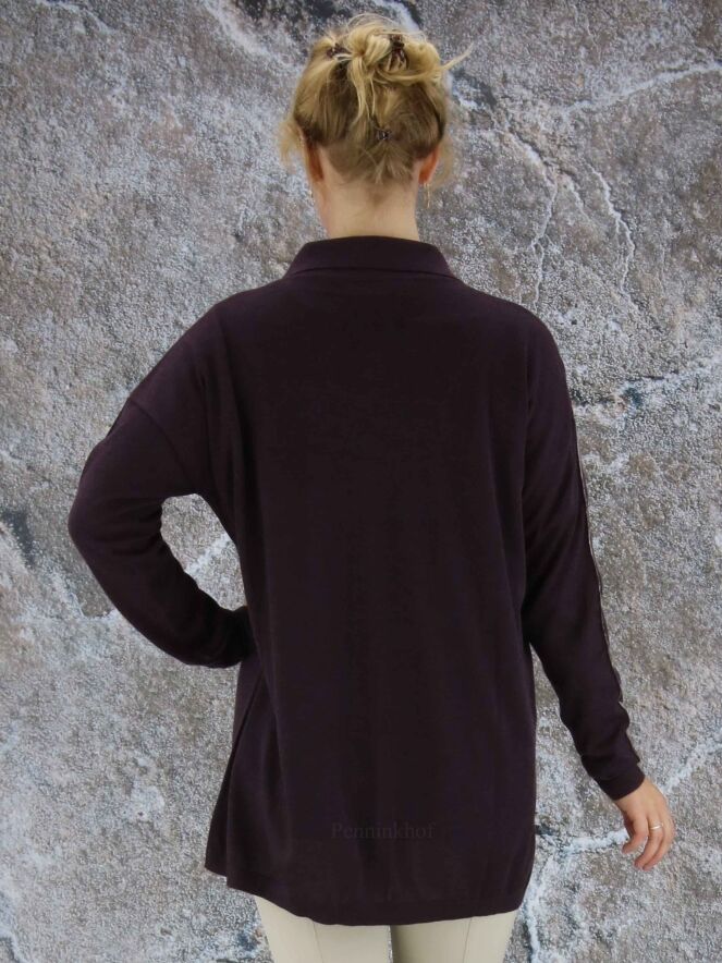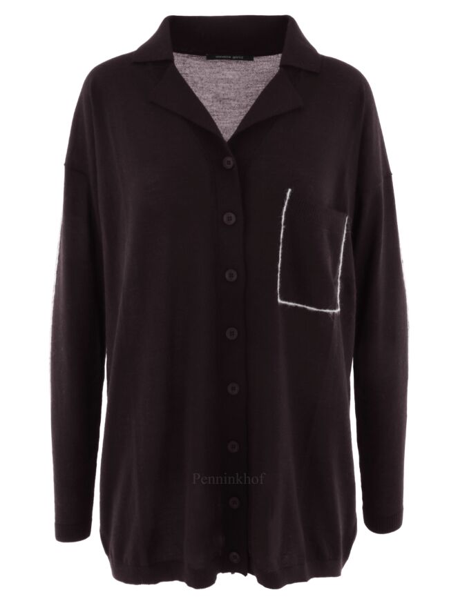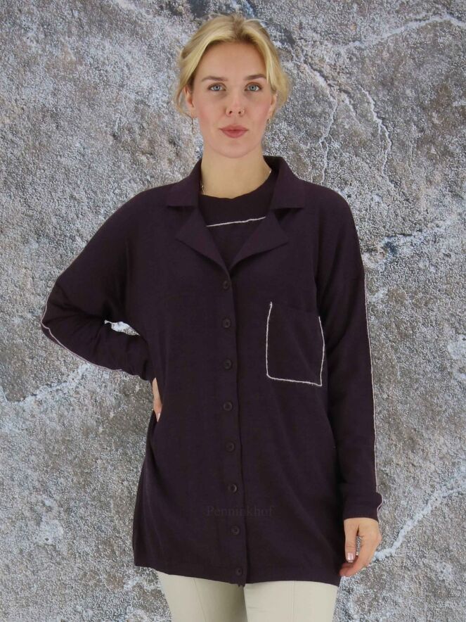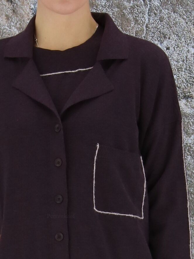 Luxueux cardigan de la marque Annette Görtz, de couleur aubergine. Un passepoil sable orne le haut de la manche et les bords de la poche poitrine. Le cardigan est doté d'un col à revers prolongé par une longue patte de boutonnage. Lavage à la main.