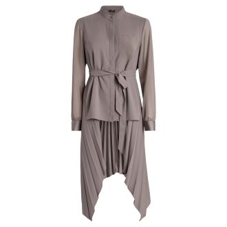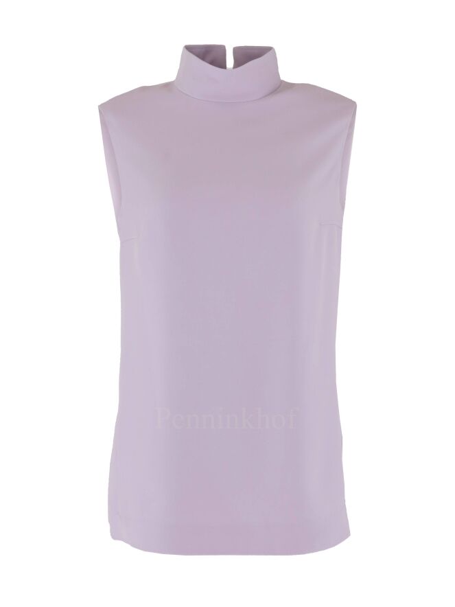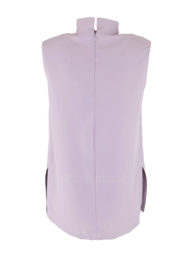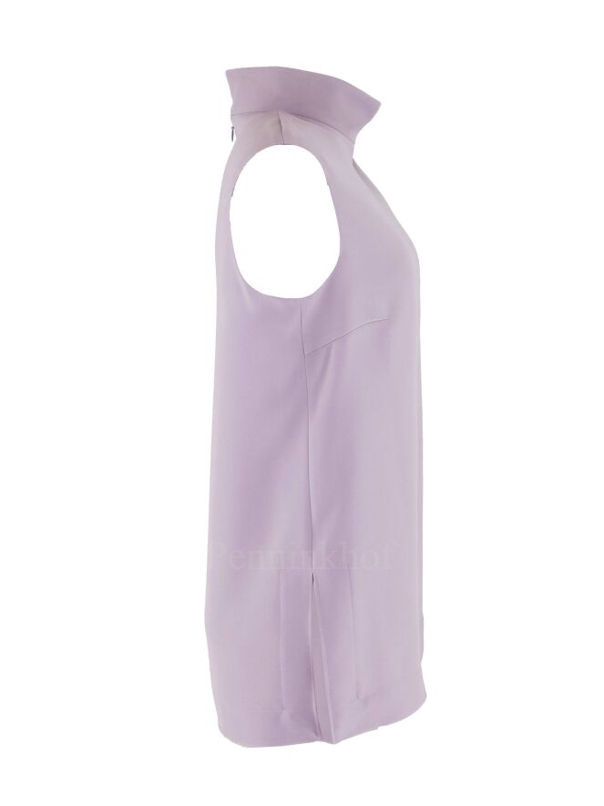 Top sans manches de la marque Annette Görtz, de couleur lilas. Il présente un col montant avec une fente au dos de laquelle descend la fermeture Eclair du cou jusqu'en dessous des omoplates. Le bas des côtés sont ouverts par des fentes. Le haut est partiellement doublé. Lavage à 30 degrés.
