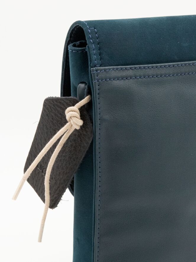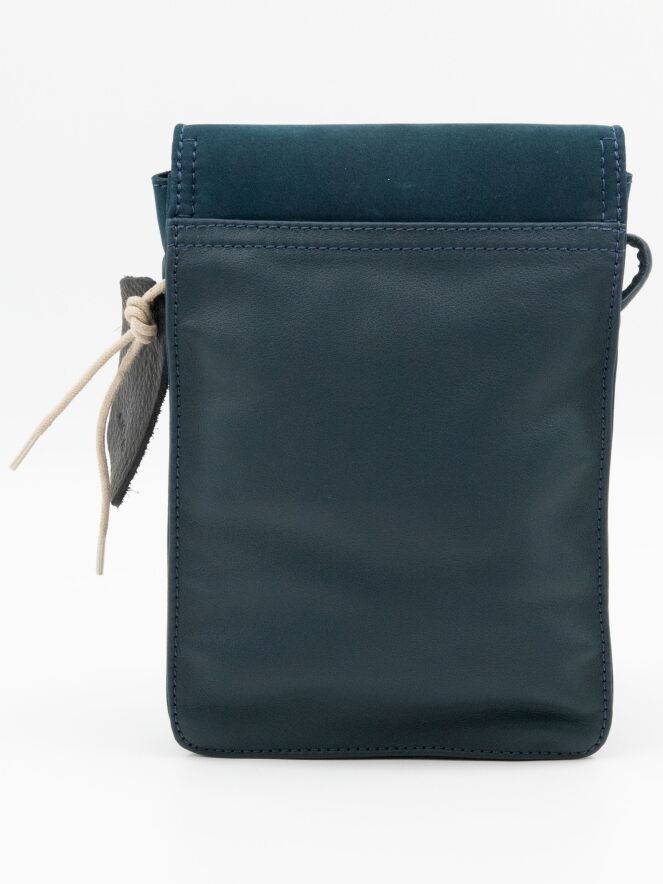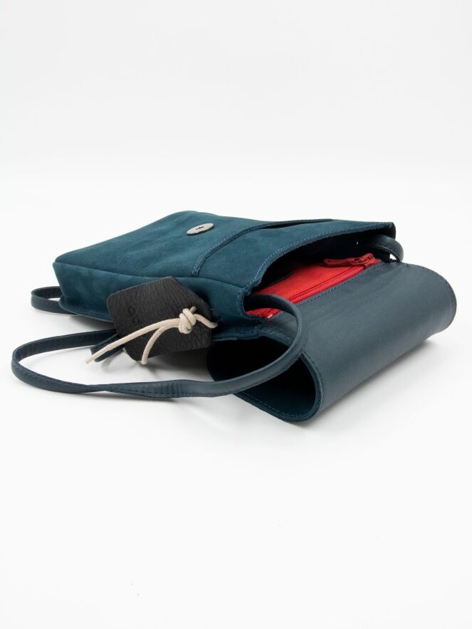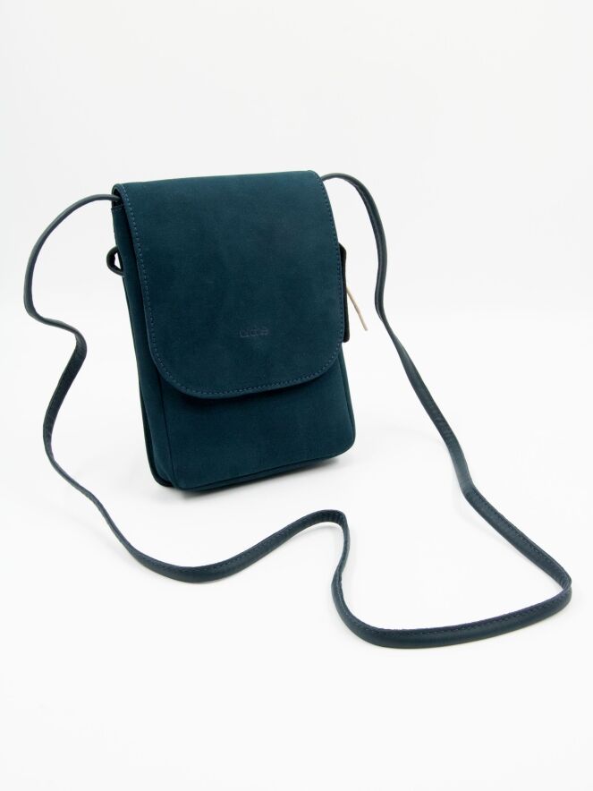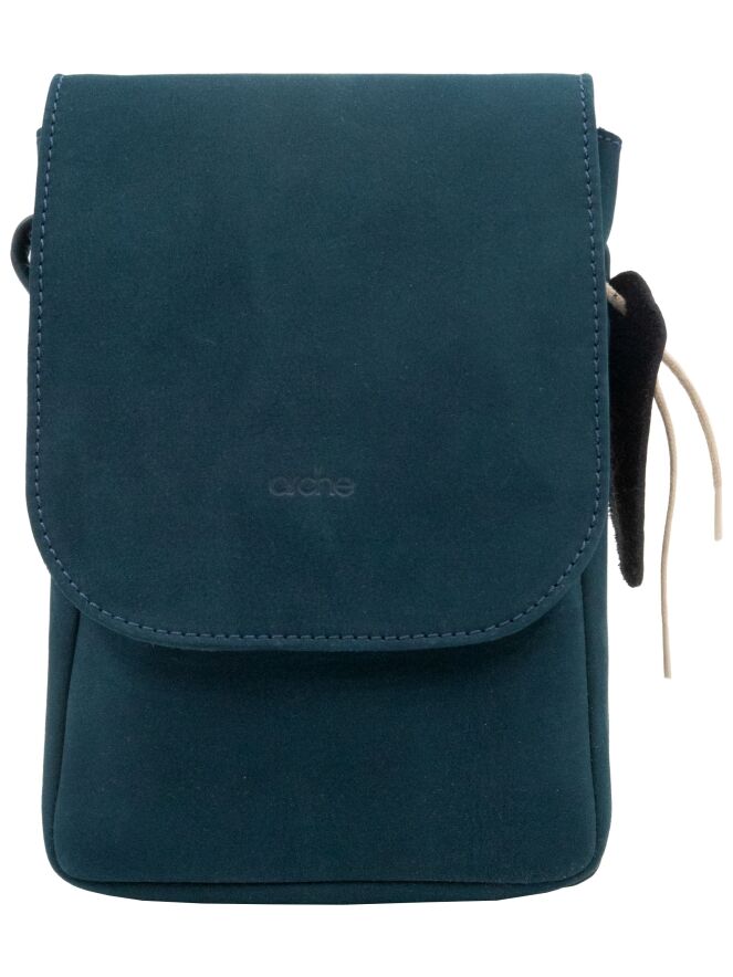 Sac de la marque Arche en daim bleu pétrole. Le sac est doté d'une longue bandoulière et d’une petite poche zippée à l’intérieur.