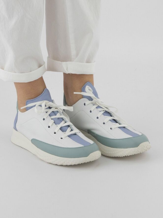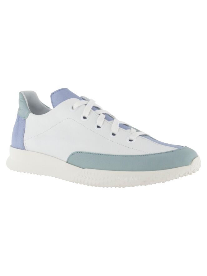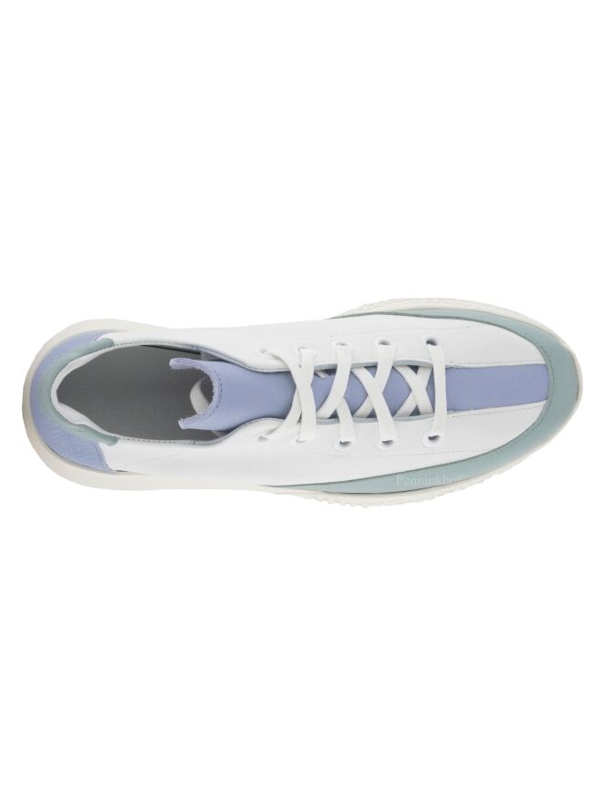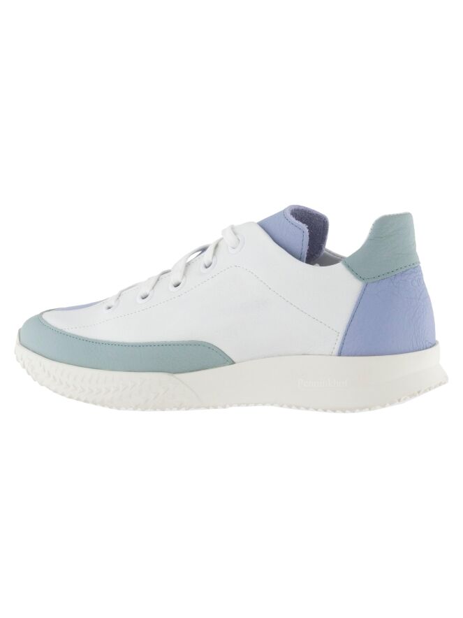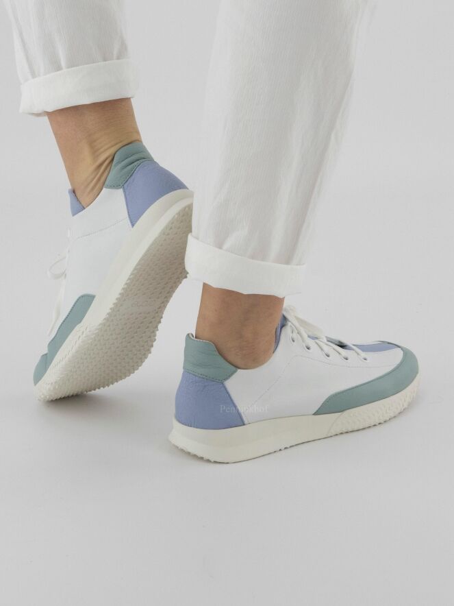 Sneaker à lacets blancs de la marque Arche, en cuir de couleur blanche. La langue, visible jusqu'au nez, est bleu pastel. Une bande de cuir bleu gris entoure le nez de la chaussure. Deux empiècements cousus bleu pastel et bleu gris habillent l'arrière. Intérieur doublé de cuir.