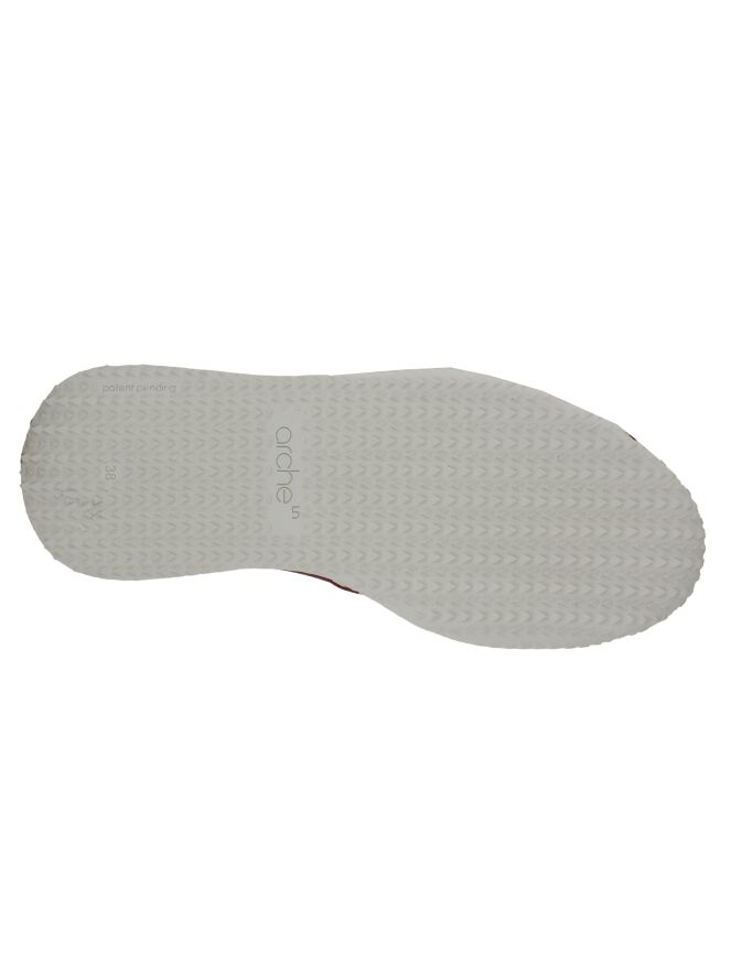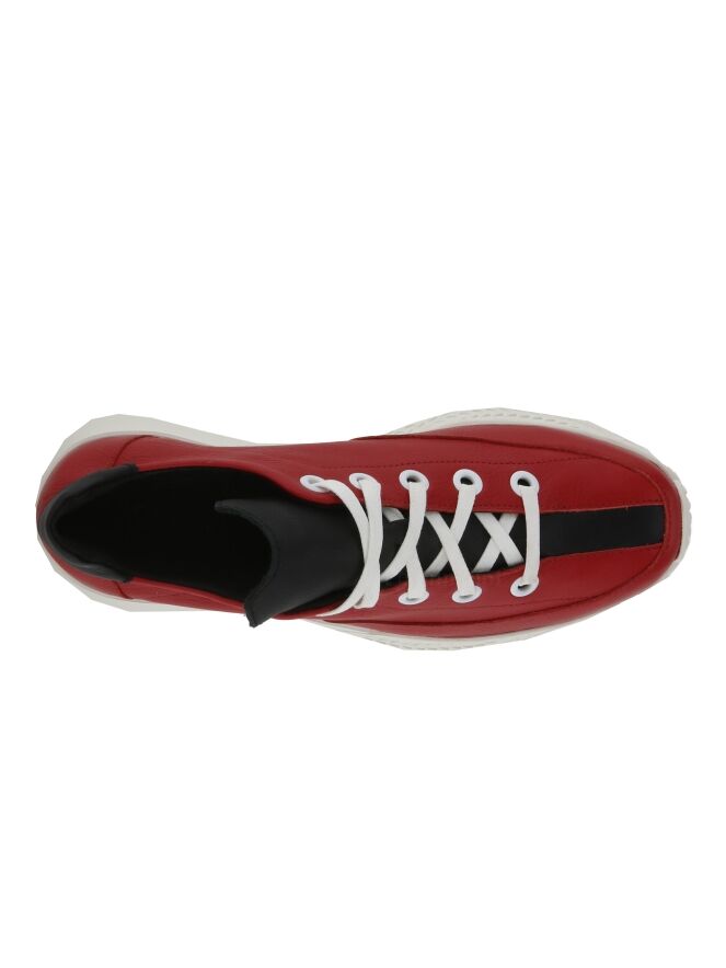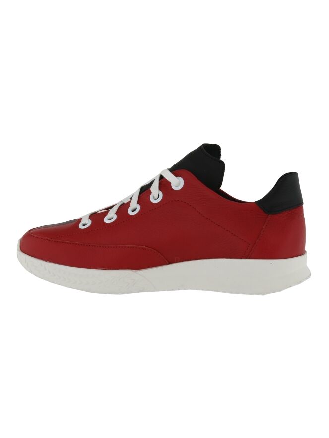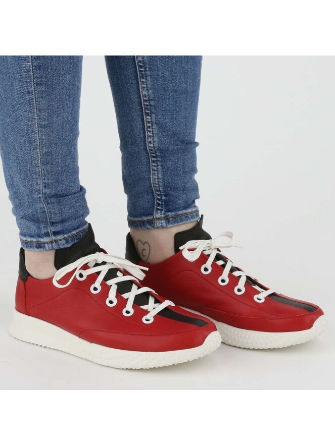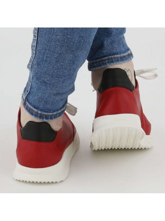 Sneaker à lacets blancs de la marque Arche, en cuir de couleur rouge. La langue, visible jusqu'au nez, est totalement noire. Un empiècement en cuir noir habille le haut du talon. La semelle latex est de couleur blanche. Intérieur doublé de cuir.