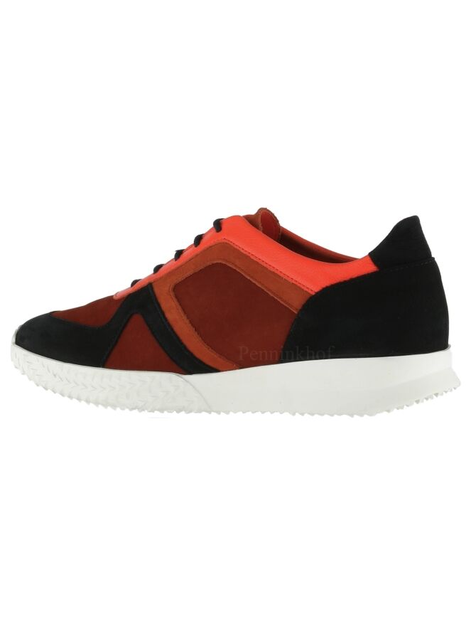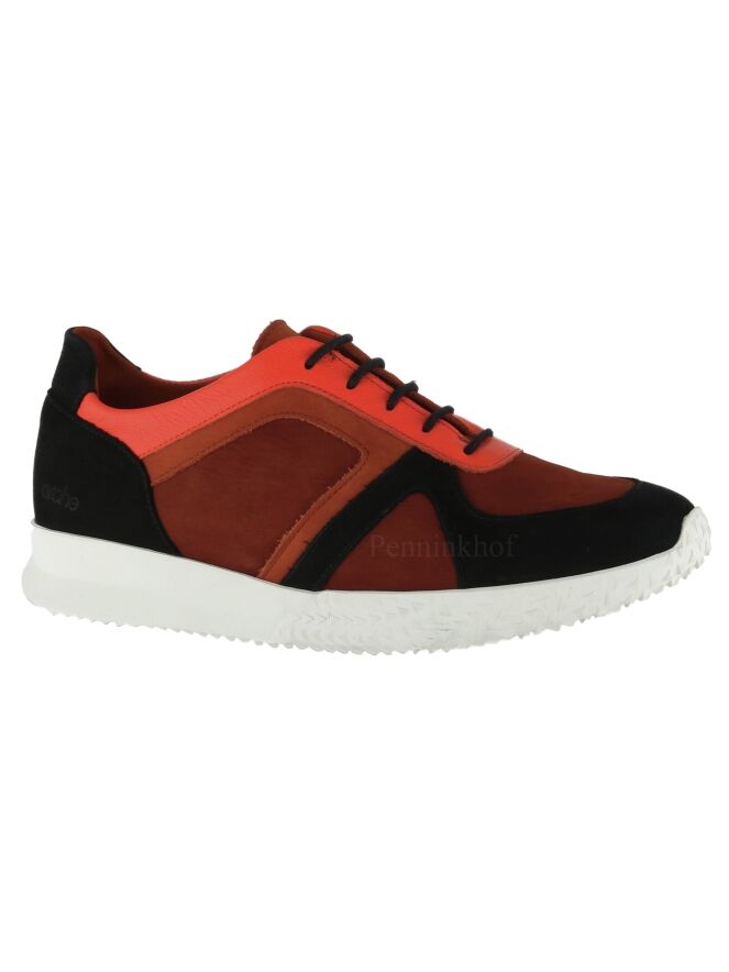 Chaussure de sport de la marque Arche, en nubuck de couleur rouge, orange et rouille. Le nez et le talon sont en daim nubuck de couleur noire et le lacet est bordé d'un cuir noir mat. Intérieur non doublé.