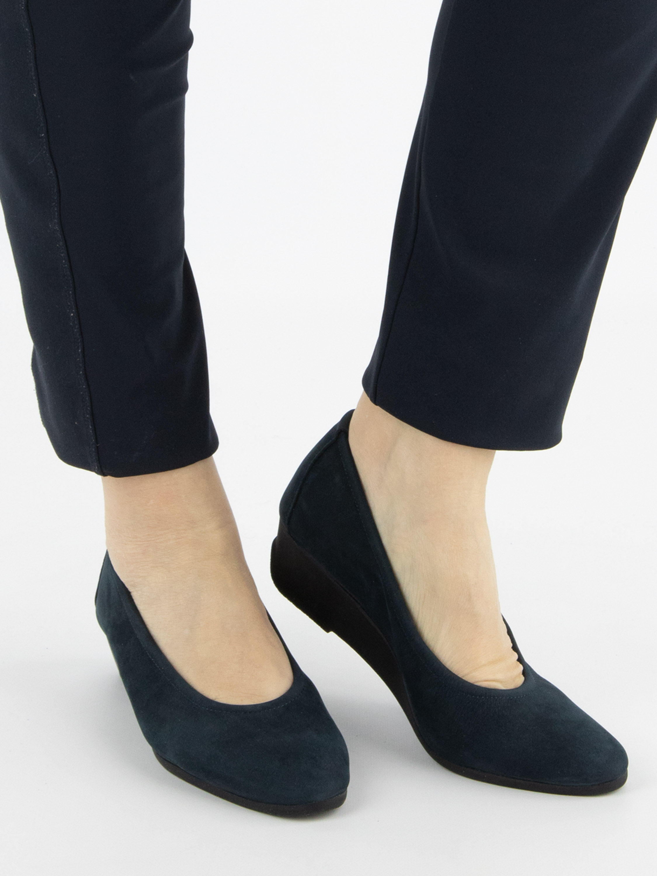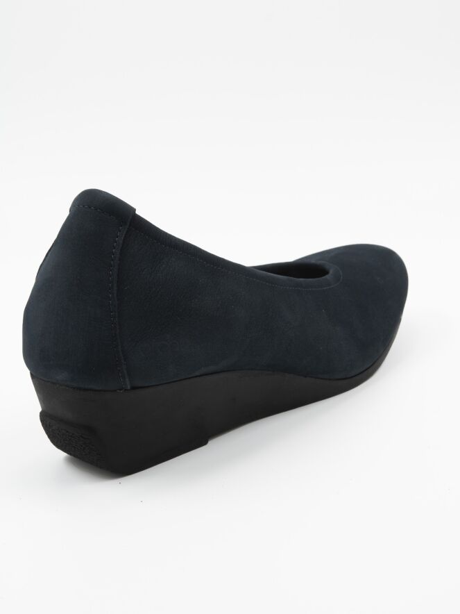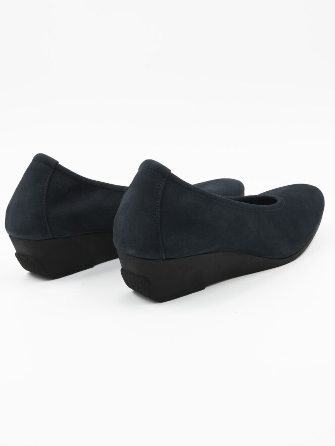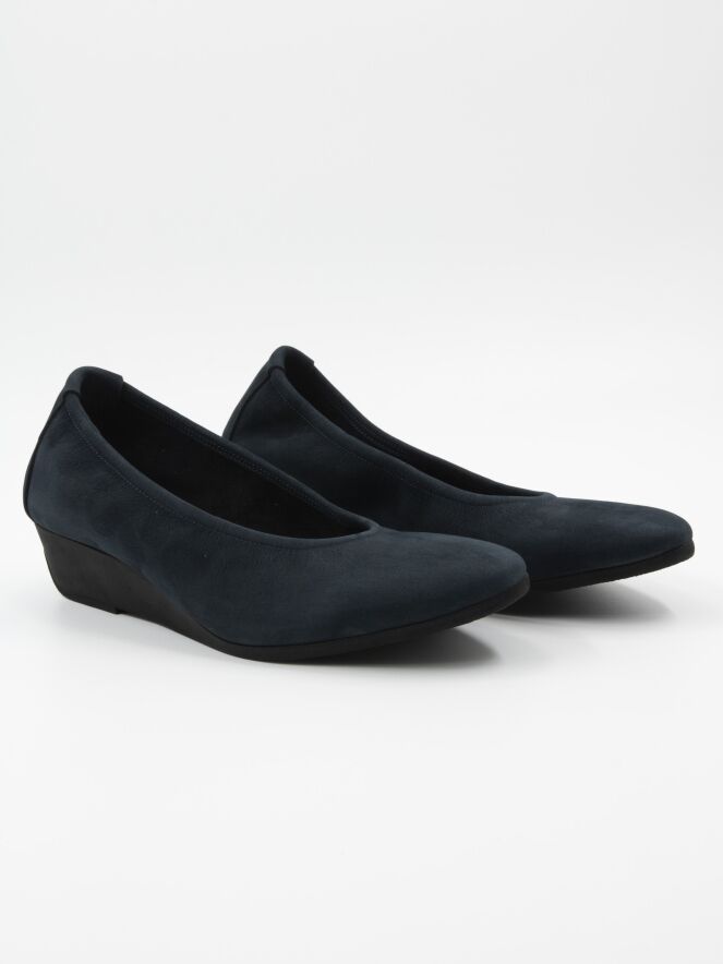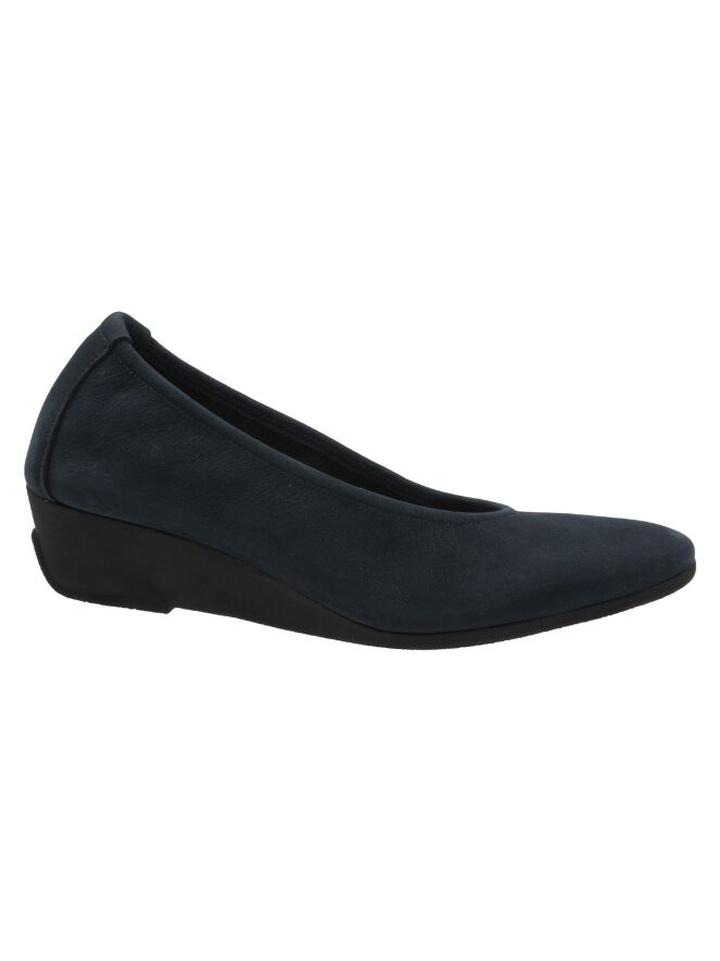Une chaussure plate de la marque Arche dans un coloris bleu marine. La chaussure plate est dotée d'un talon compensé en latex et d'un bout étroit. L'intérieur n'est pas doublé.
