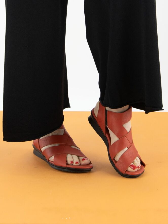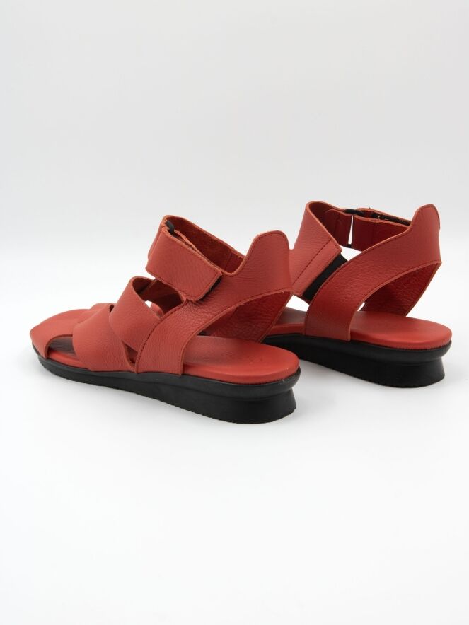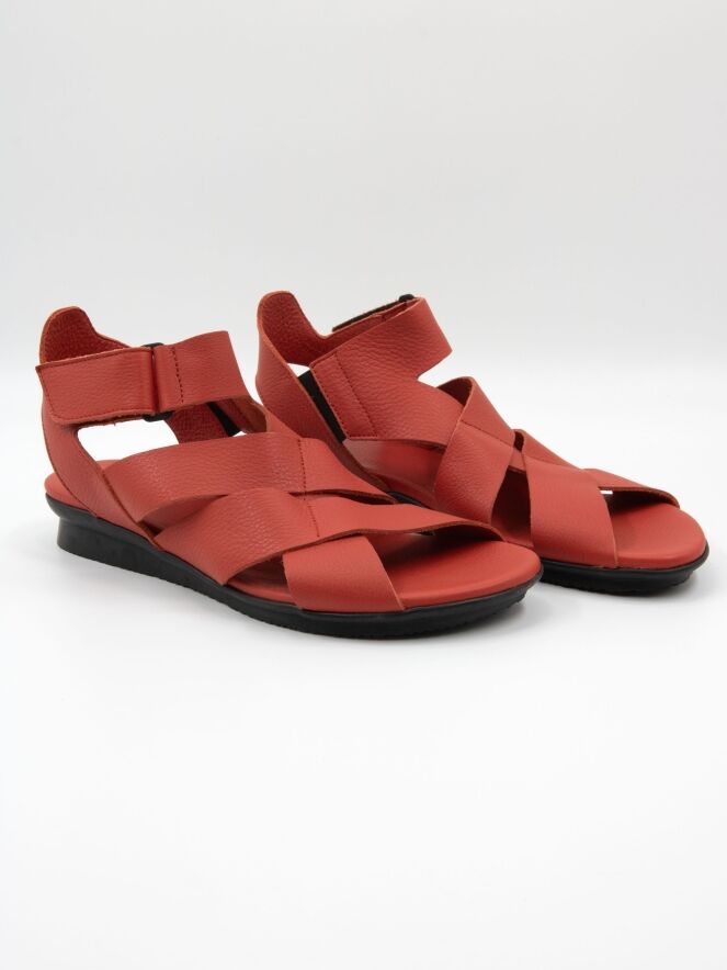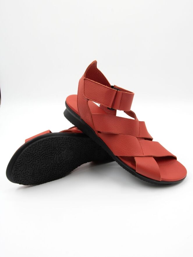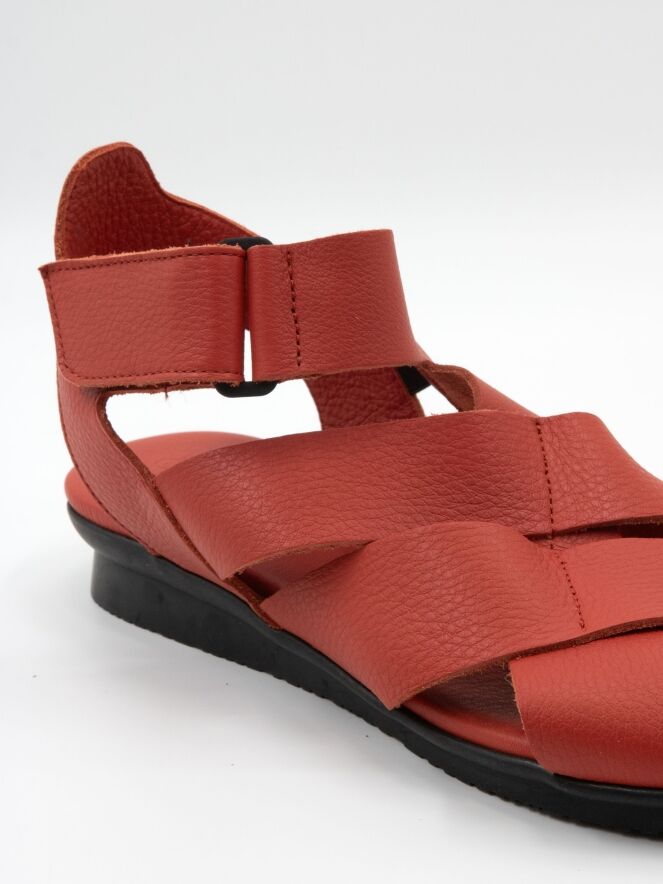 Une sandale de Arche en rouge. Le cuir est croisé sur l’avant-pied et la bride arrière est réglable avec un scratch. La semelle intérieure est réalisée dans le même cuir que la sandale.