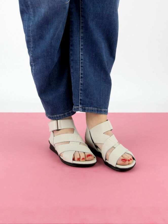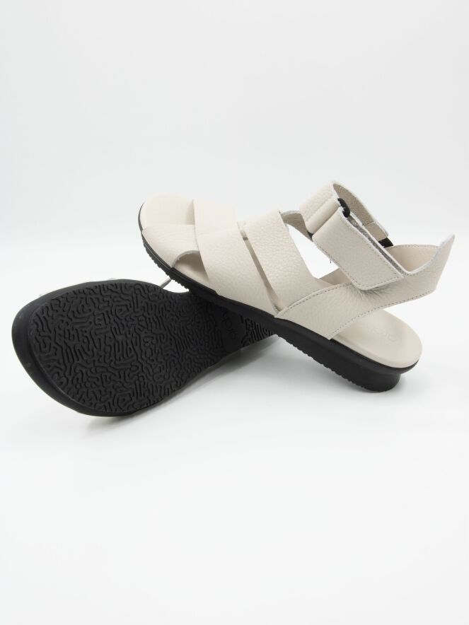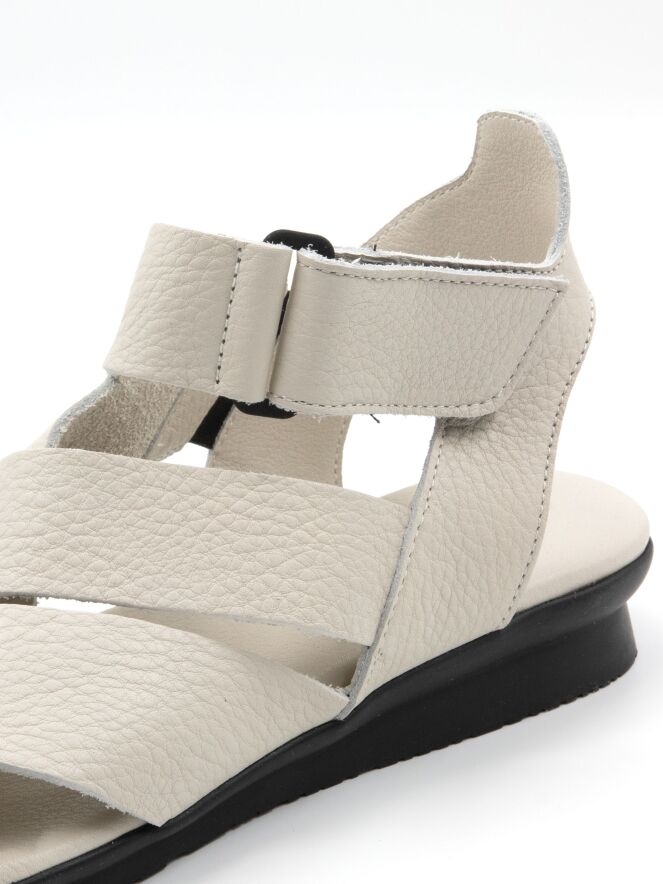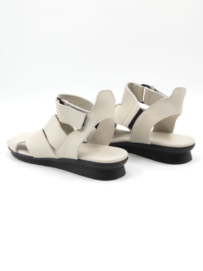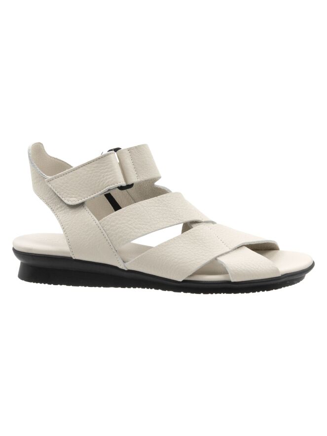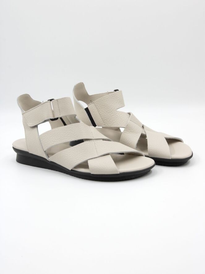 Une sandale de Arche en blanc craie. Le cuir est croisé sur l’avant-pied et la bride arrière est ajustable avec un scratch. La semelle intérieure est recouverte du même cuir que la sandale.