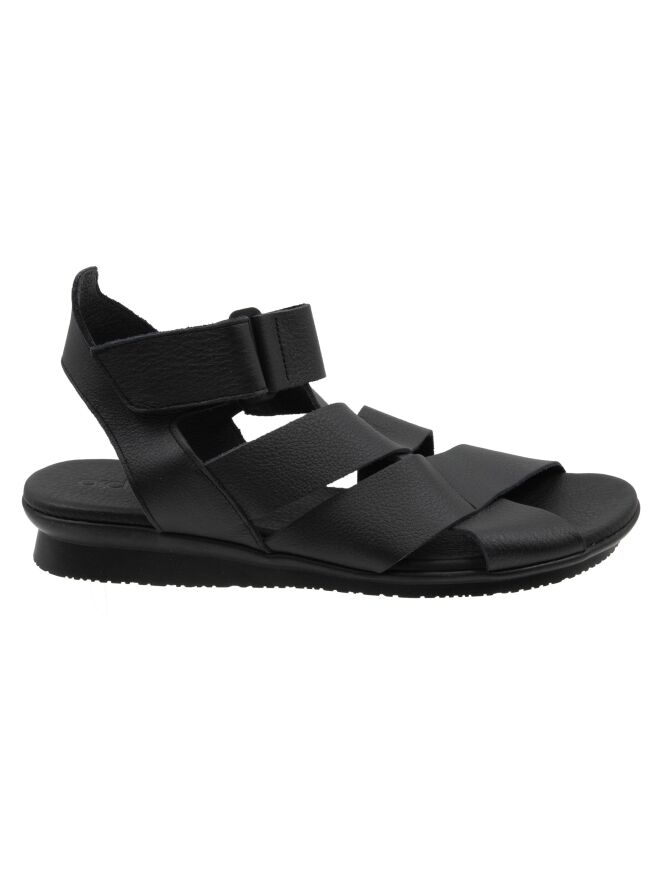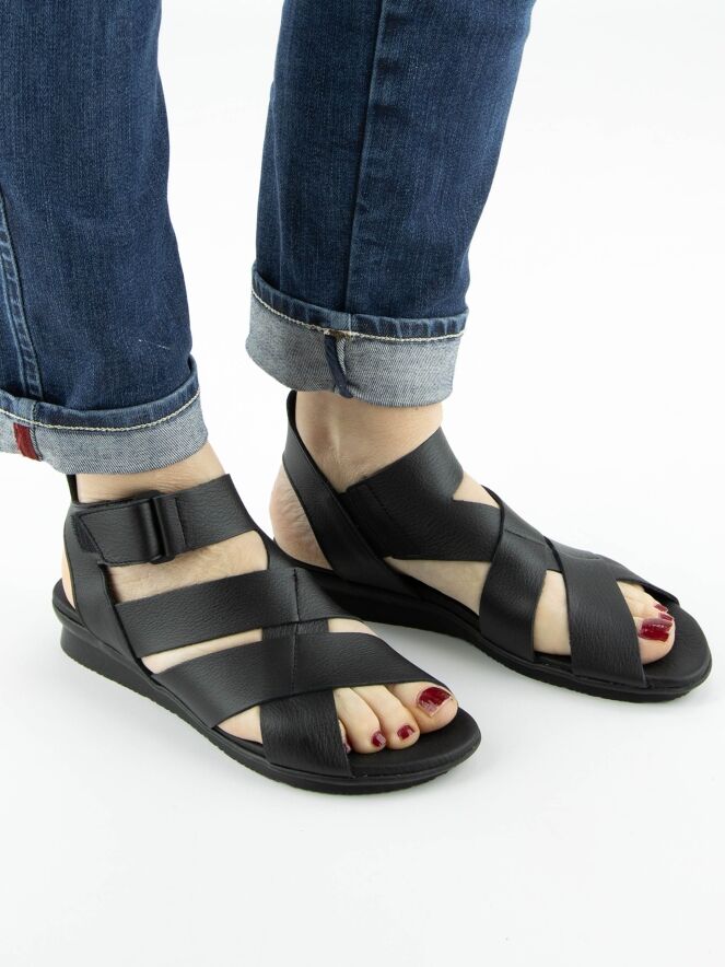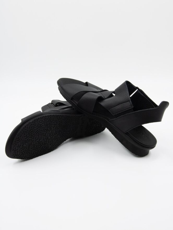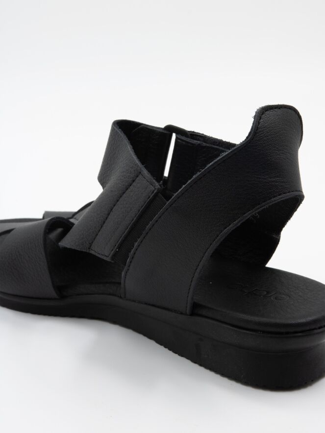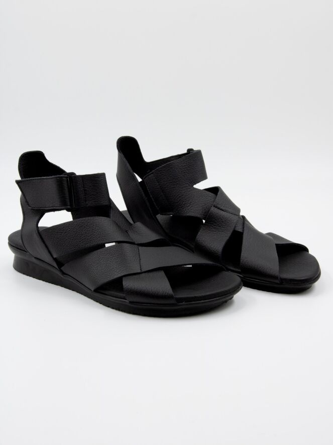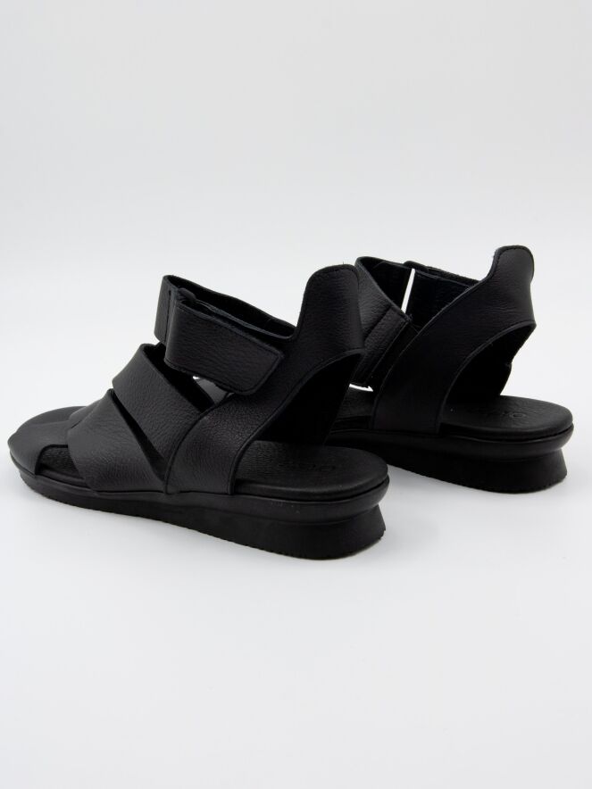 Une sandale d'Arche de couleur noire. Le cuir passe par-dessus l'avant-pied, et la sangle vers le talon est réglable avec du Velcro. La semelle intérieure est en cuir de la même couleur que la sandale.