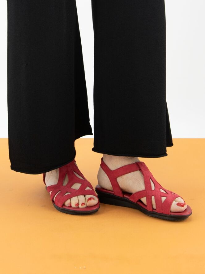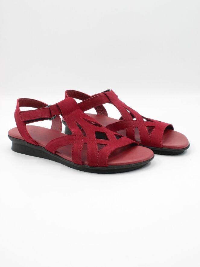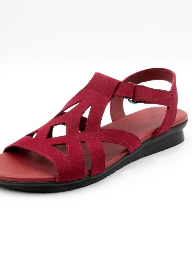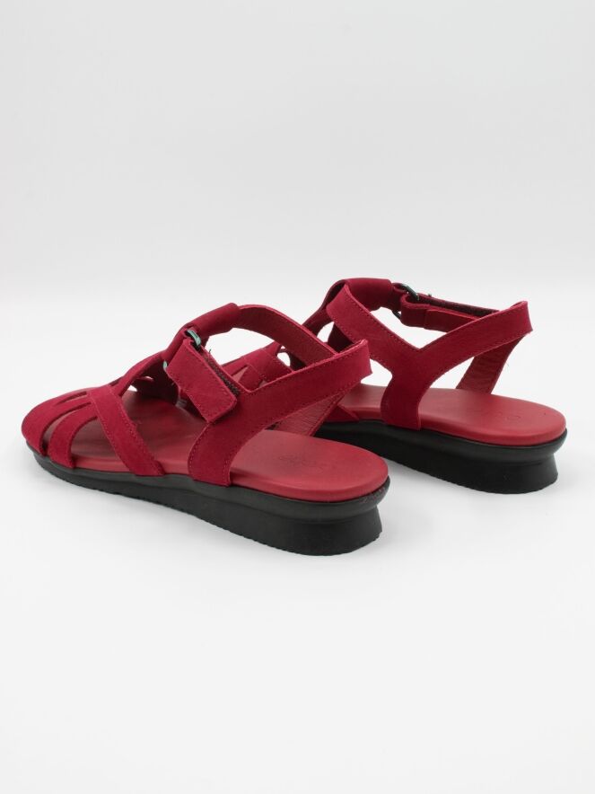 Une sandale de Arche en rouge framboise. Le nubuck est découpé dans une structure ouverte sur l’avant-pied. La bride arrière est réglable avec un scratch. La semelle intérieure est revêtue de cuir souple.