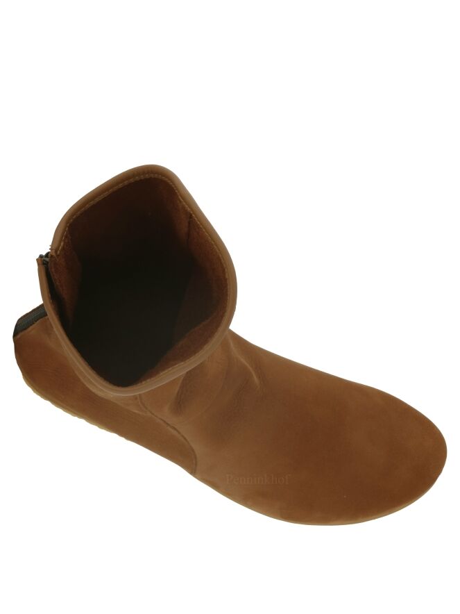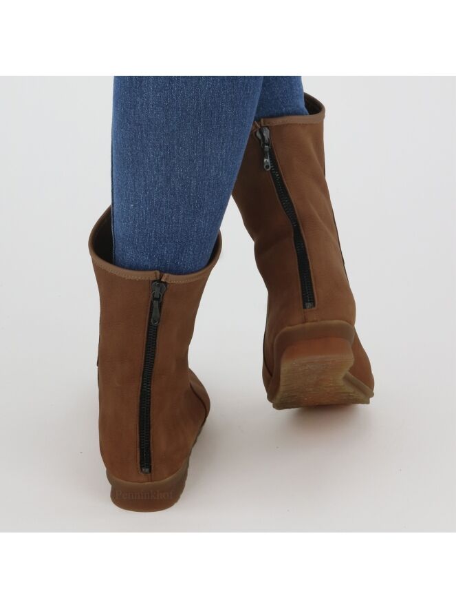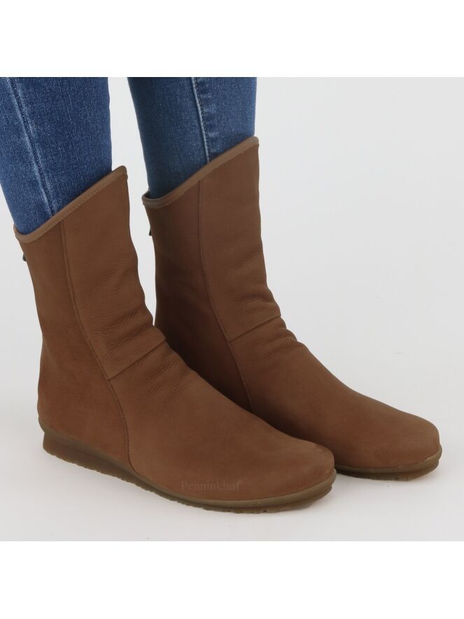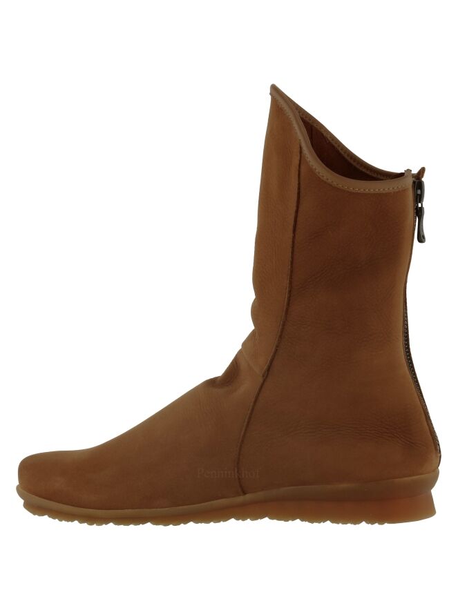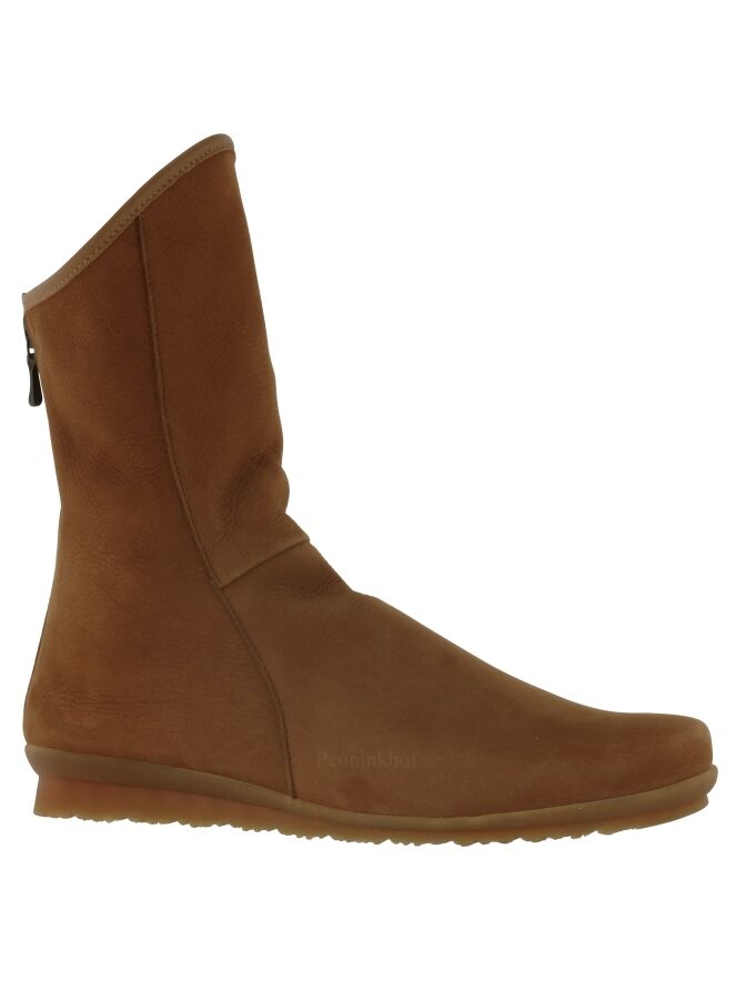 Botte à nez rond de la marque Arche, de couleur cognac. La tige est 5 cm plus haute à l'avant qu'à l'arrière avec un bord orné d'une garniture un peu plus claire. Le zip noir de fermeture se situe à l'arrière. Intérieur non doublé.