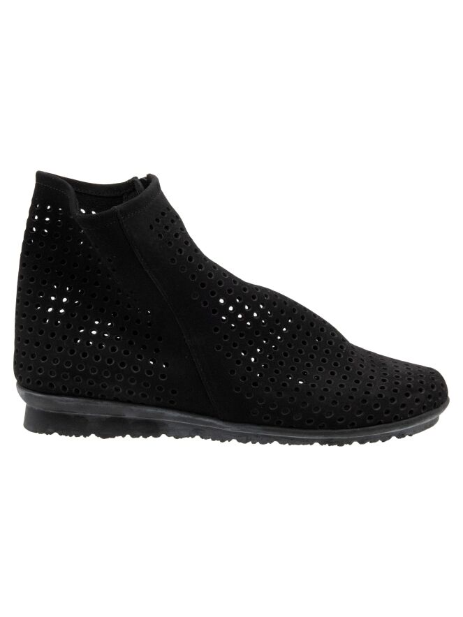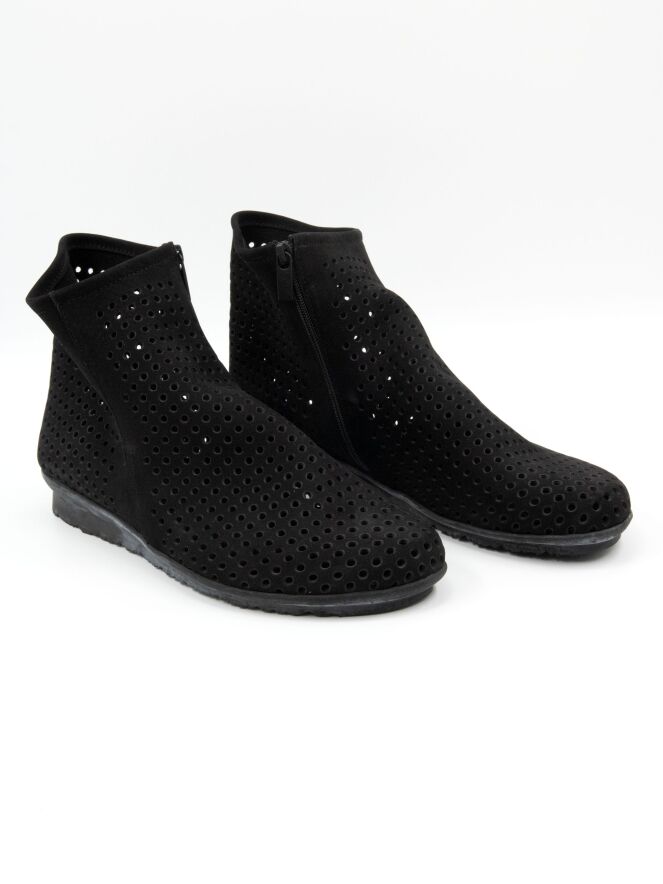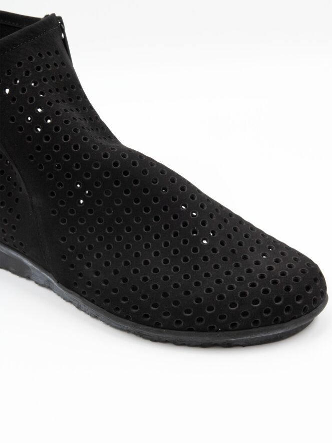 Bottine courte à nez rond de la marque Arche, de couleur noire. Son design est finement perforé. La bottine est dotée d'un zip de fermeture situé à l'intérieur et d'une fine semelle noire tout confort.