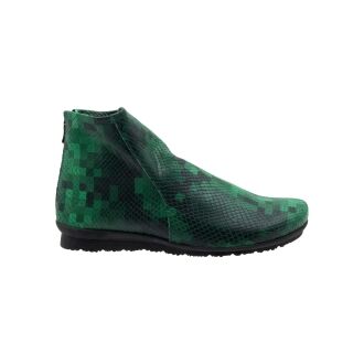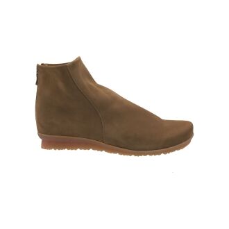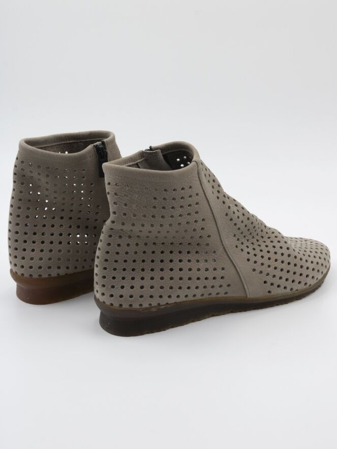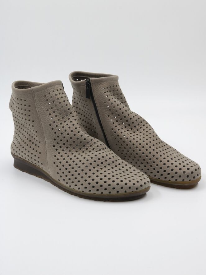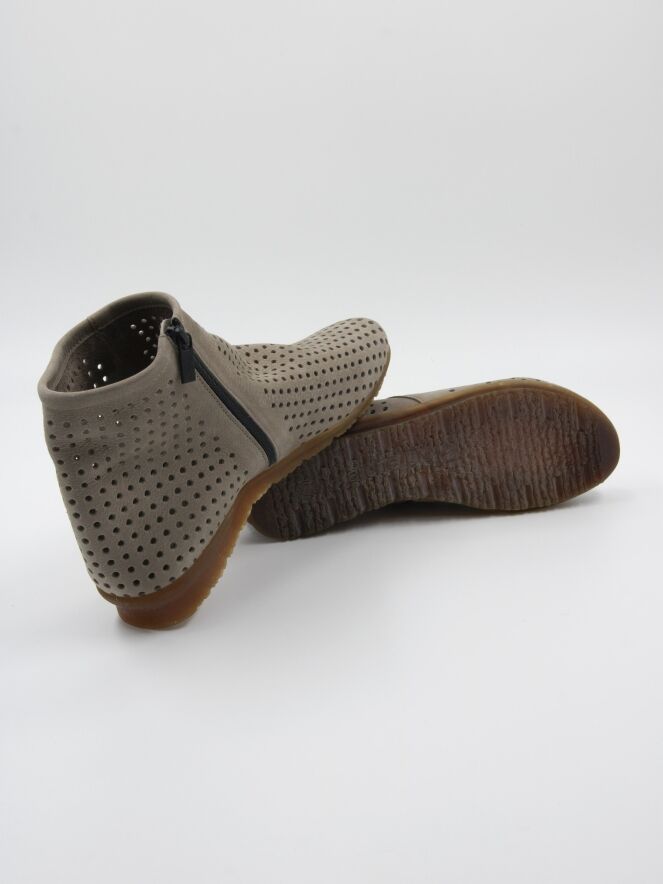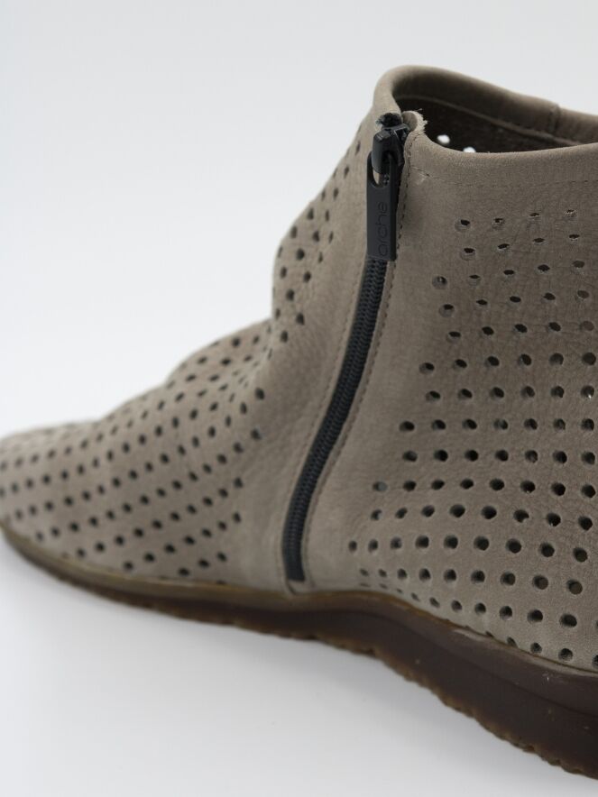 Une bottine courte de Arche dans le coloris taupe. Le daim nubuck est finement perforé. L'intérieur est zippé et le bout de la botte est rond.