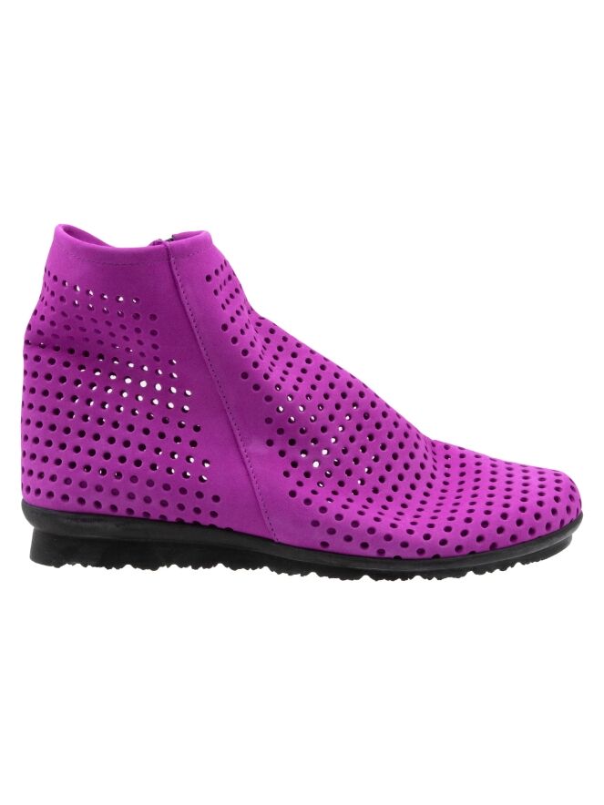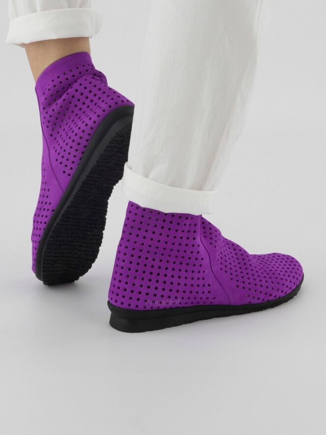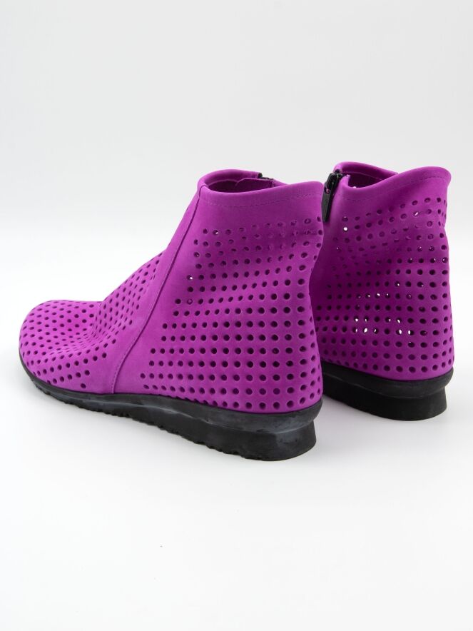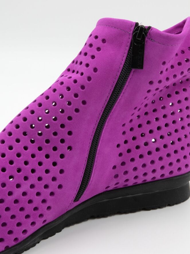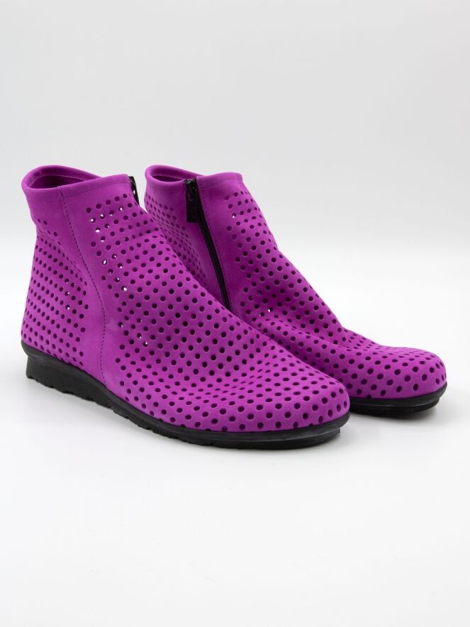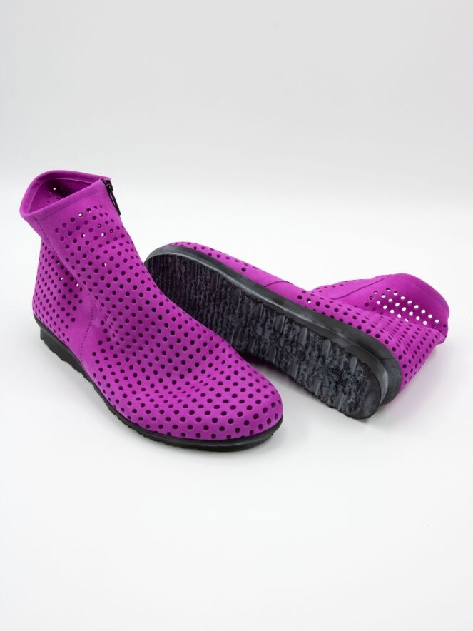 Bottine courte à nez rond de la marque Arche, de couleur violet. Son design est finement perforé. La bottine est dotée d'un zip de fermeture situé à l'intérieur et d'une fine semelle noire tout confort.