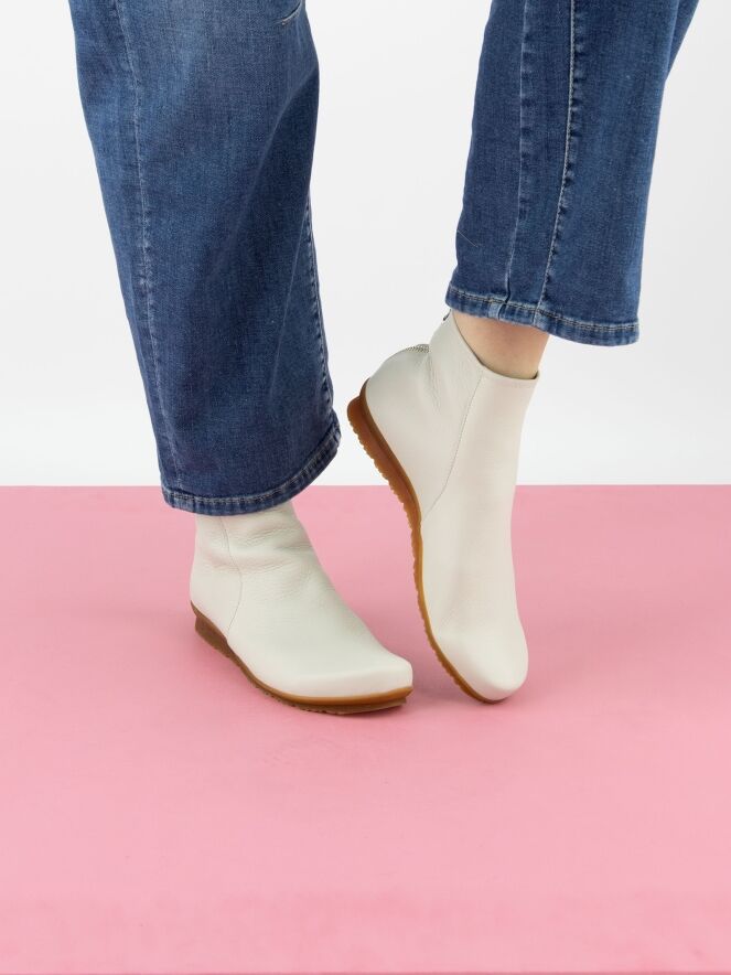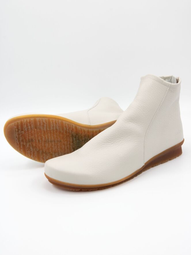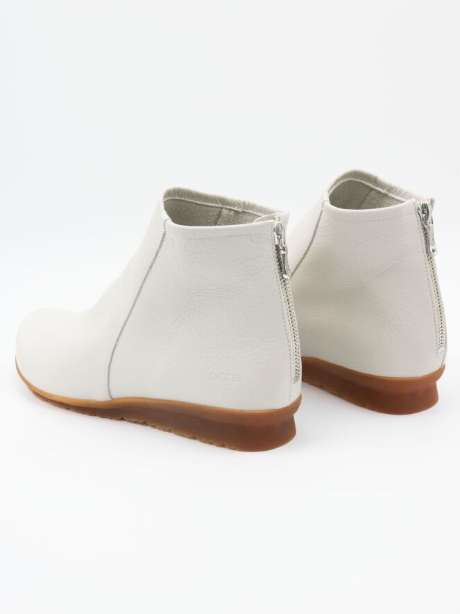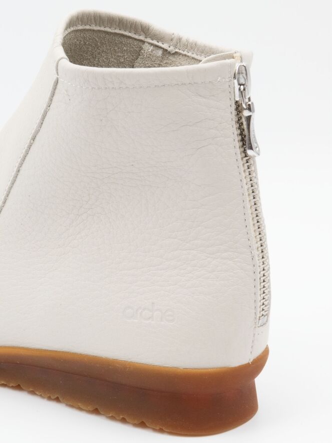 Une bottine courte de Arche en couleur mozzarella. Une fermeture éclair est placée sur le talon. L’intérieur est non doublé, et la bottine présente un bout rond. La semelle est de couleur miel.