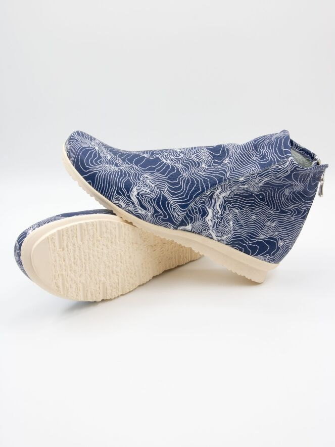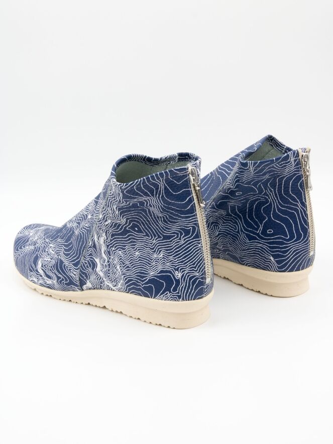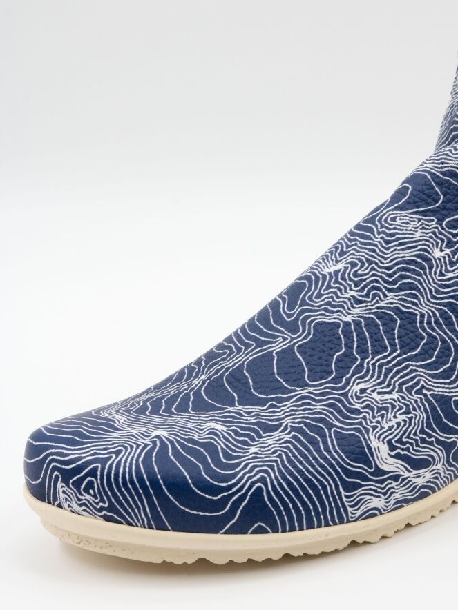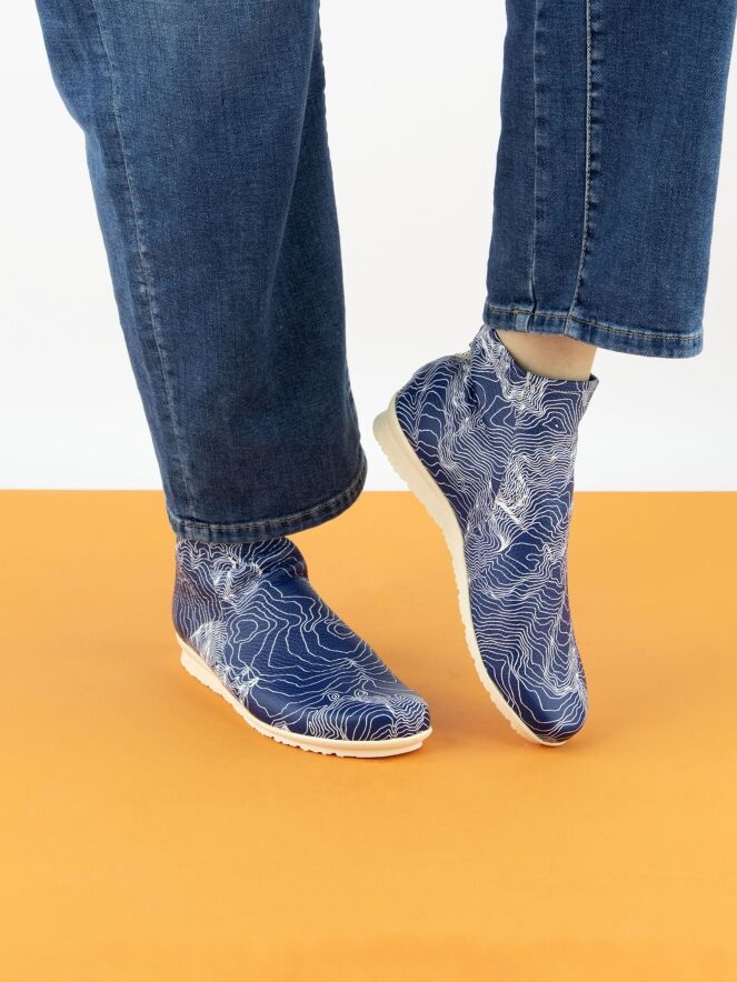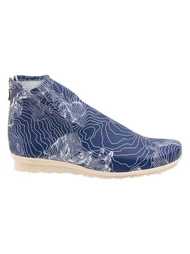 Une bottine courte de la marque Arche avec un imprimé graphique de lignes blanches sur un fond bleu. La fermeture éclair est placée sur le talon. La bottine est confectionnée en cuir très souple avec une légère brillance et est non doublée à l’intérieur. La semelle en latex présente une légère surélévation à l’arrière, offrant un confort accru.