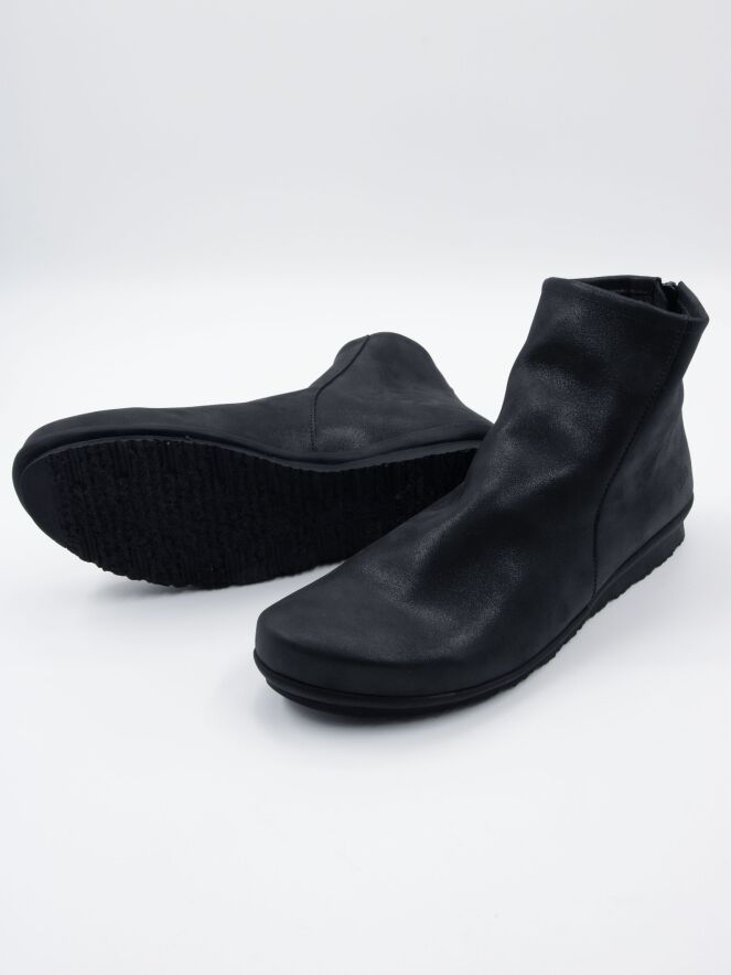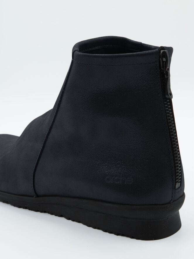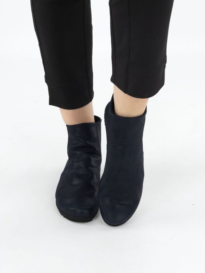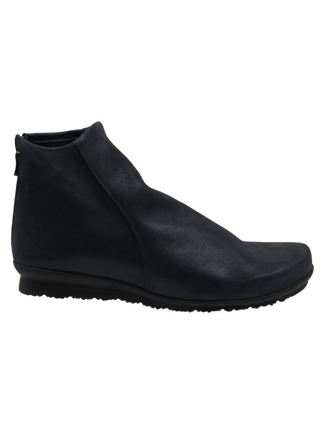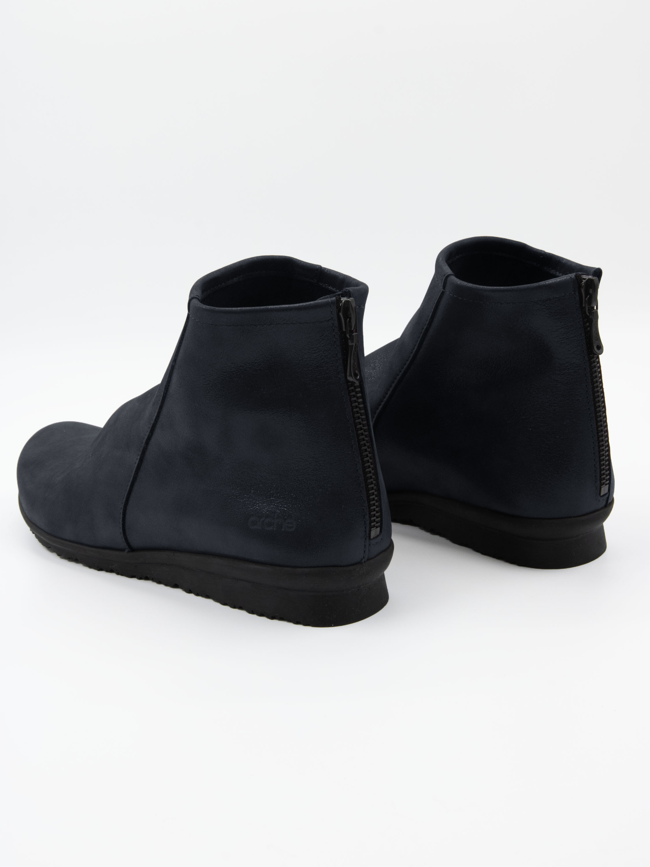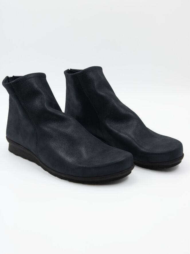 Une bottine de la marque Arche en bleu marine avec une fermeture éclair au talon. La bottine est fabriquée en cuir très doux qui présente une légère brillance et est non doublée à l'intérieur. La semelle est en latex avec une légère élévation à l'arrière, ce qui augmente le confort de port.
