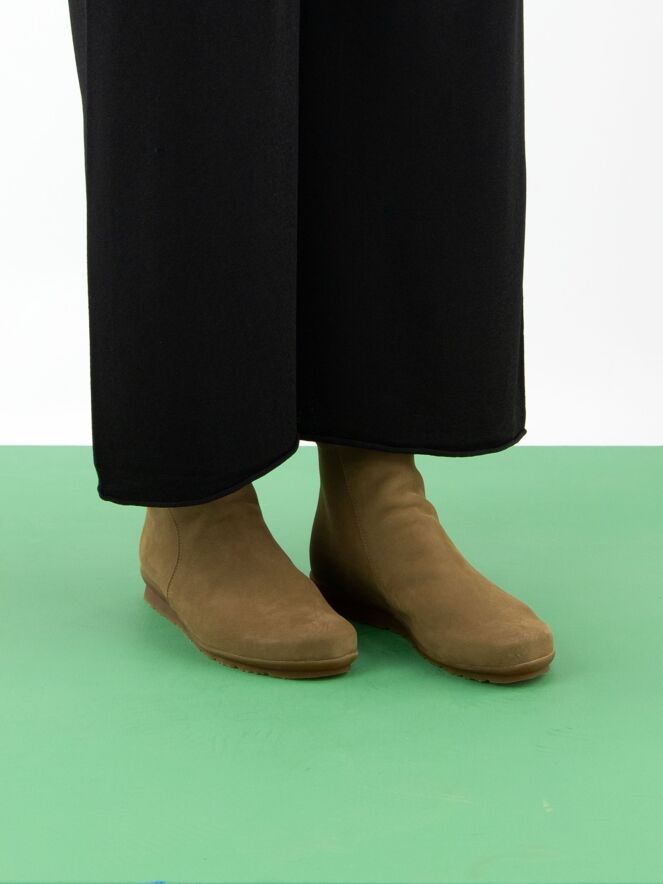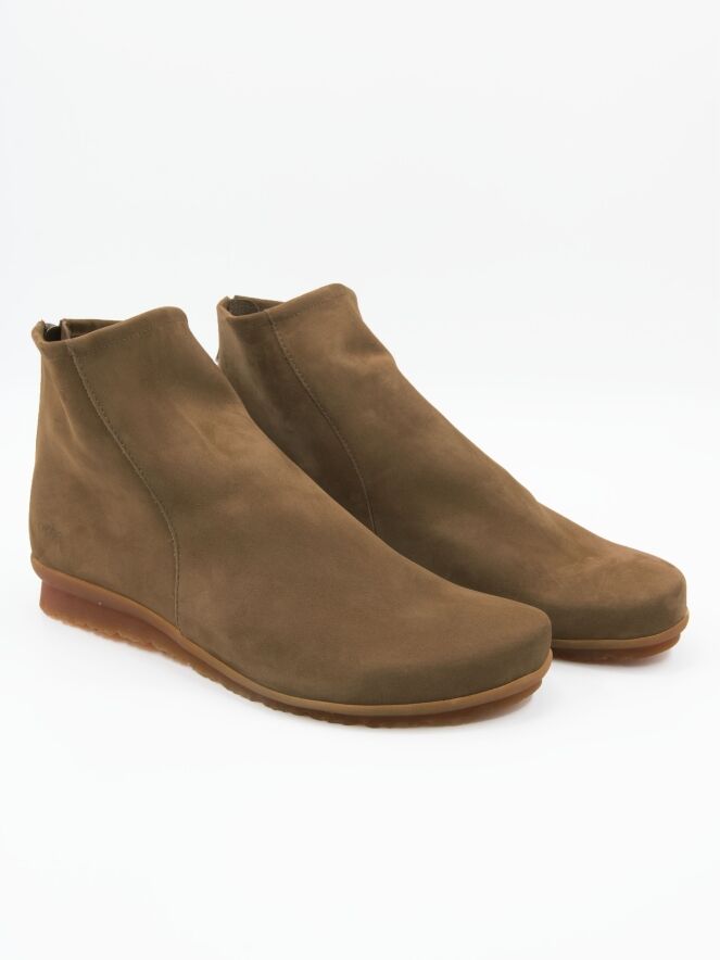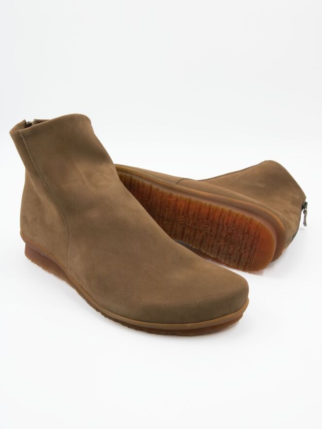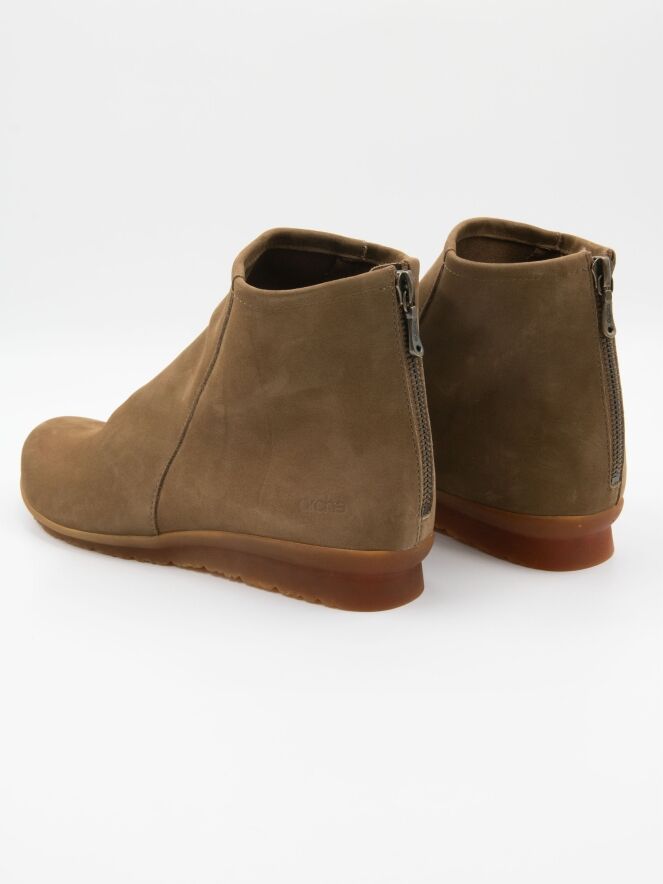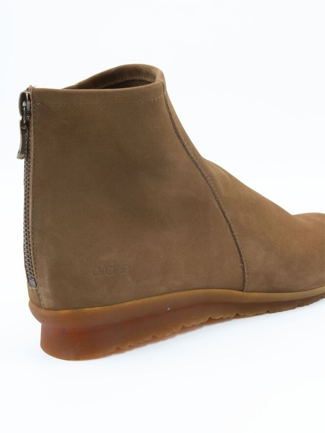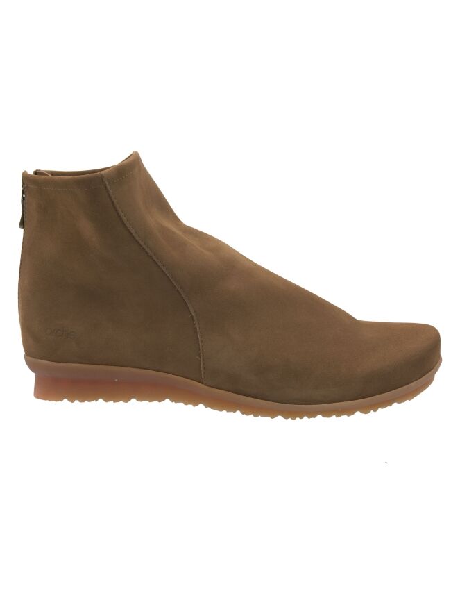 Une bottine courte de Arche en couleur camel. Une petite fermeture éclair est placée au niveau du talon. L’intérieur est non doublé et la bottine présente un bout arrondi. La semelle est de couleur miel.