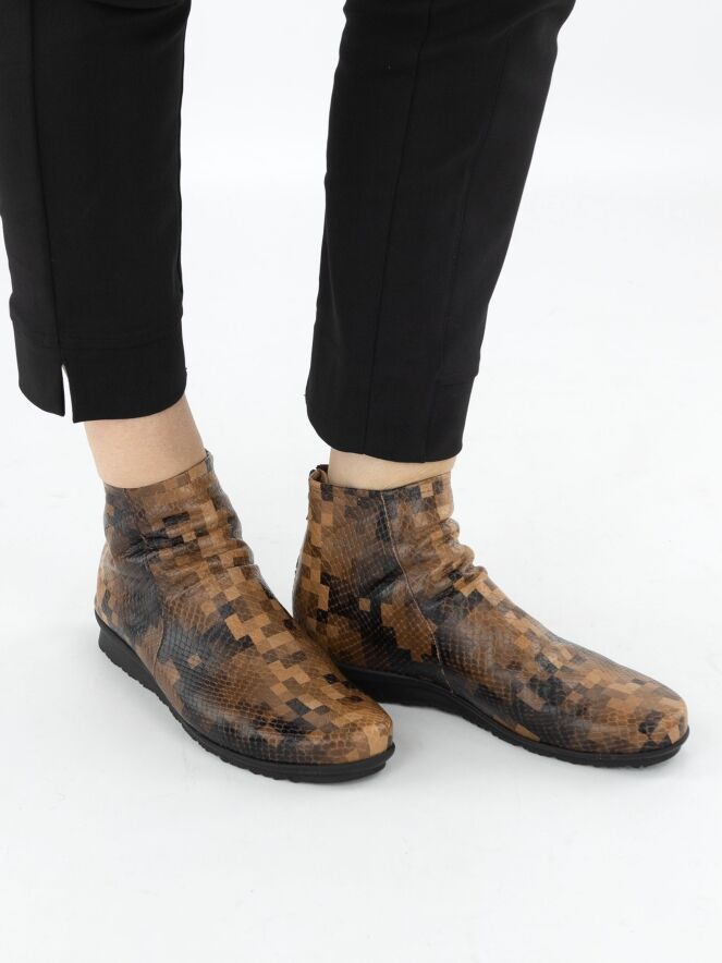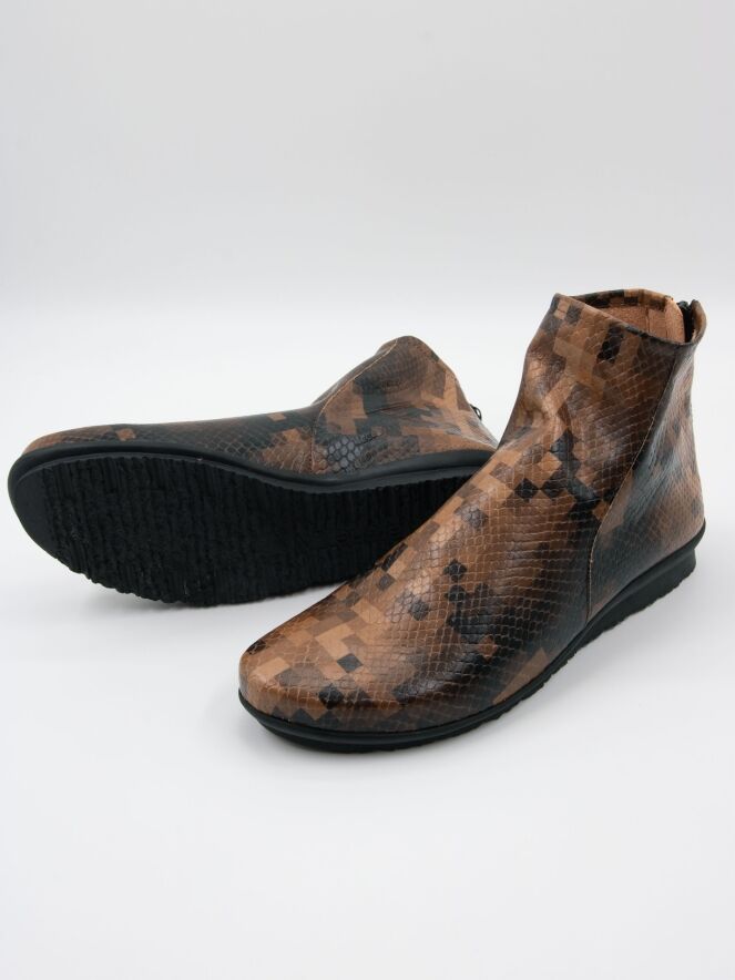 Une petite botte de la marque Arche dans un imprimé à carreaux avec plusieurs nuances de brun sur une texture reptile, dotée d'une fermeture éclair sur le talon. La botte est fabriquée en cuir très doux qui présente un léger éclat et est non doublée à l'intérieur. La semelle en latex est légèrement surélevée à l'arrière, augmentant ainsi le confort de port.