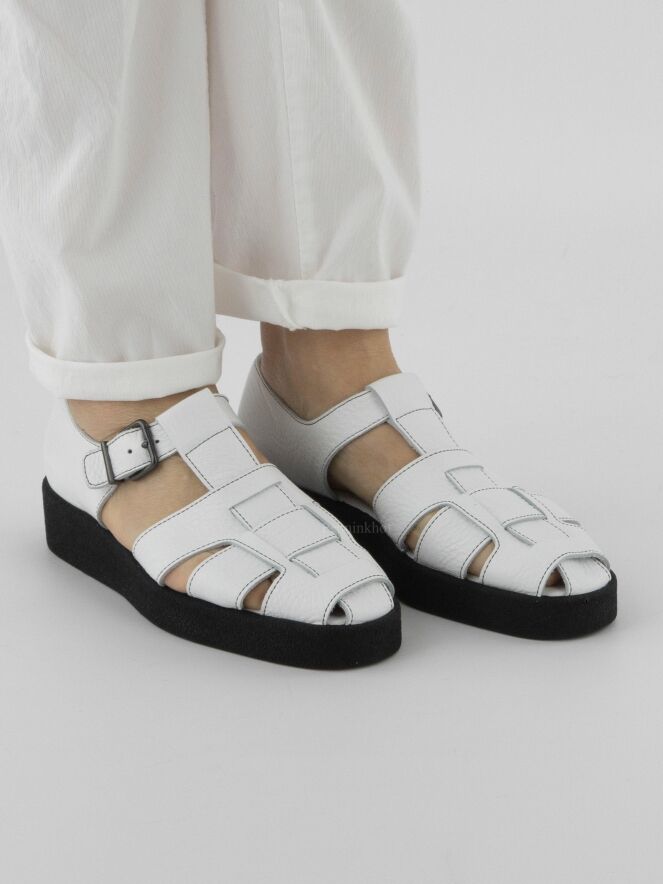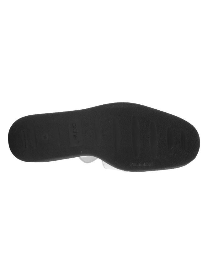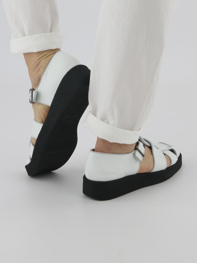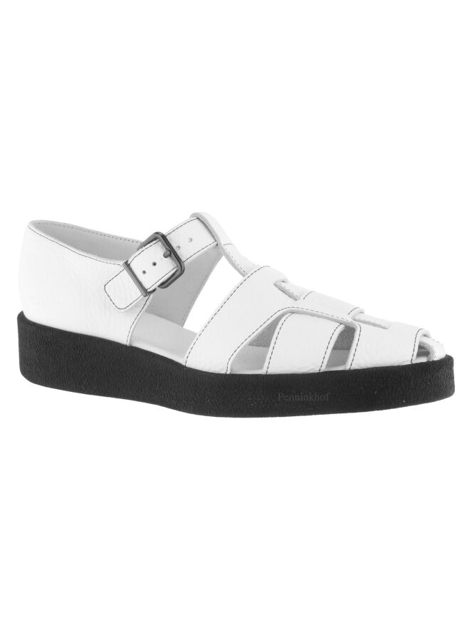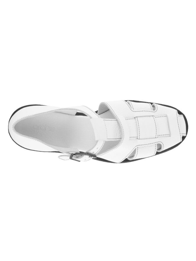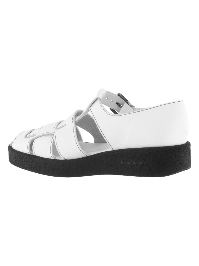 Sandale ouverte de la marque Arche, en cuir blanc. Les 3 sangles sur l'avant-pied s'entrecroisent avec la sangle centrale du milieu du pied. La sangle autour de la cheville est réglable. Toutes les sangles sont en cuir blanc avec une double couture contrastante. Semelle de couleur noire.