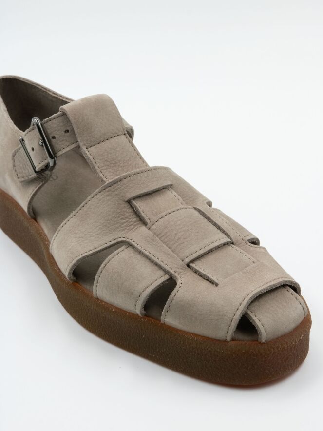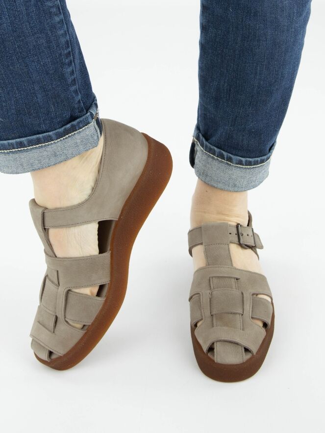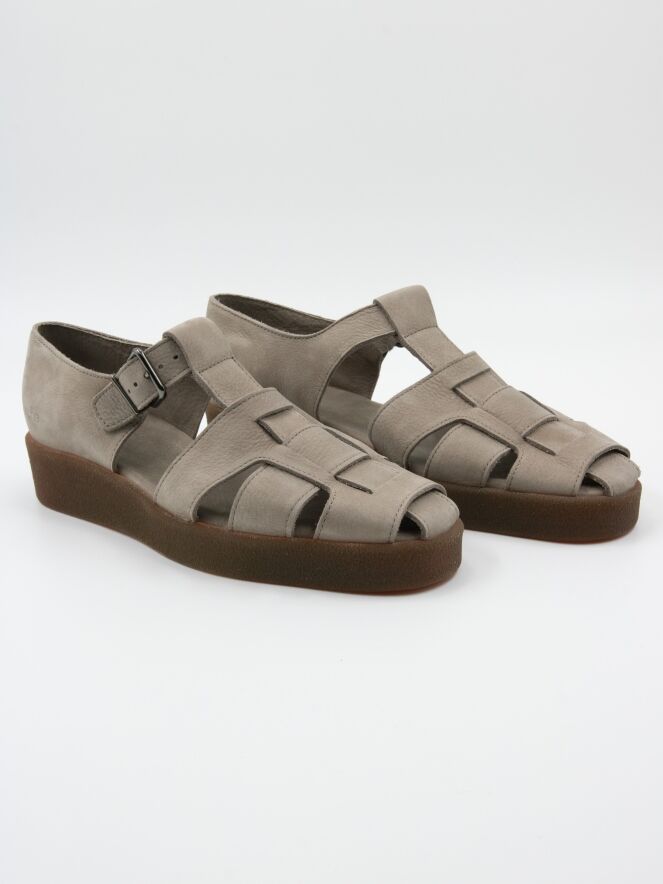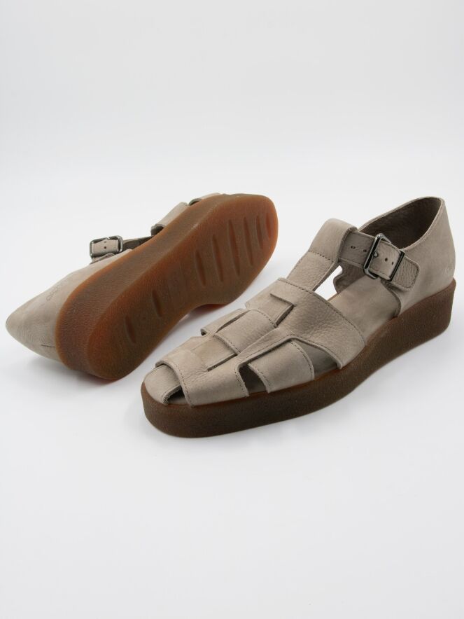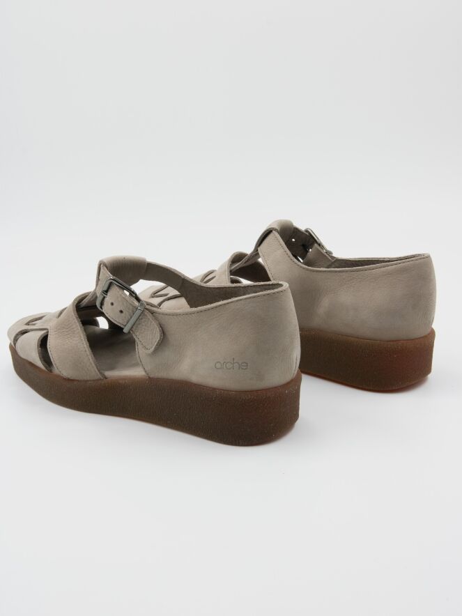 Une sandale ouverte d'Arche de couleur beige sable. Il y a 3 lanières sur l'avant-pied avec une lanière centrale qui va du bout au cou-de-pied. La sandale a une bride réglable. La semelle est de couleur miel.