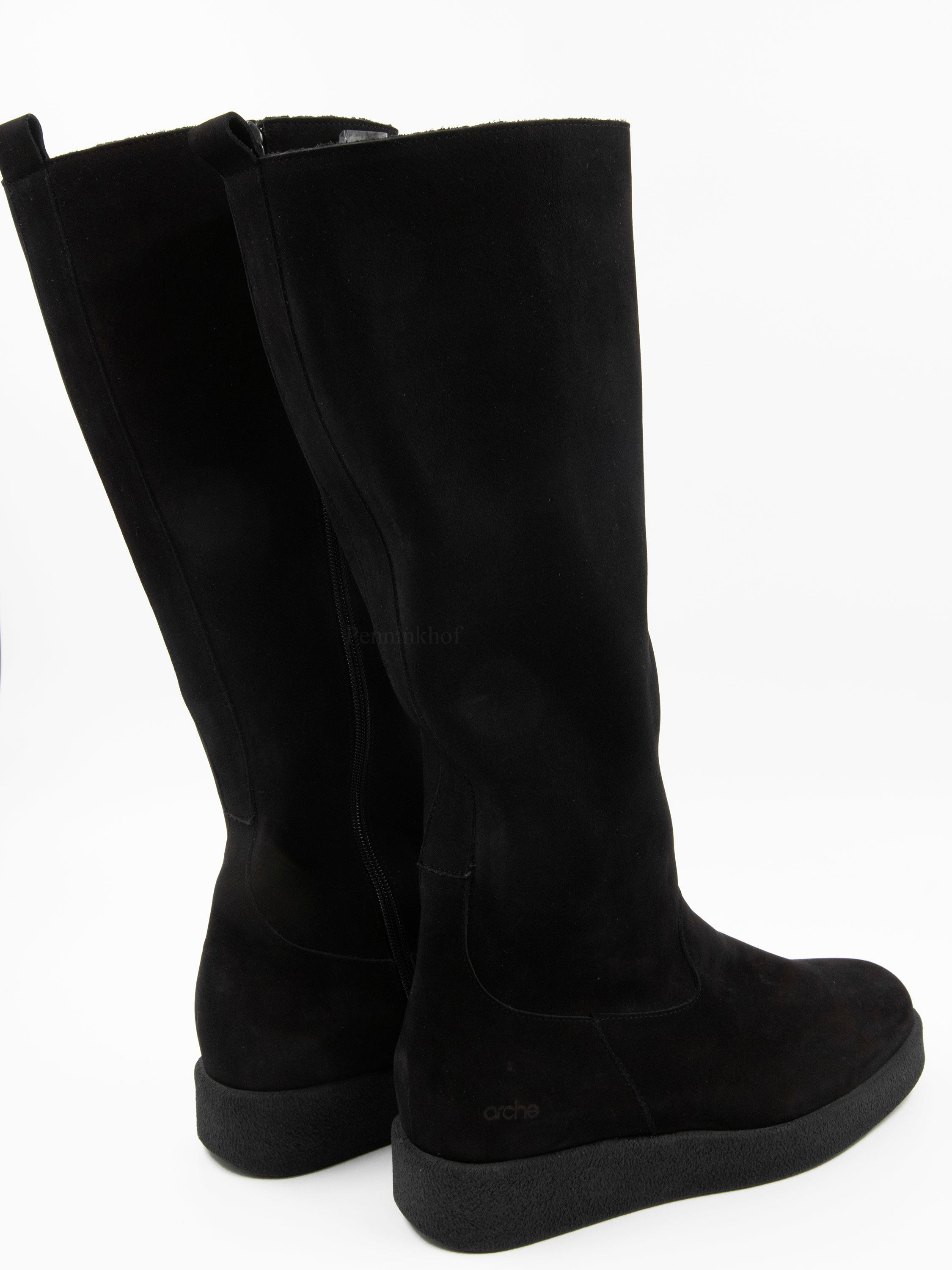Une botte haute d'Arche de couleur noire. Il y a une fermeture éclair à l'intérieur de la tige. La semelle est noire. L'intérieur n'est pas doublé.