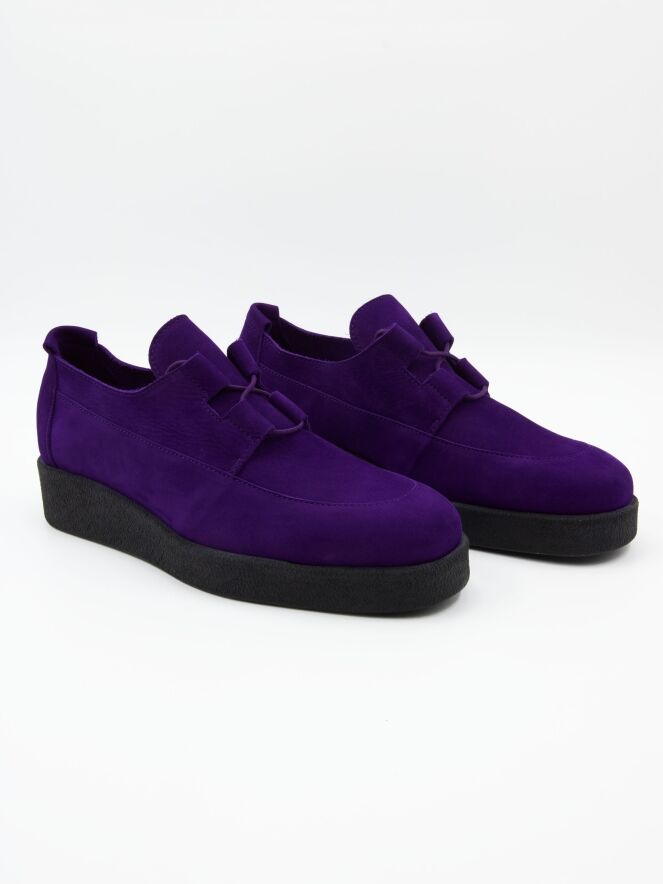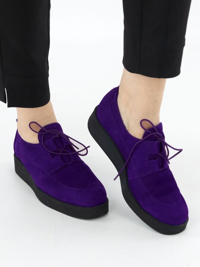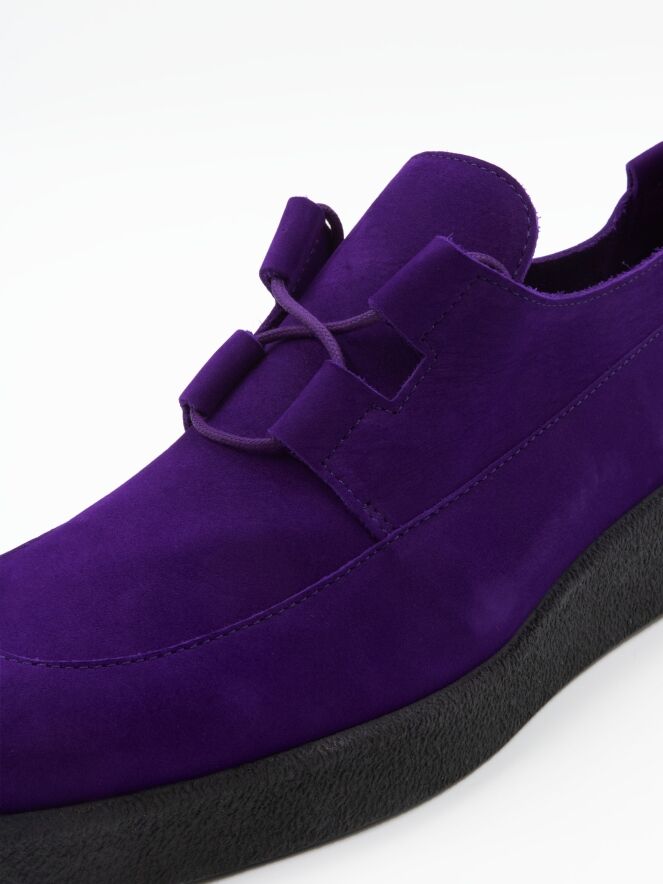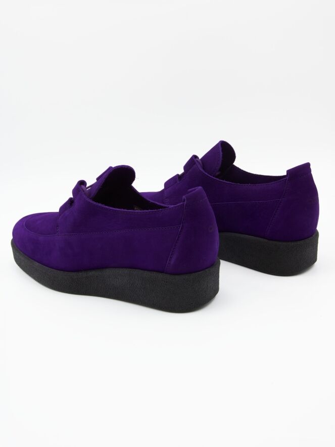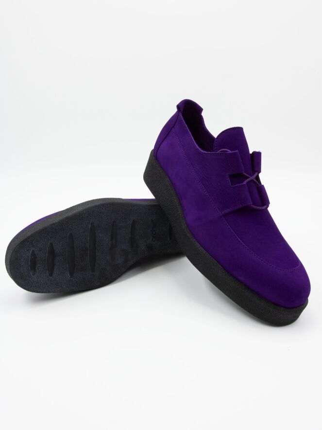 Une chaussure à lacets d'Arche en couleur violette. La chaussure possède quatre larges passants de lacets. La semelle plateforme est noire. L'intérieur n'est pas doublé.