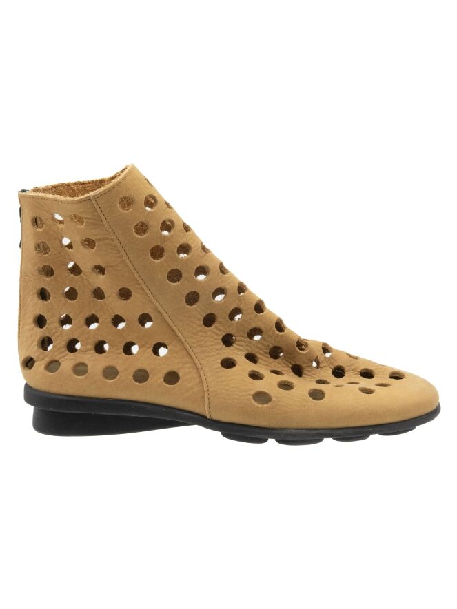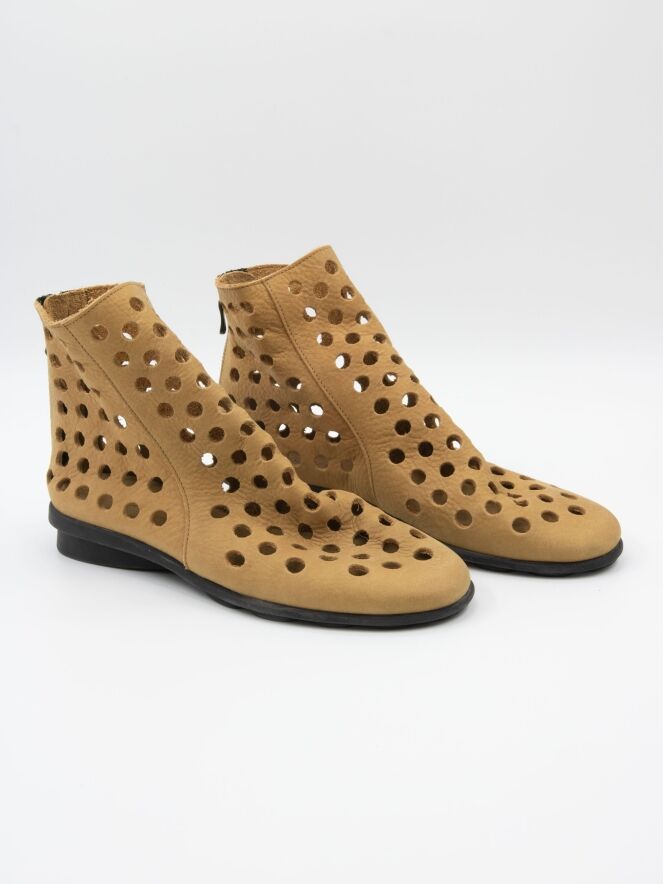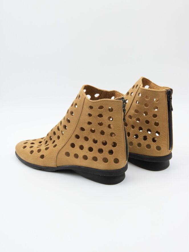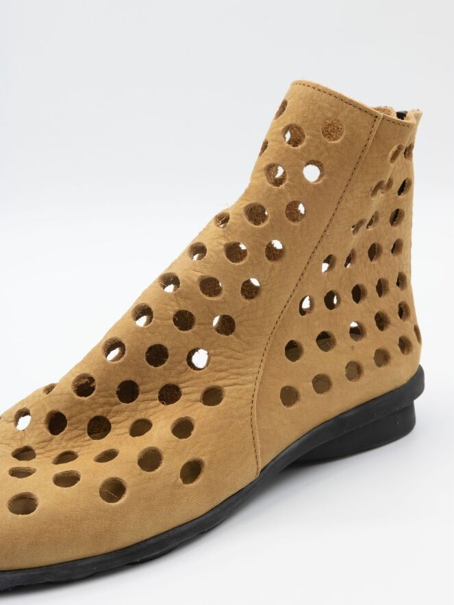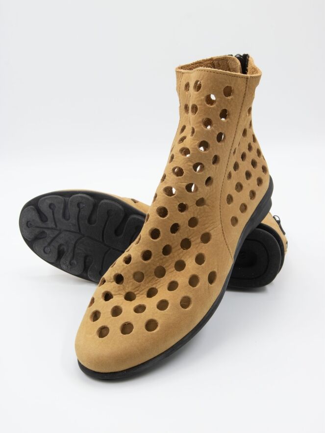 Cette bottine d'été de la marque Arche arrive à la cheville. Couleur camelen nubuck finement perforé. Modèle s’enfilant très facilement grâce à la souplesse de son cuir ainsi qu’à sa fermeture Eclair à l'arrière. Elle possède aussi une grande flexibilité et confort grâce à sa semelle en latex. L'intérieur n’est pas doublé.