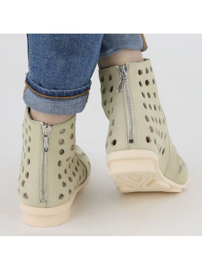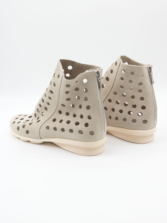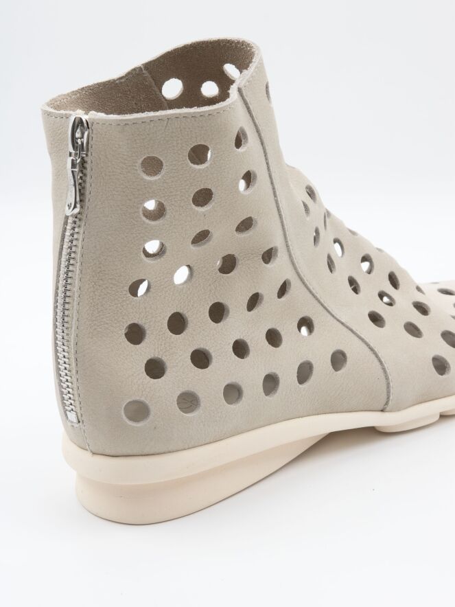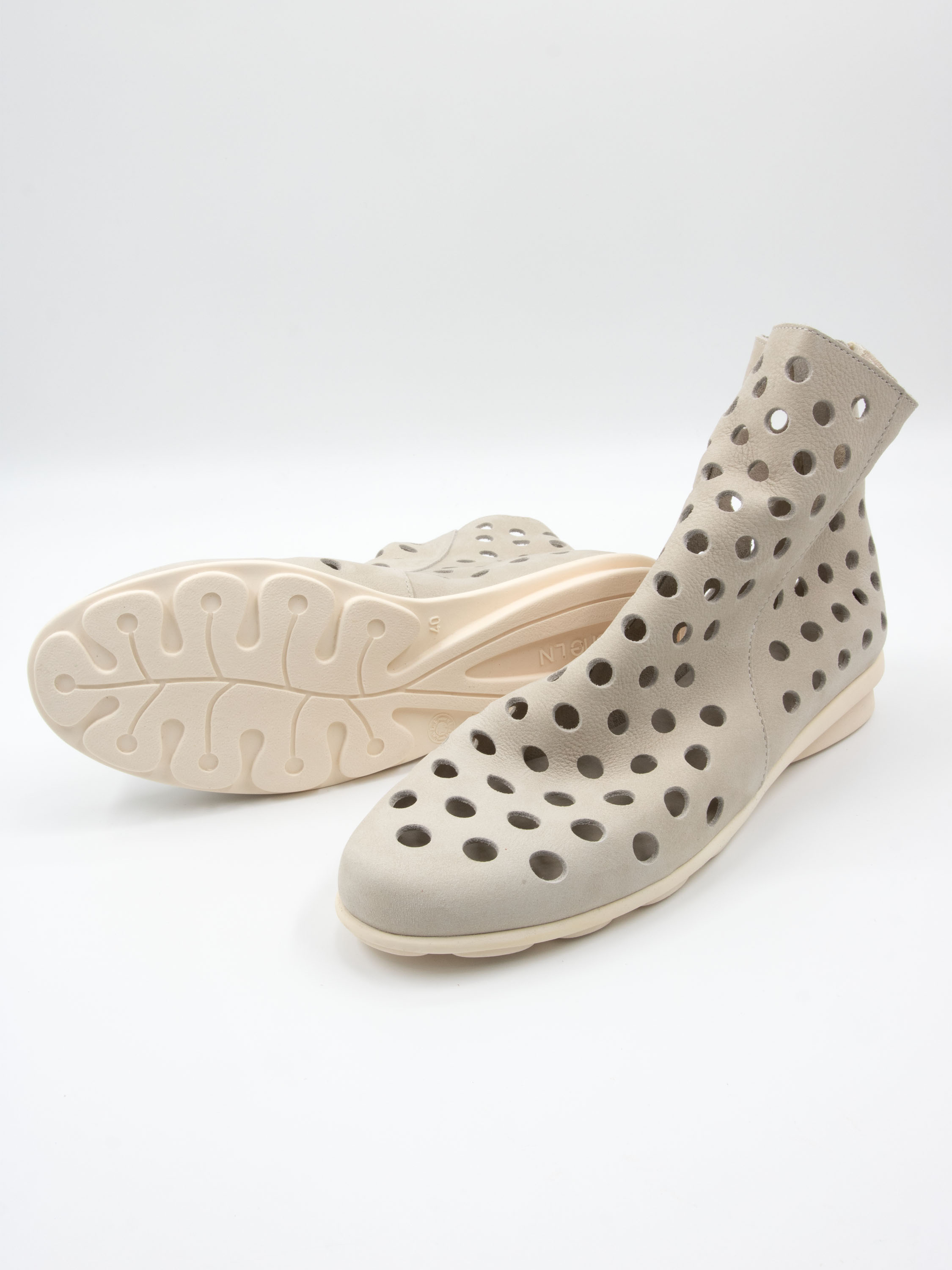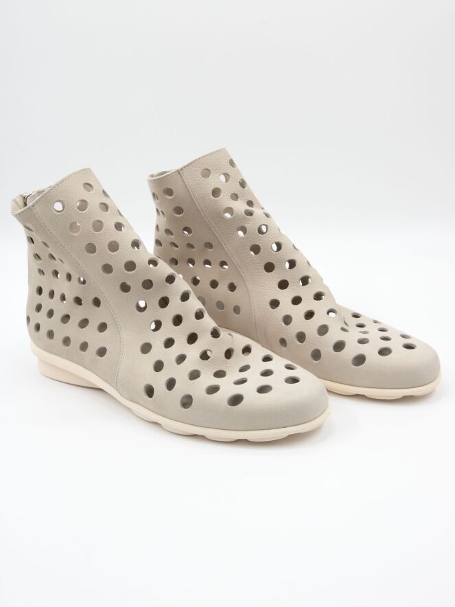 Cette bottine d'été de la marque Arche arrive à la cheville. Couleur écrue nubuck finement perforé. Modèle s’enfilant très facilement grâce à la souplesse de son cuir ainsi qu’à sa fermeture Eclair à l'arrière. Elle possède aussi une grande flexibilité et confort grâce à sa semelle en latex. L'intérieur n’est pas doublé.
