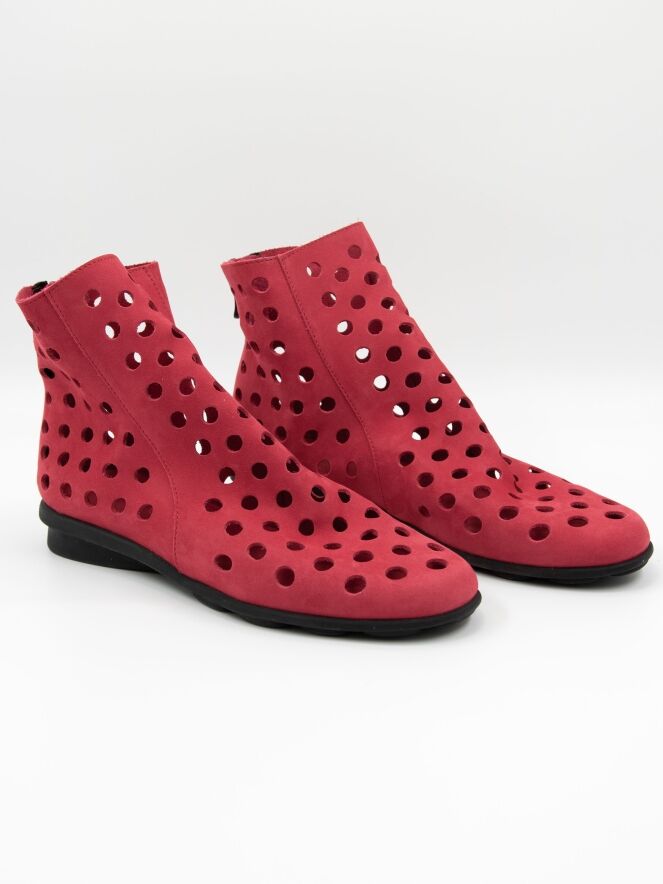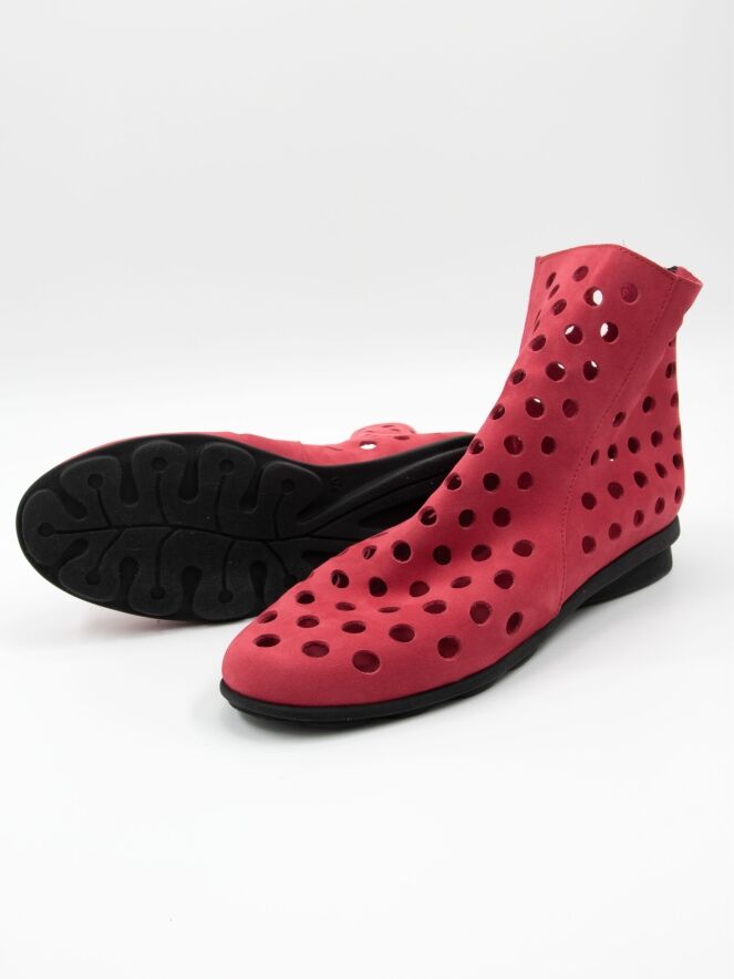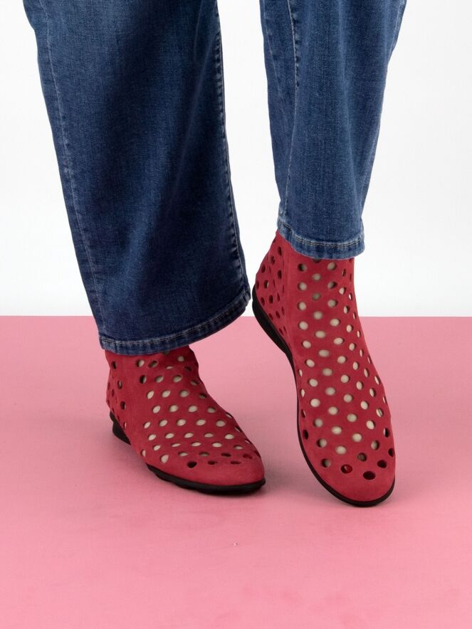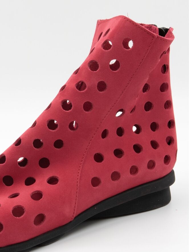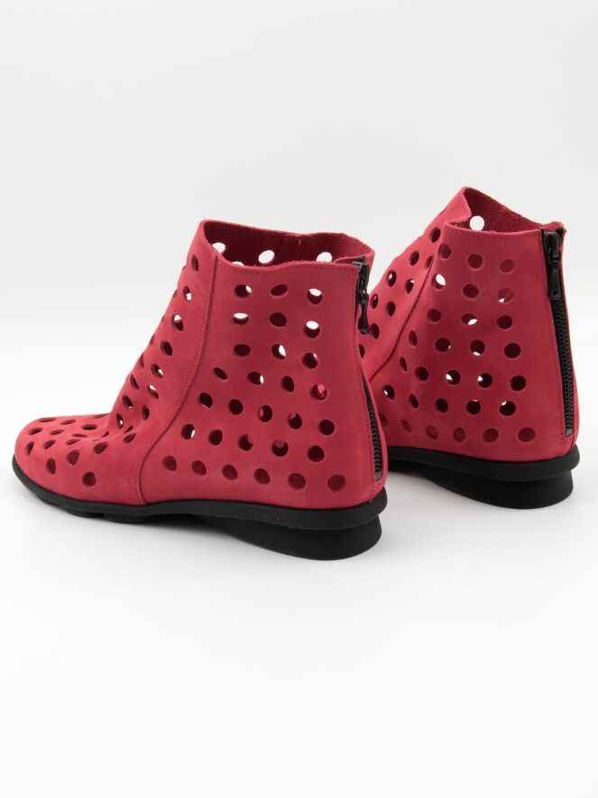 Une bottine courte perforée de la marque Arche en rouge framboise. Le cuir est très souple et une fermeture éclair est placée à l’arrière de la bottine. La semelle est en latex noir et l’intérieur n’est pas doublé.