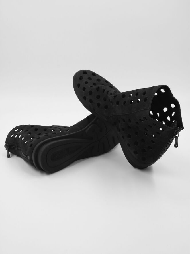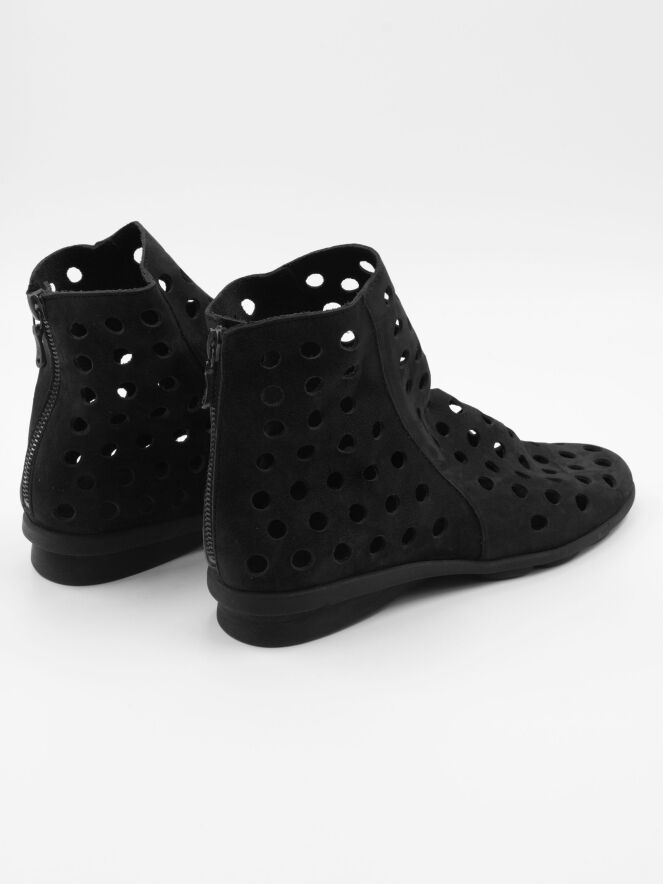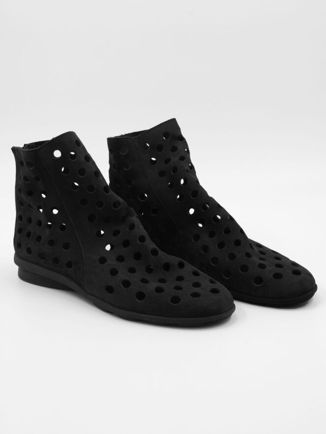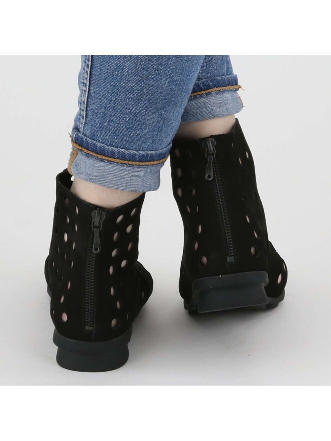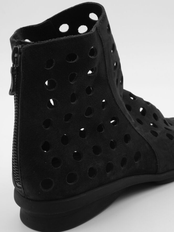 Cette bottine d'été de la marque Arche arrive à la cheville. Couleur noire nubuck finement perforé. Modèle s’enfilant très facilement grâce à la souplesse de son cuir ainsi qu’à sa fermeture Eclair à l'arrière. Elle possède aussi une grande flexibilité et confort grâce à sa semelle en latex. L'intérieur n’est pas doublé.