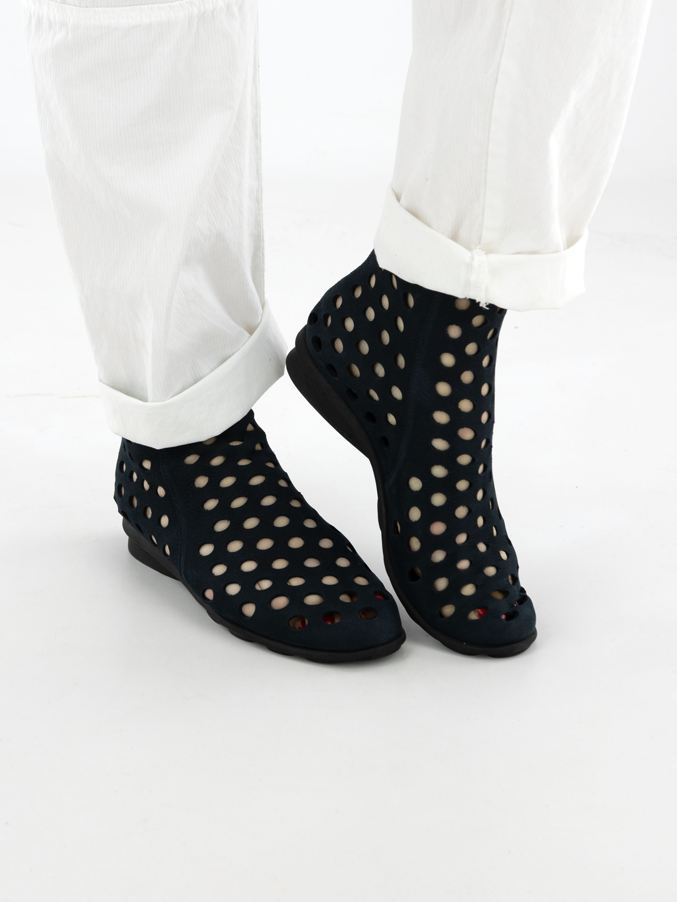Bottine courte perforée à enfiler de Arche dans une élégante teinte bleu marine. Le cuir extrêmement souple assure un confort exceptionnel. Une fermeture zippée à l’arrière facilite l’enfilage. La semelle en latex noir offre souplesse et amorti, tandis que l’intérieur non doublé garantit une sensation légère et naturelle.