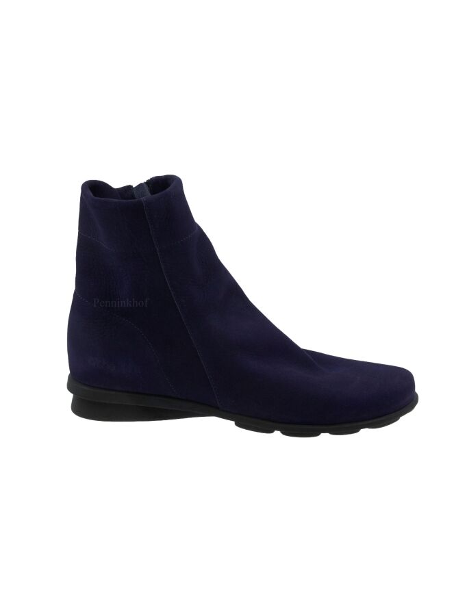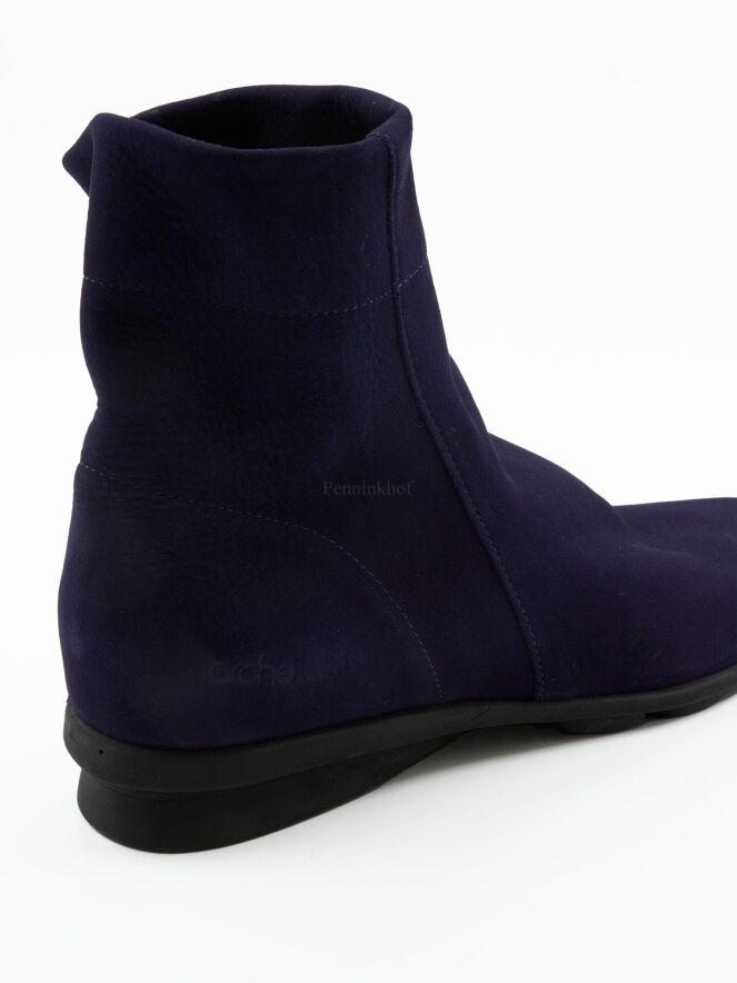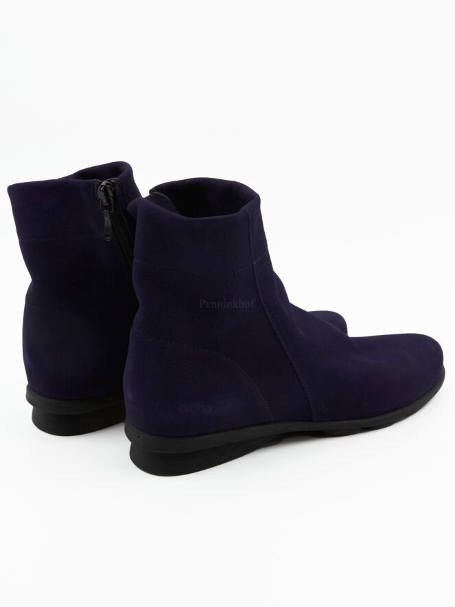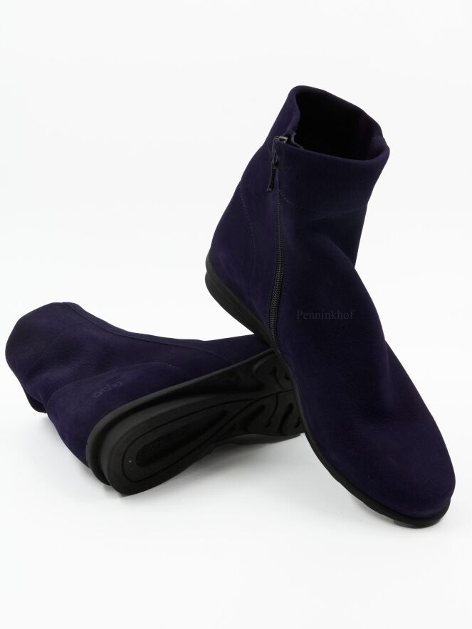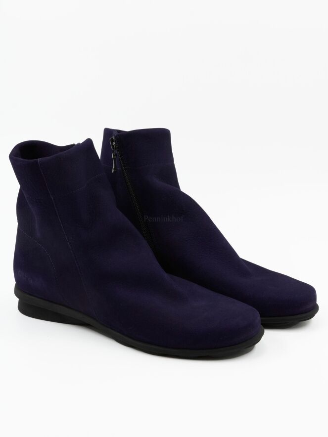 Une bottine courte de couleur violette. Le chausson a un nez rond et une fermeture éclair à l'intérieur de la tige. La semelle en latex est légèrement surélevée au niveau du talon. L'intérieur n'est pas doublé.