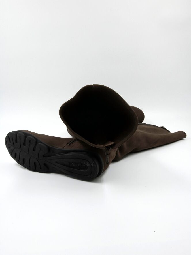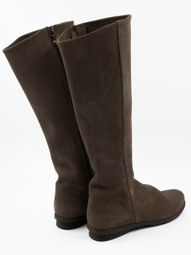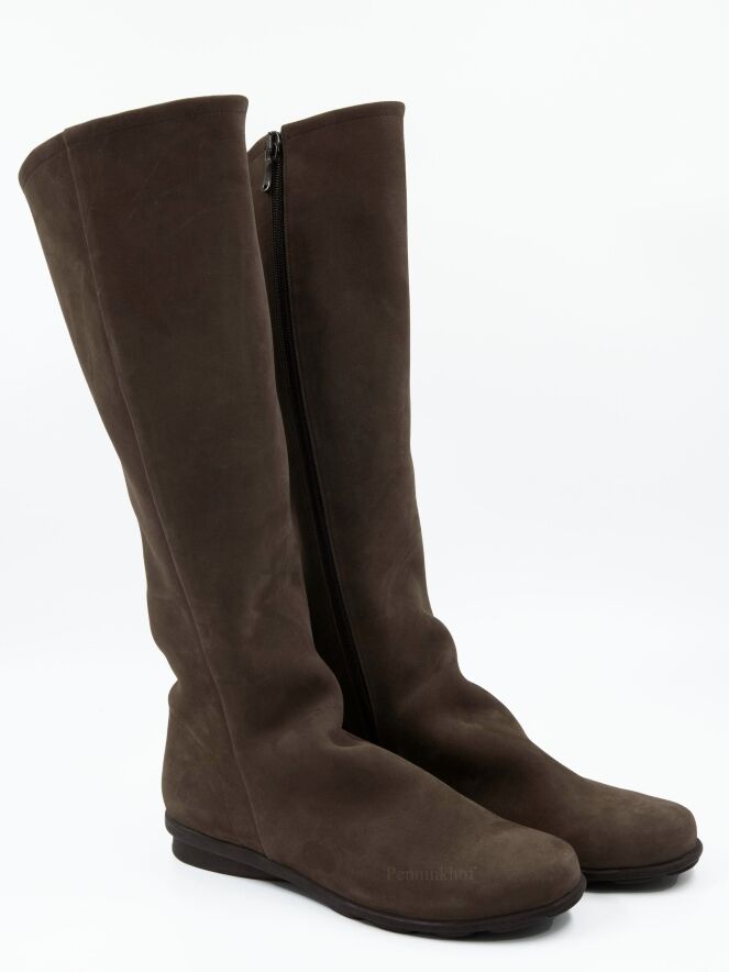 Botte de la marque Arche en brun moka. Une fermeture éclair noire s’étend sur toute la longueur de la tige, côté intérieur. L’intérieur de la tige n’est pas doublé.