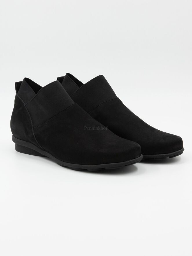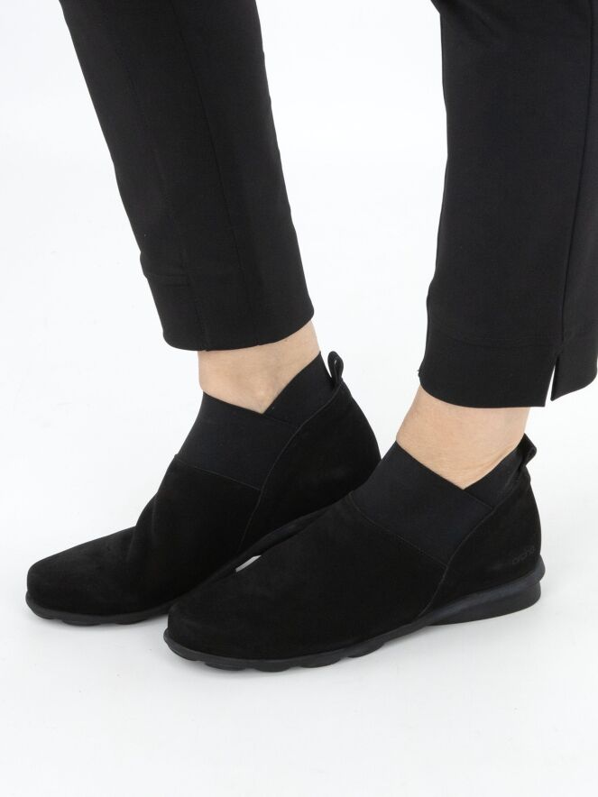 Une chaussure plate en noir avec 2 sangles élastiques noires sur le bord de la tige. La semelle en latex est légèrement surélevée sous le talon pour un meilleur confort. L'intérieur n'est pas doublé.