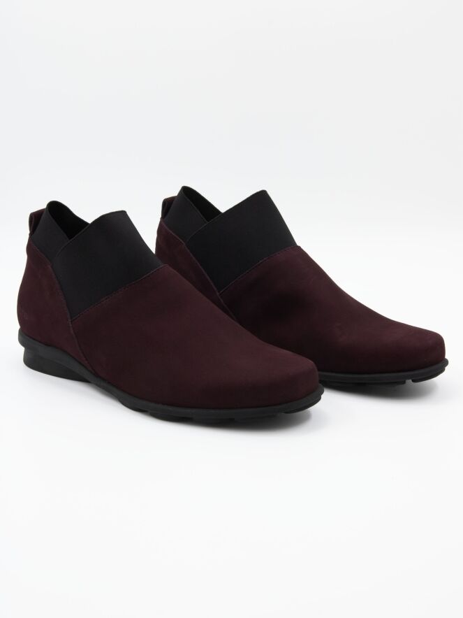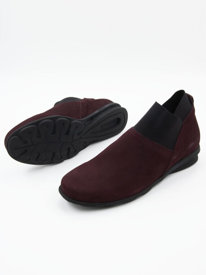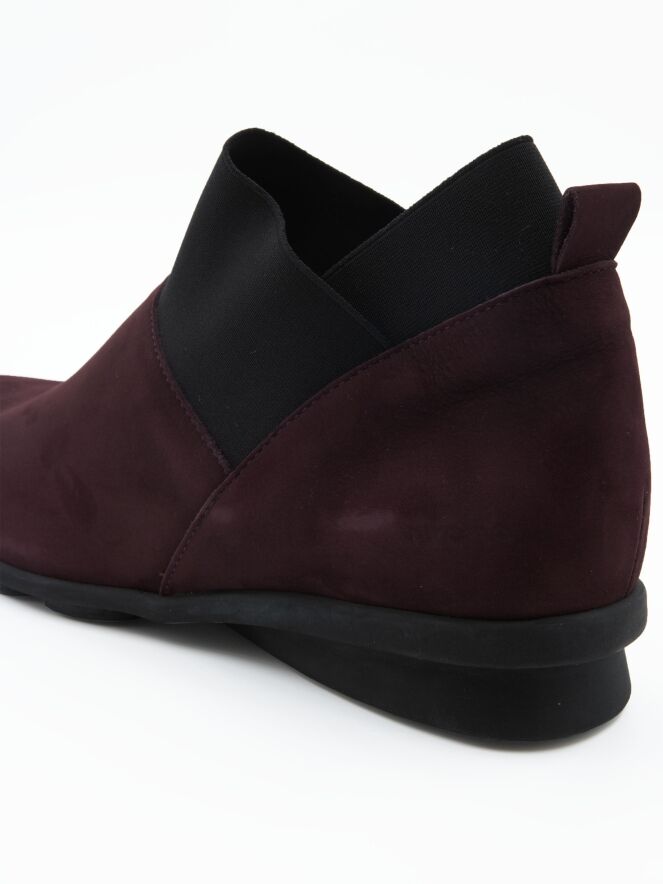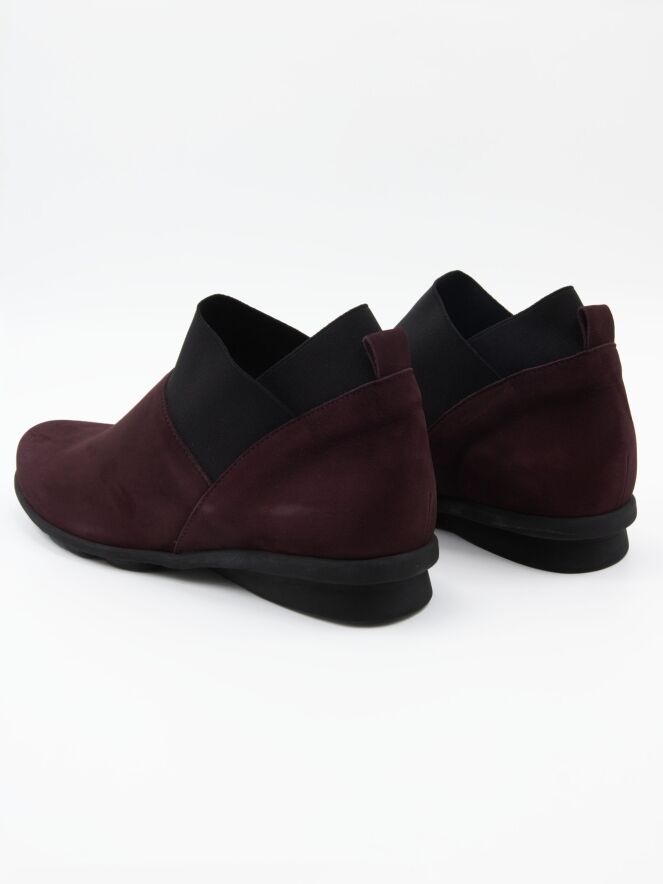 Une chaussure plate en bordeauxrouge avec 2 sangles élastiques noires sur le bord de la tige. La semelle en latex est légèrement surélevée sous le talon pour un meilleur confort. L'intérieur n'est pas doublé.