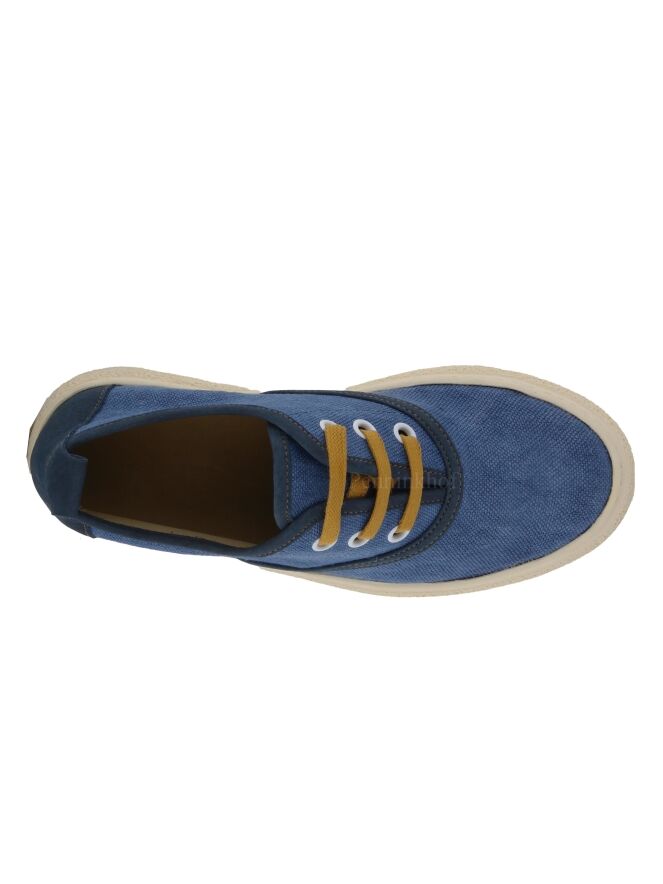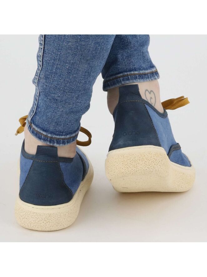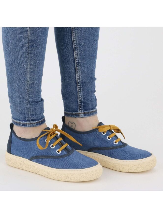 Chaussures de sport basses de la marque Arche, de couleur jean. Elles sont dotées d'une pièce de cuir bleu jean insérée dans le talon. La semelle est de couleur blanc crème et les lacets de couleur ocre. Ce modèle n'est pas doublé à l'intérieur.