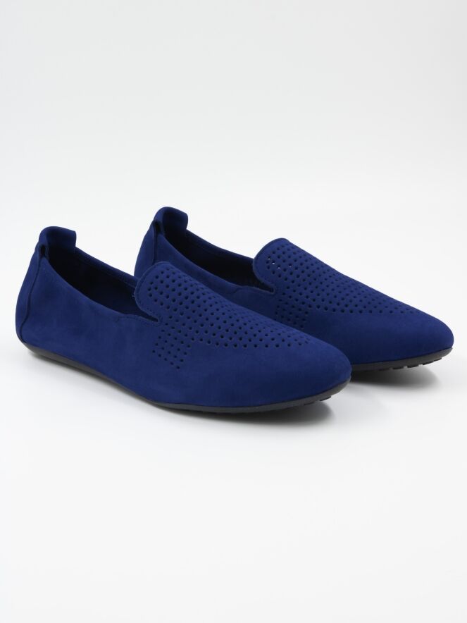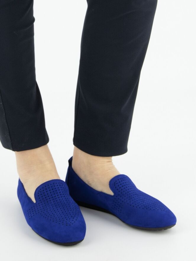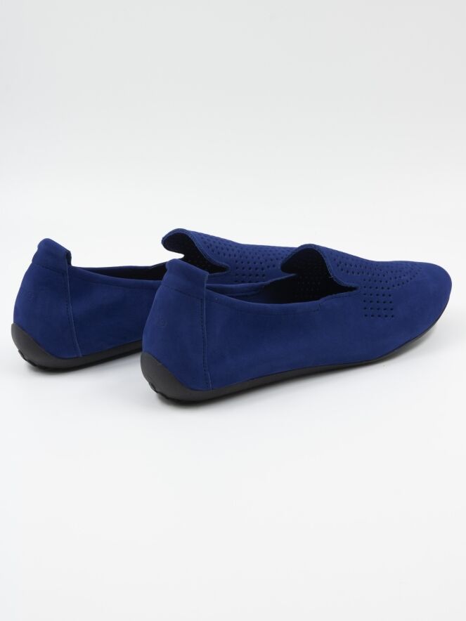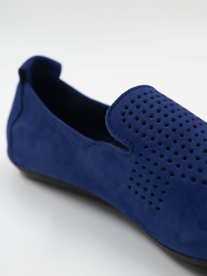 Une chaussure plate d'Arche en bleu cobalt. Le daim nubuck de l'avant-pied est finement perforé. La semelle est de couleur noire. L'intérieur n'est pas doublé.