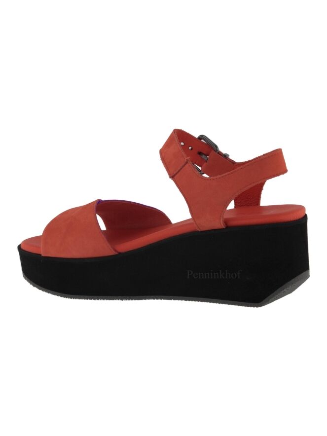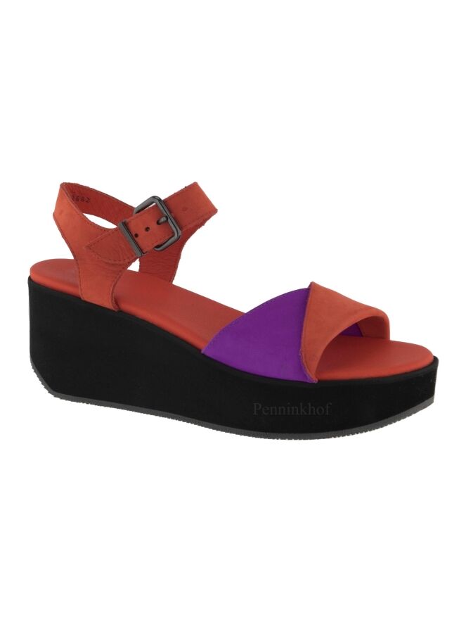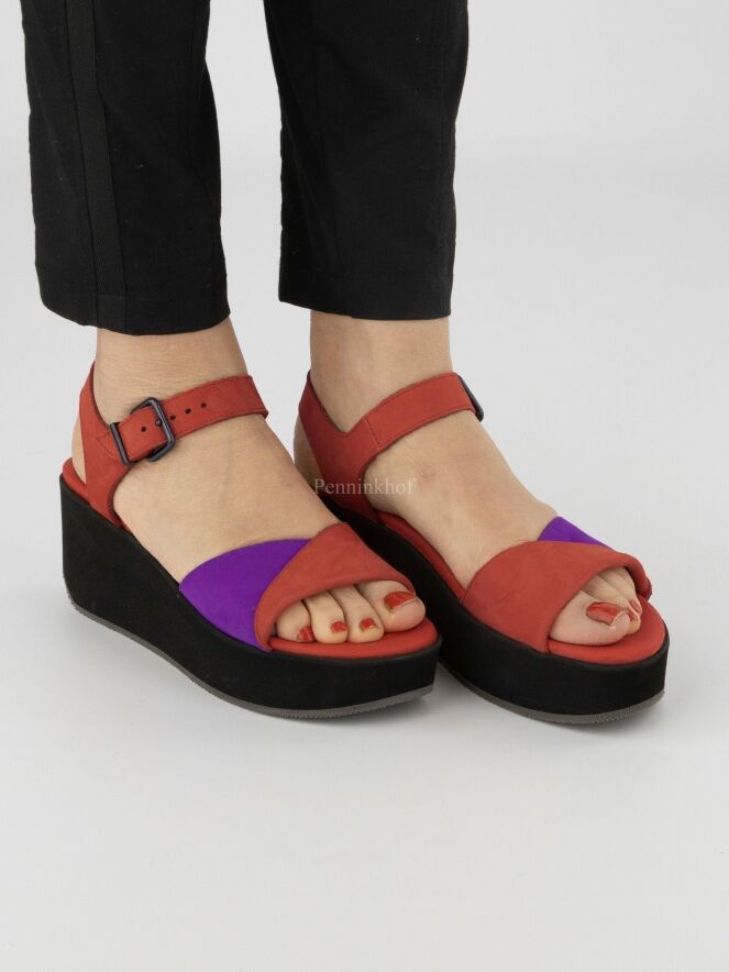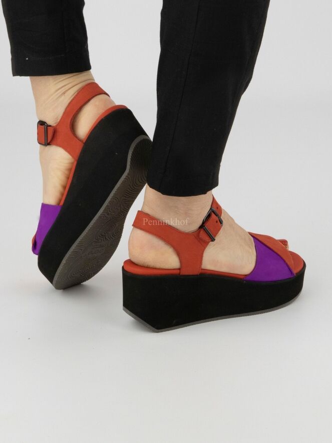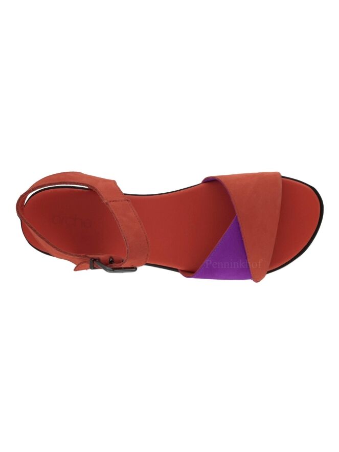 Sandale à semelle compensée de la marque Arche, de couleur orange avec une bande repliée de violet foncé. La bride du talon est réglable avec une boucle métallique en nickel. L'assise plantaire est de couleur orange.