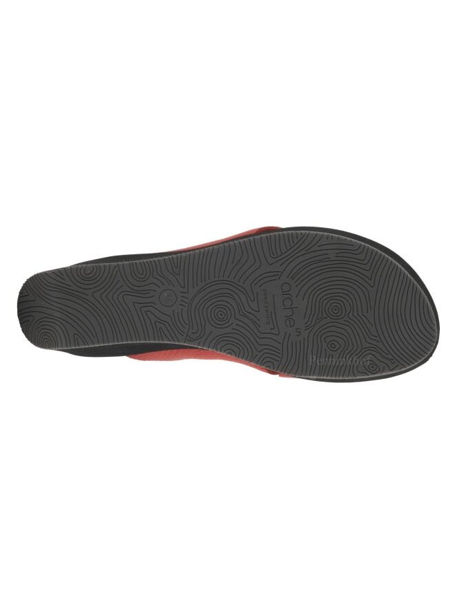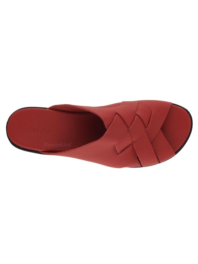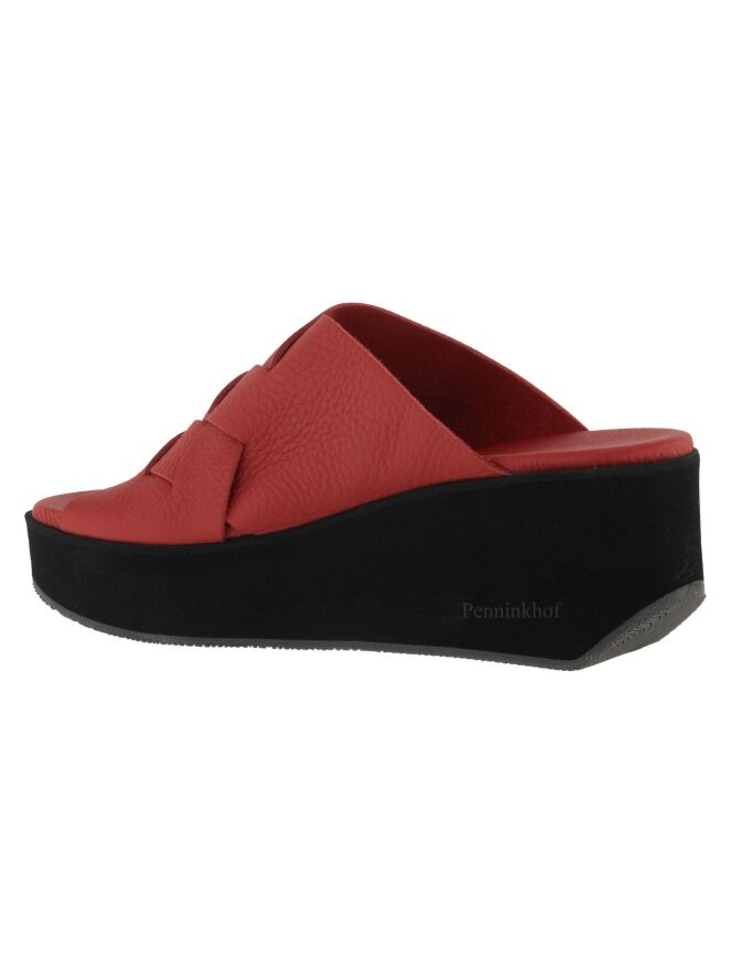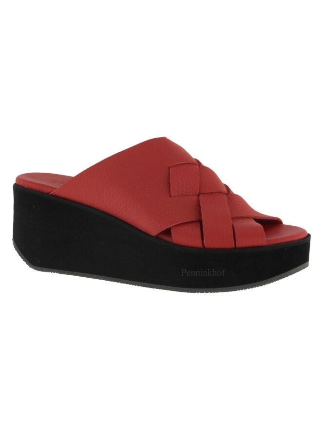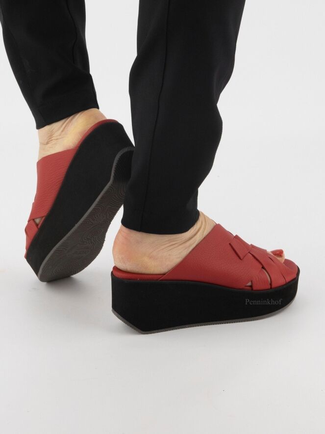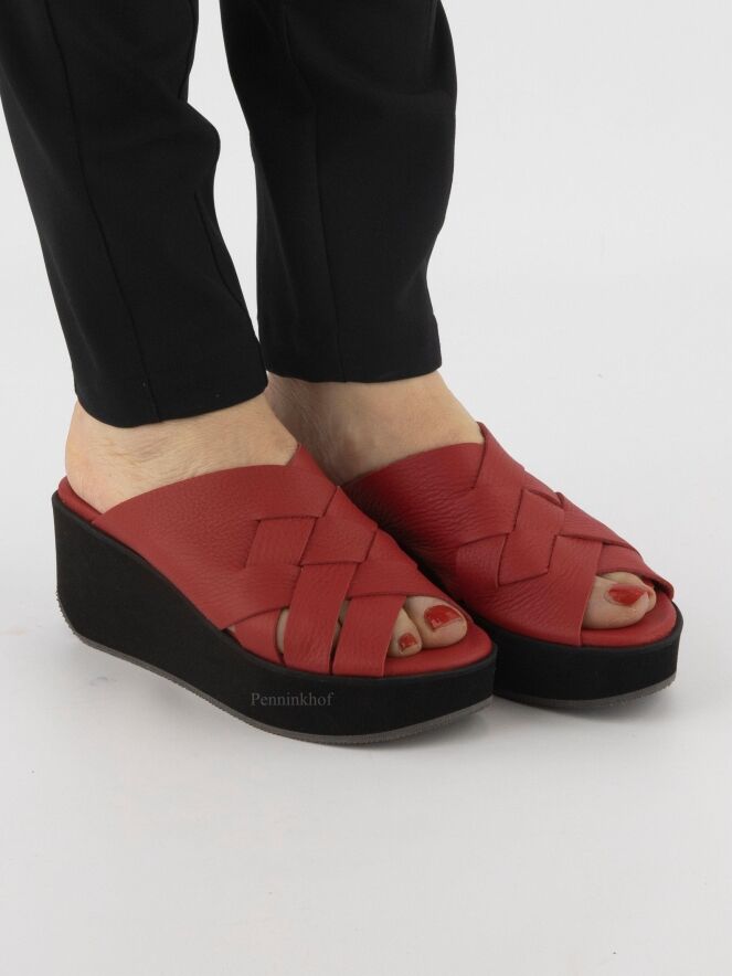 Sandale à semelle compensée de la marque Arche, de couleur rouge. Le cuir est tressé sur l'avant-pied. L'assise plantaire est de la même matière et de la même couleur que le cuir.