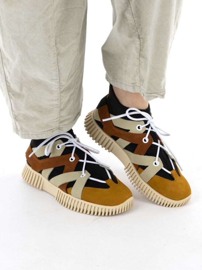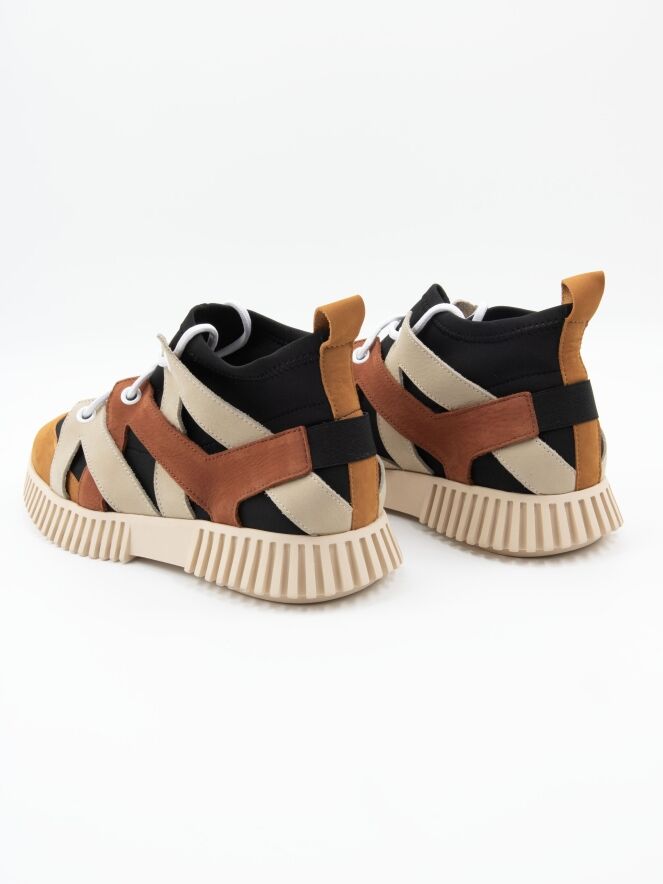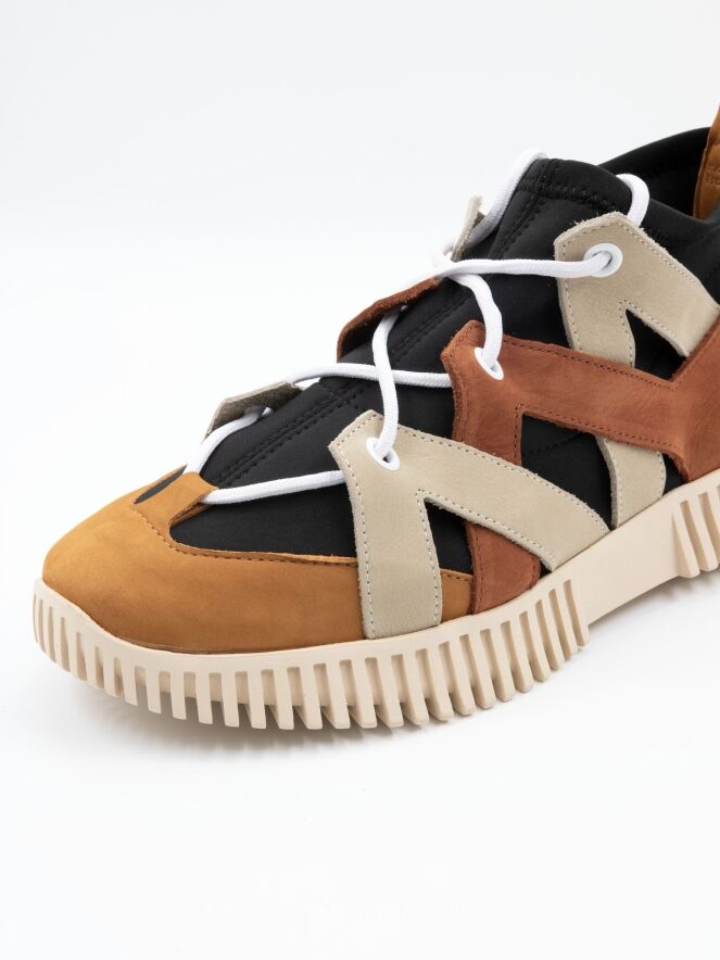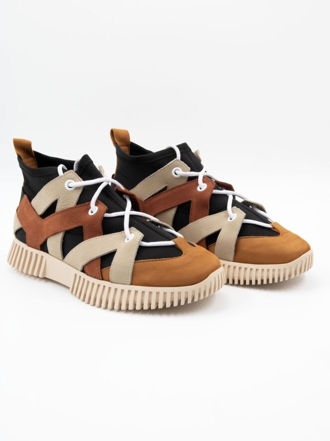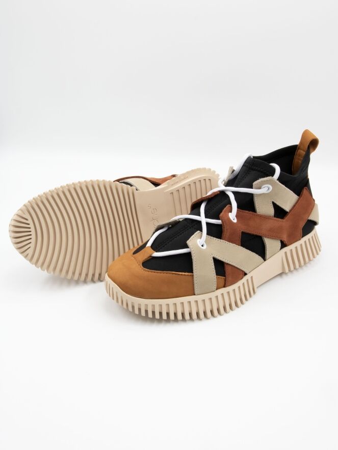Une sneaker design de la marque Arche en cuir, avec un chausson imperméable noir. Le cuir est travaillé en bandes diagonales dans les tons beige et cognac sur les côtés, avec un bout rond. À l’arrière, le cuir est relié par une bande élastique. La semelle écrue est nervurée.