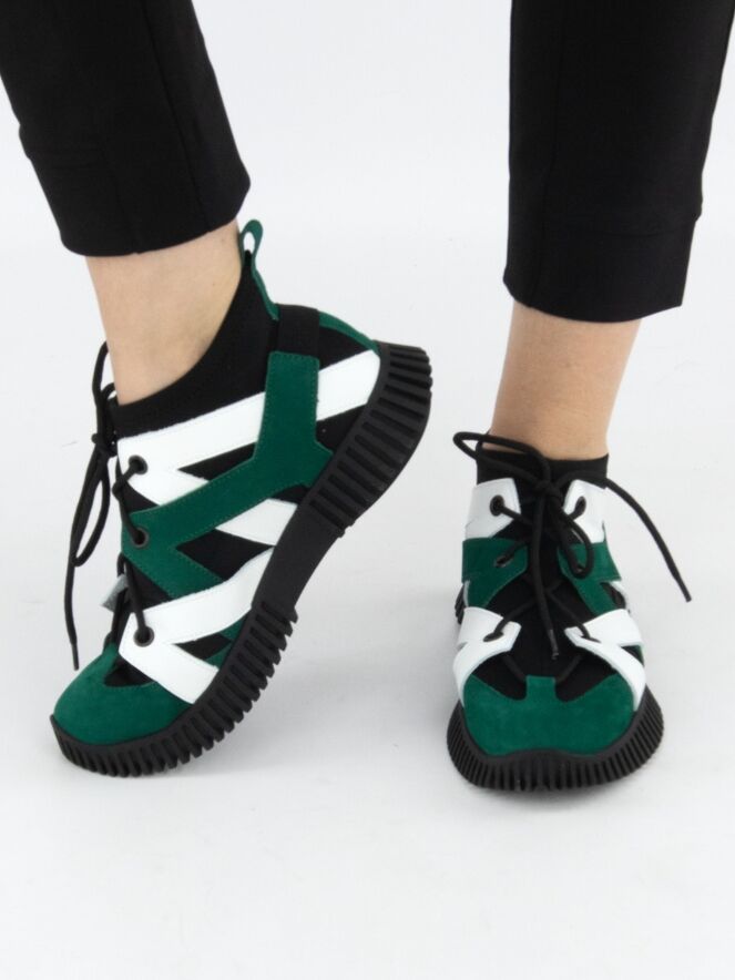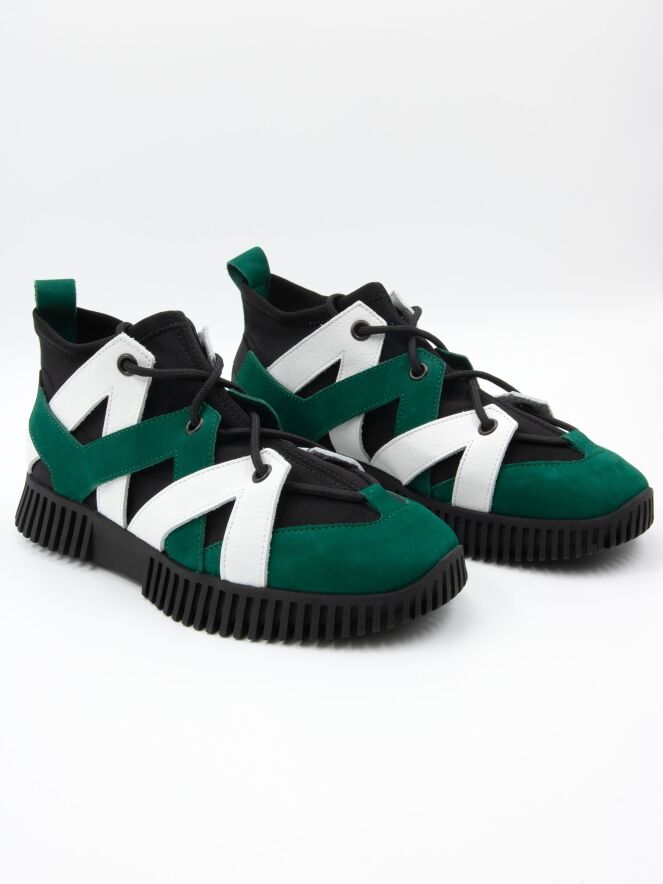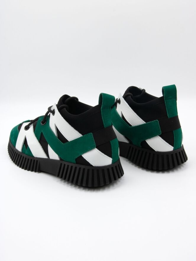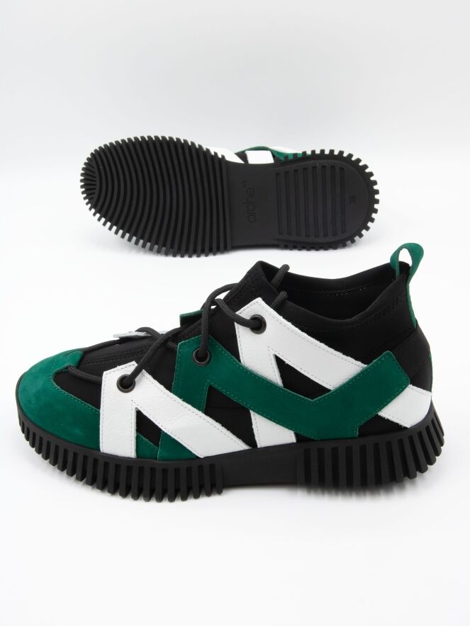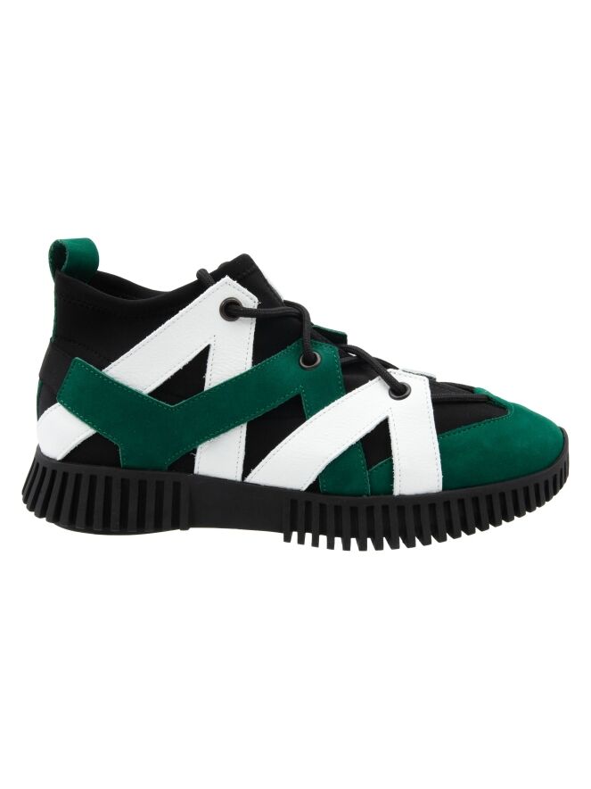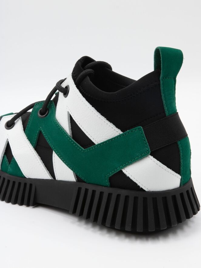 Une sneaker design d'Arche en cuir avec une chaussette imperméable en noir. Le cuir est en blanc et vert avec des bandes diagonales sur les côtés et un bout rond. Le cuir à l'arrière est fixé avec une bande élastique. La semelle noire est nervurée.