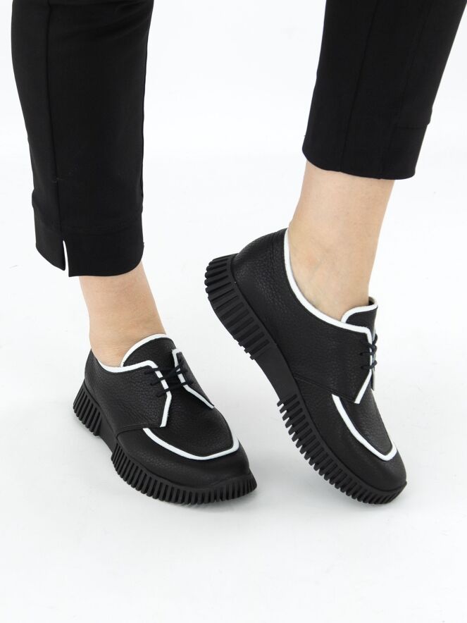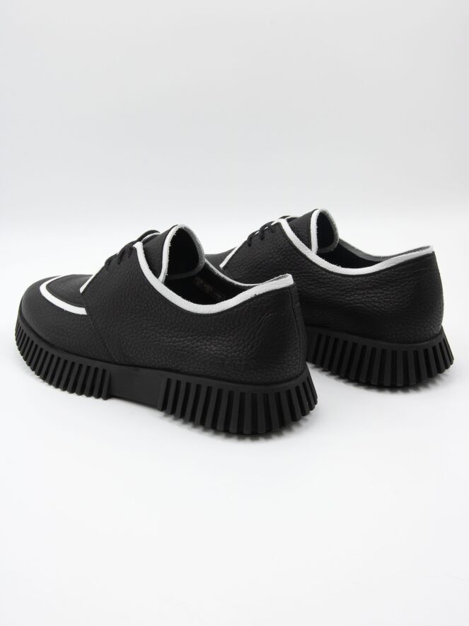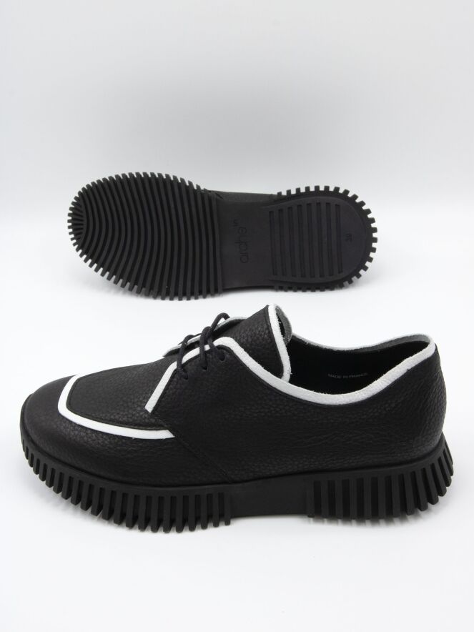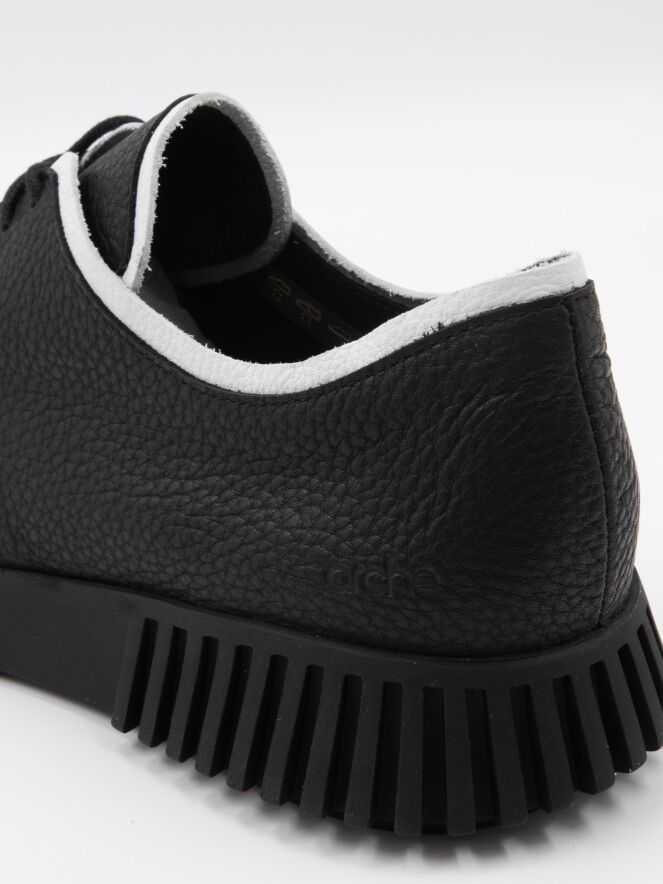 Une chaussure à lacets d'Arche sur une semelle plateforme dont les côtés sont dentelés. La chaussure est en noir. Le long du bord de l'avant-pied et du bord de la tige jusqu'aux lacets, il y a un liseré blanc. La chaussure est non doublée.
