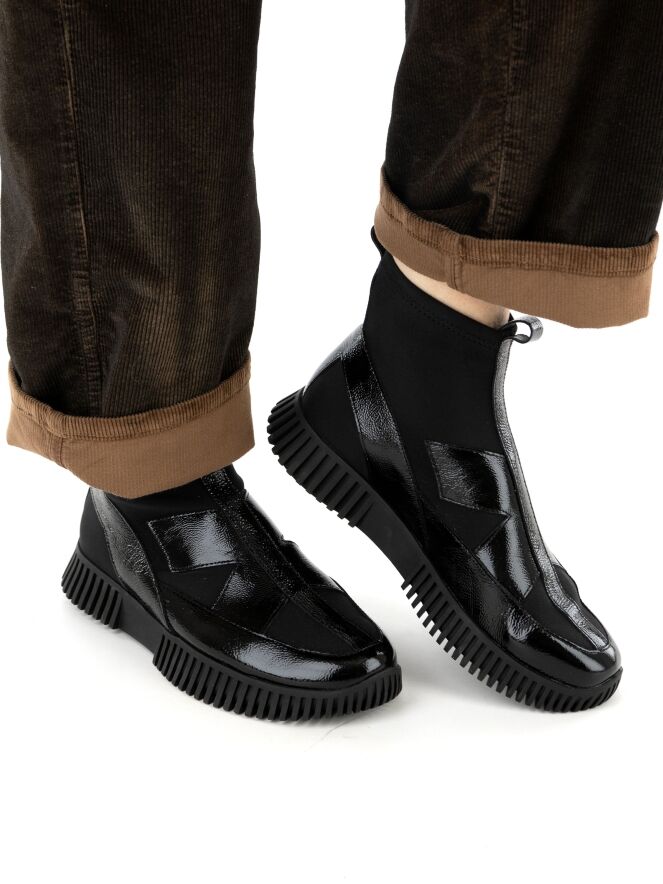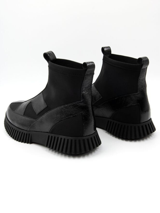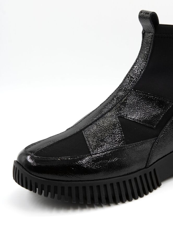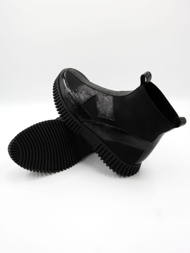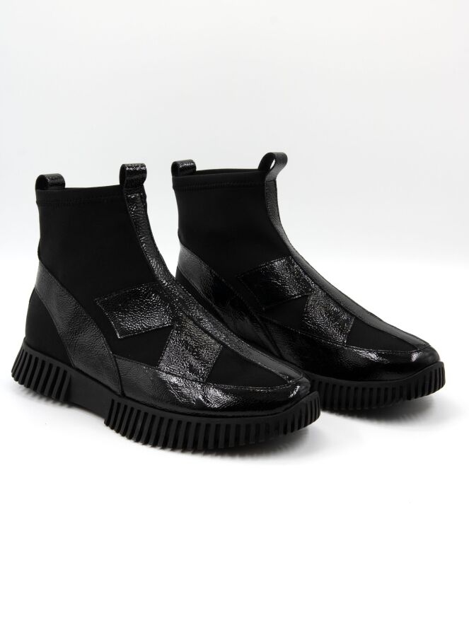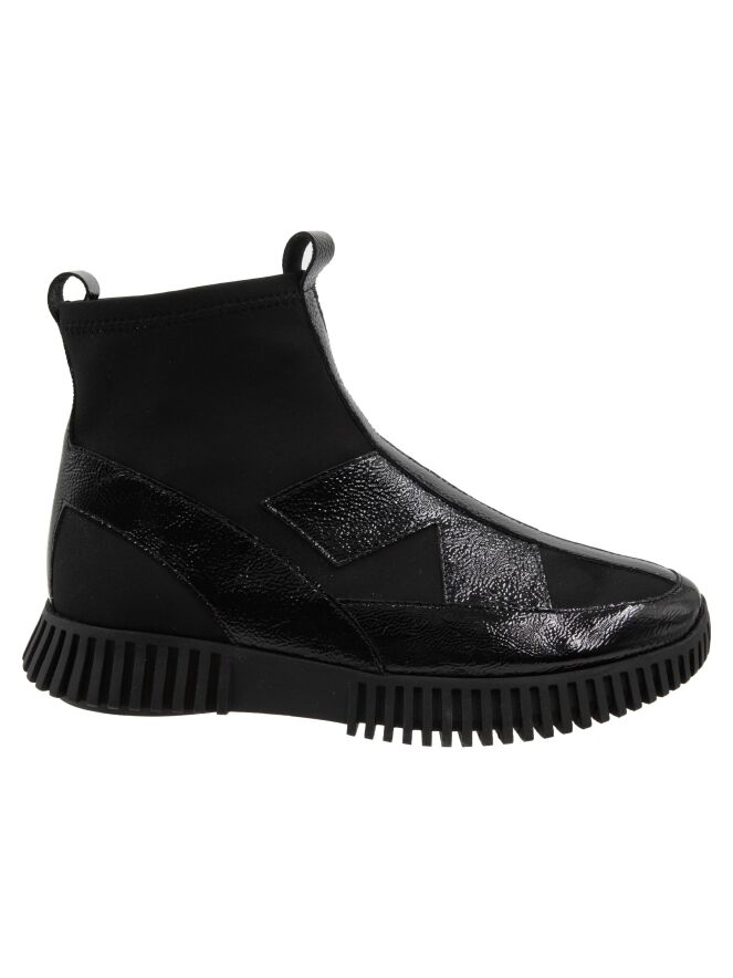Sneaker montante design de la marque Arche en cuir verni froissé avec un élastique noir. La semelle noire est finement crantée en lignes droites.