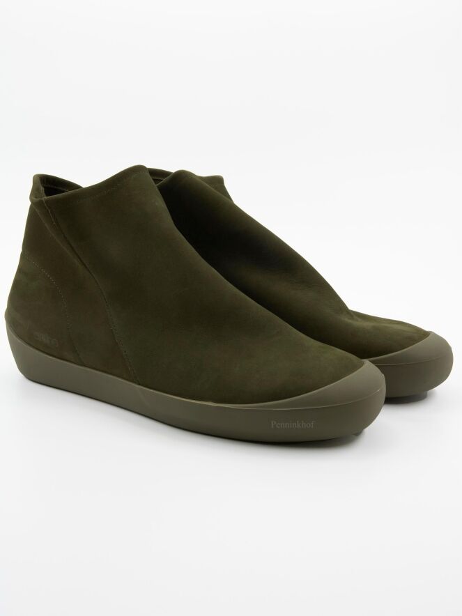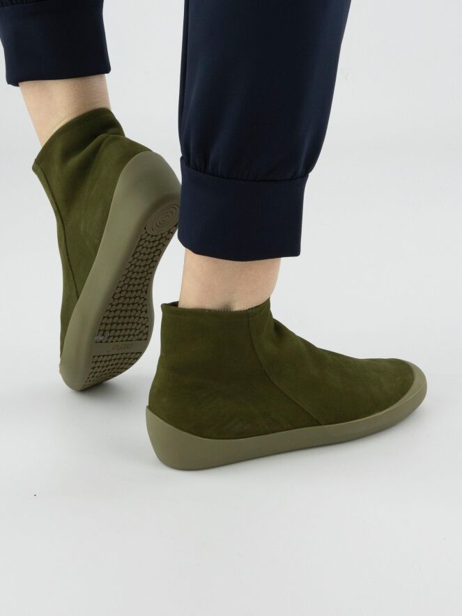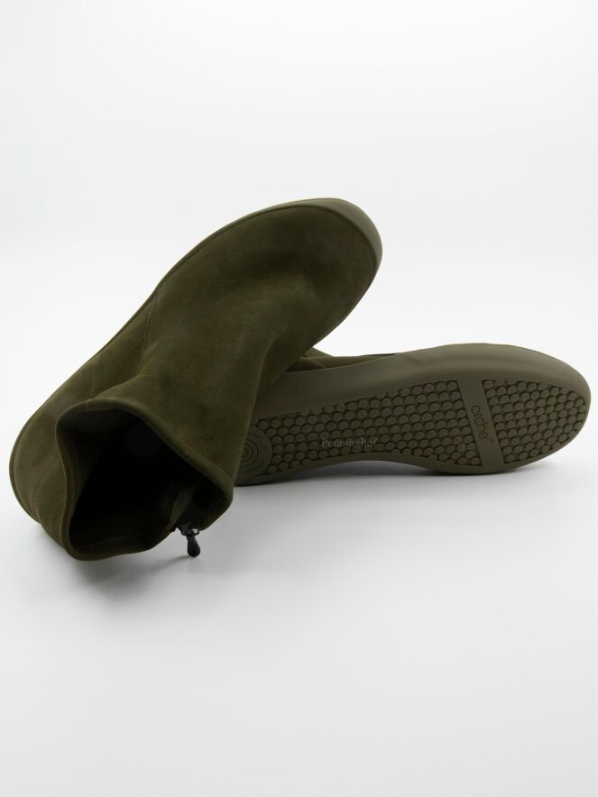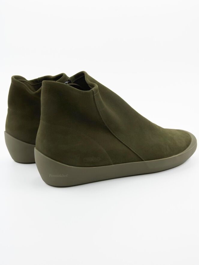 Une bottine courte de Arche en vert olive. Une fermeture éclair se trouve à l'intérieur de la tige. La semelle est de couleur vert olive pastel. L'intérieur n'est pas doublé.