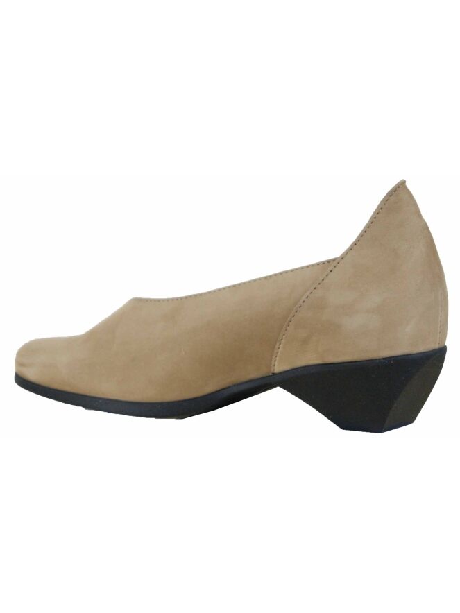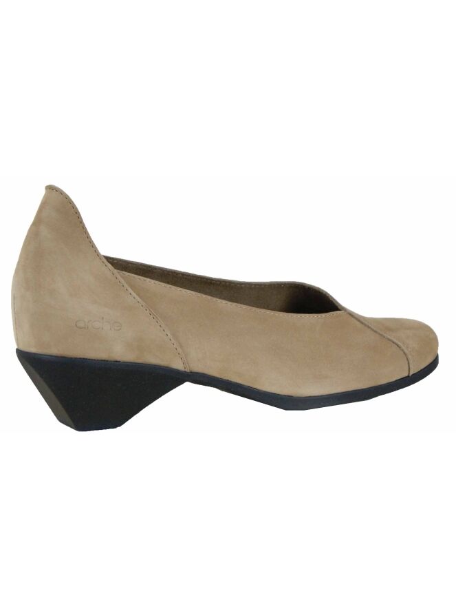Chaussure de la marque Arche de couleur sable. Son joli nez arrondi est accidenté d'un côté par une couture diagonale cousue sur le côté extérieur. Ce détail est repris sur le talon. L'intérieur n'est pas doublé.