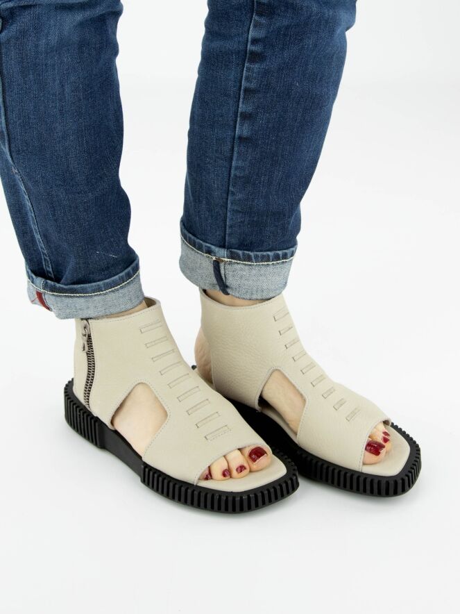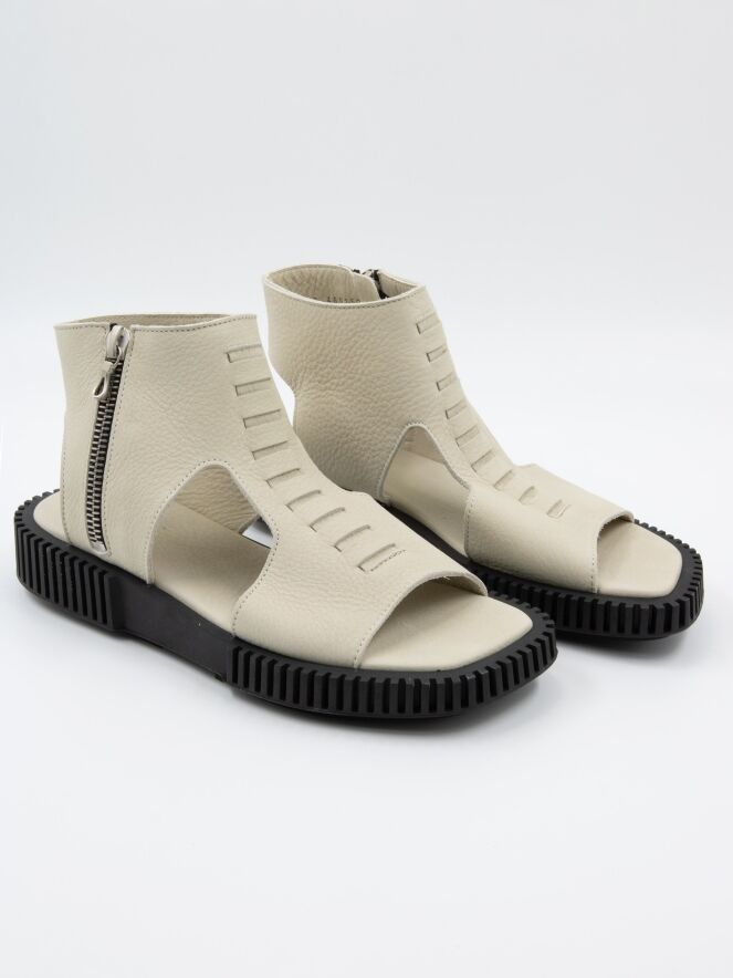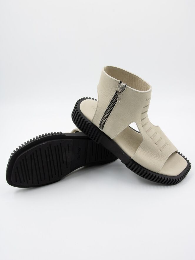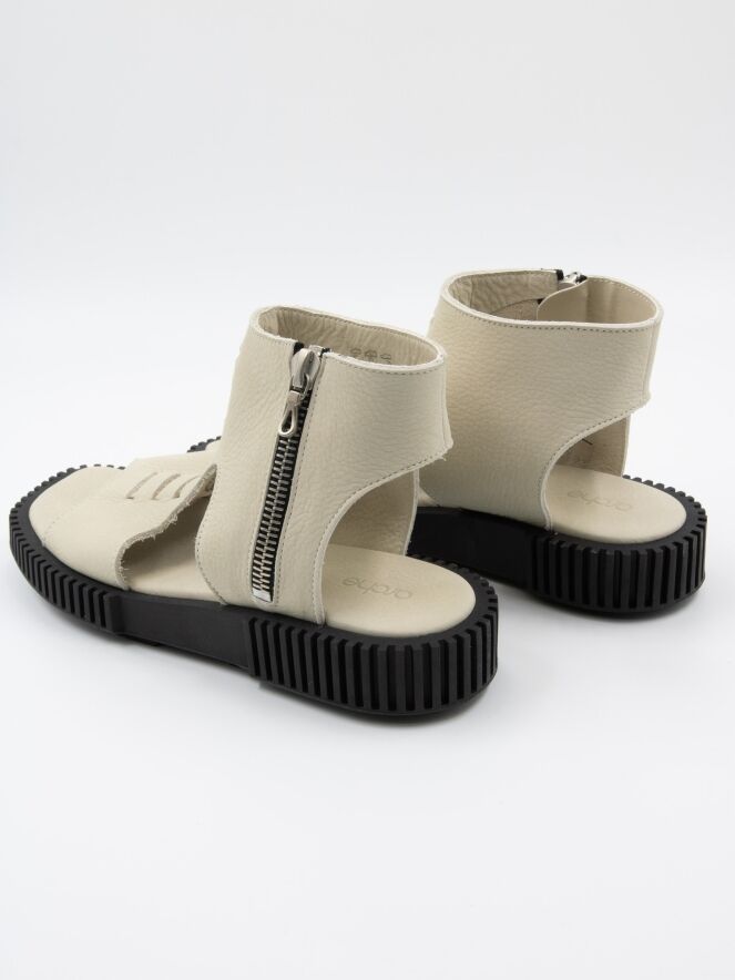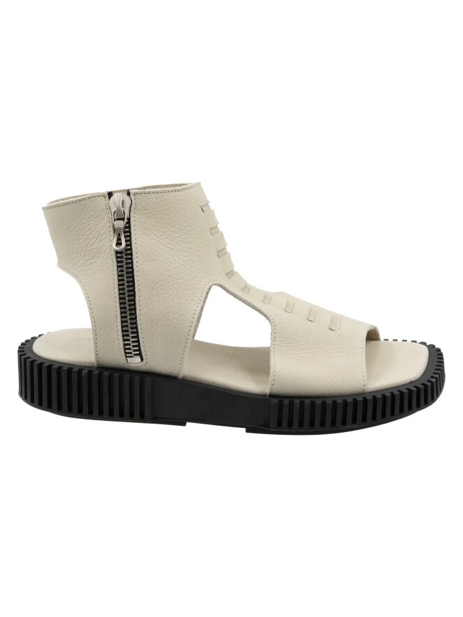 Une sandale d'Arche en blanc crème. La sandale présente des ouvertures en forme de rayures sur le milieu de l'avant-pied, traversées par une bande de cuir. Un zip argenté se trouve sur le côté extérieur. La sandale a un talon ouvert et le bord de la semelle est nervuré.
