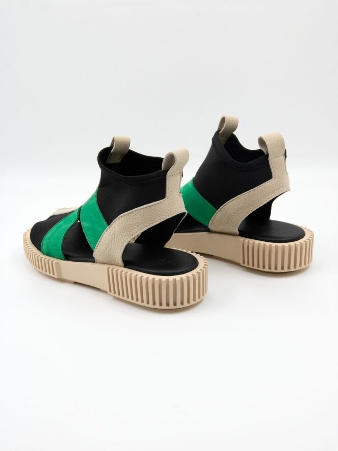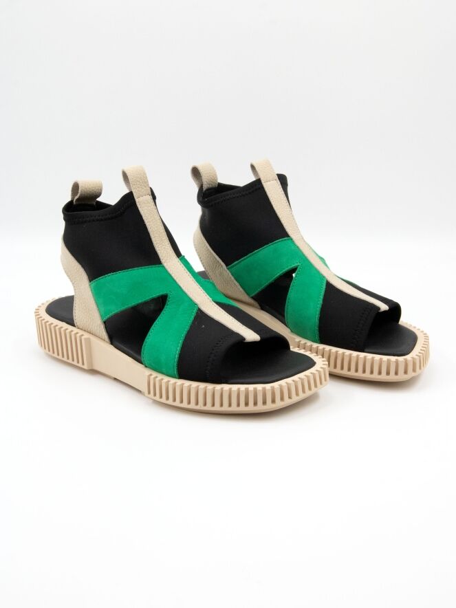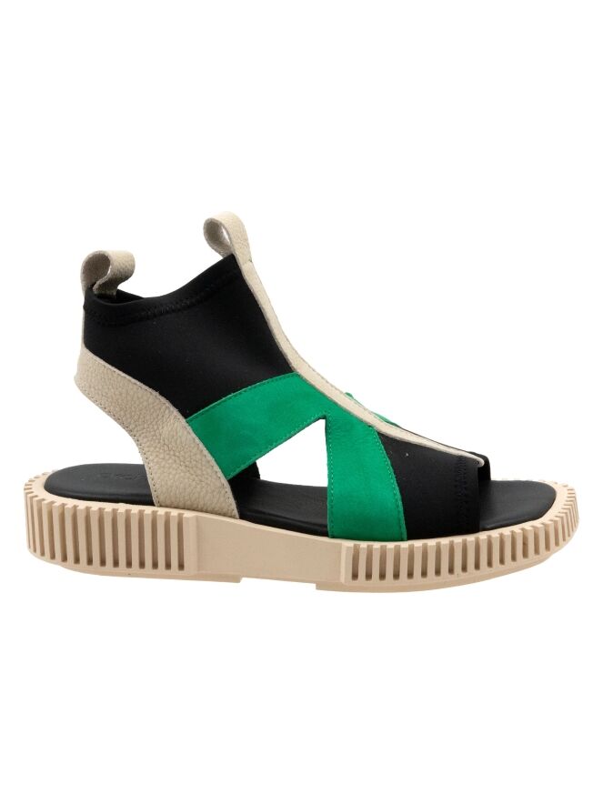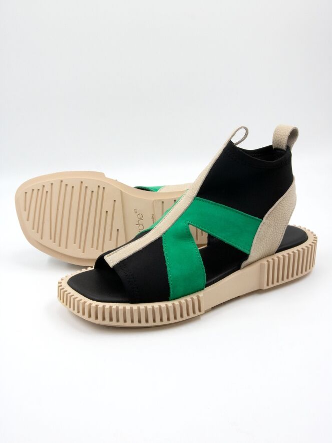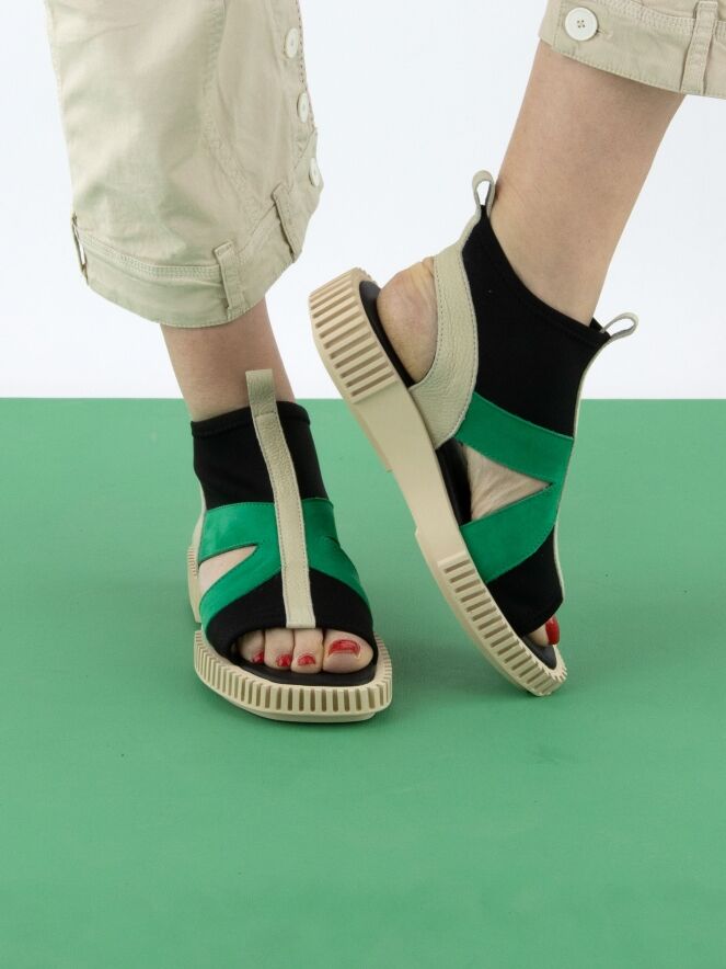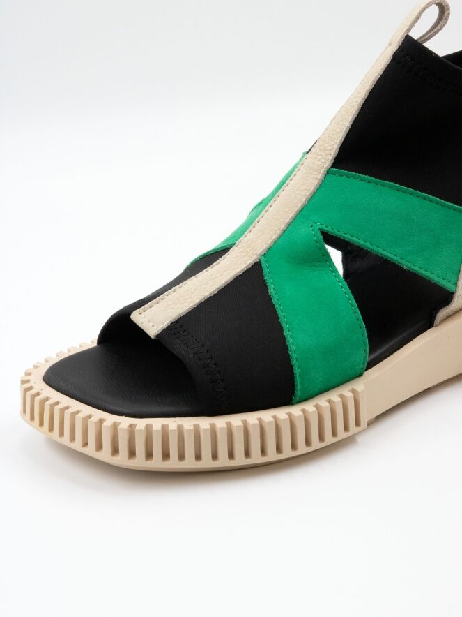 Une sandale d'Arche à talon ouvert, réalisée dans une combinaison de tissu élastique, cuir et nubuck dans les couleurs noir, vert et blanc cassé. La semelle blanc cassé est finement crantée. La semelle intérieure en cuir est noire.