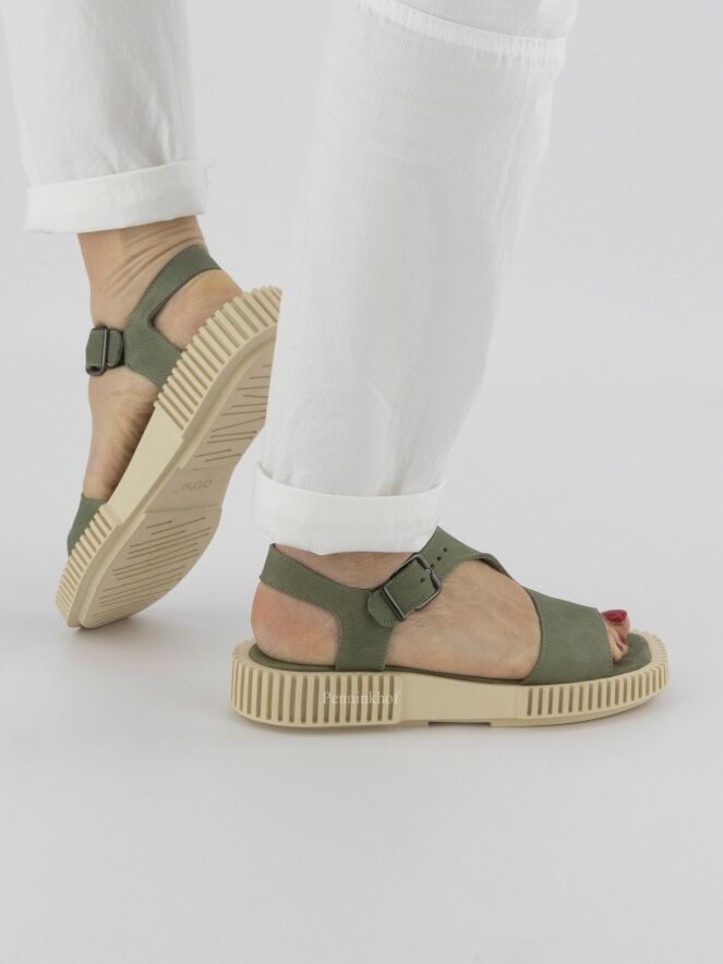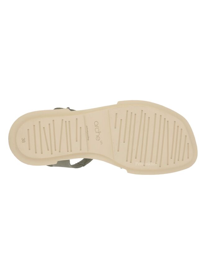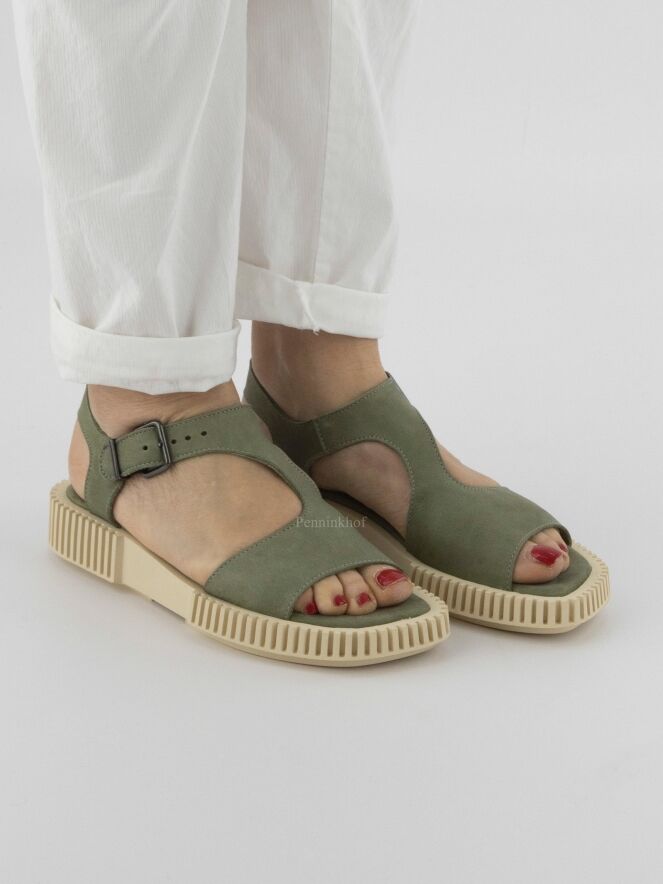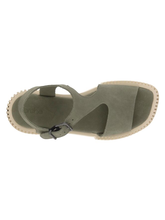 Sandale ouverte de la marque Arche, en nubuck de couleur vert olive. La sangle sur l'avant-pied est réglable avec une boucle au niveau de la cheville. La semelle blanc crème est striée sur sa hauteur.